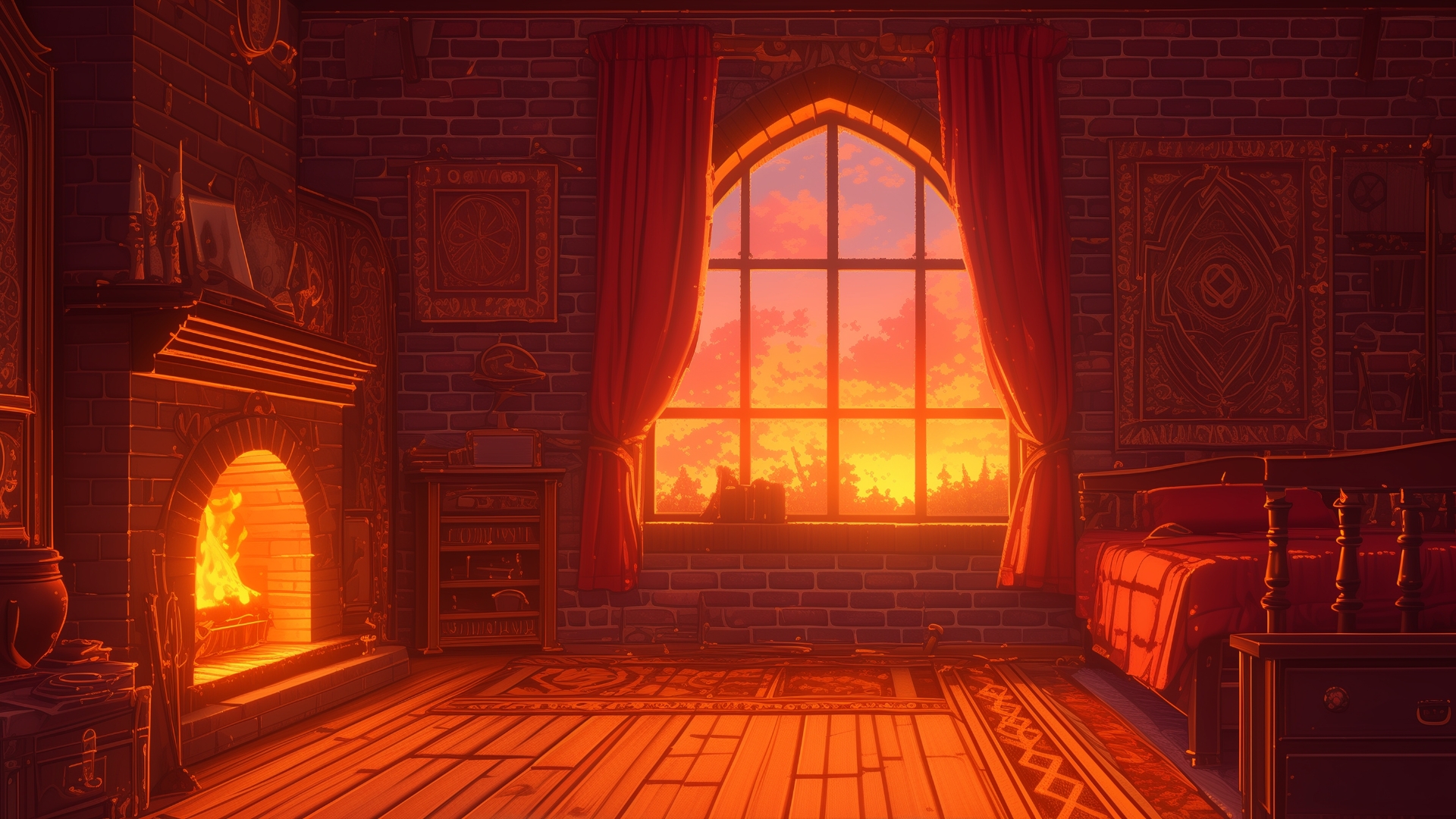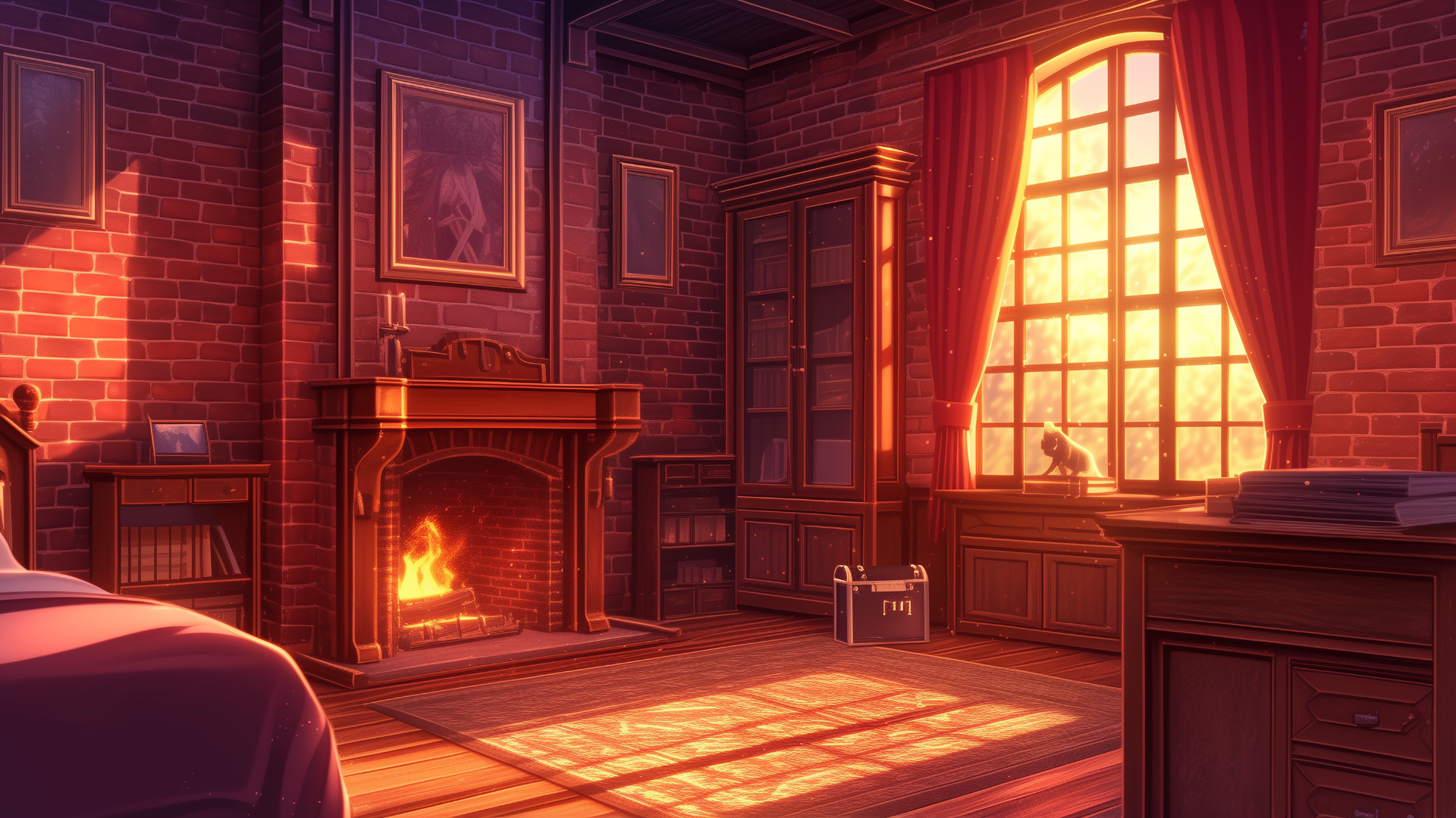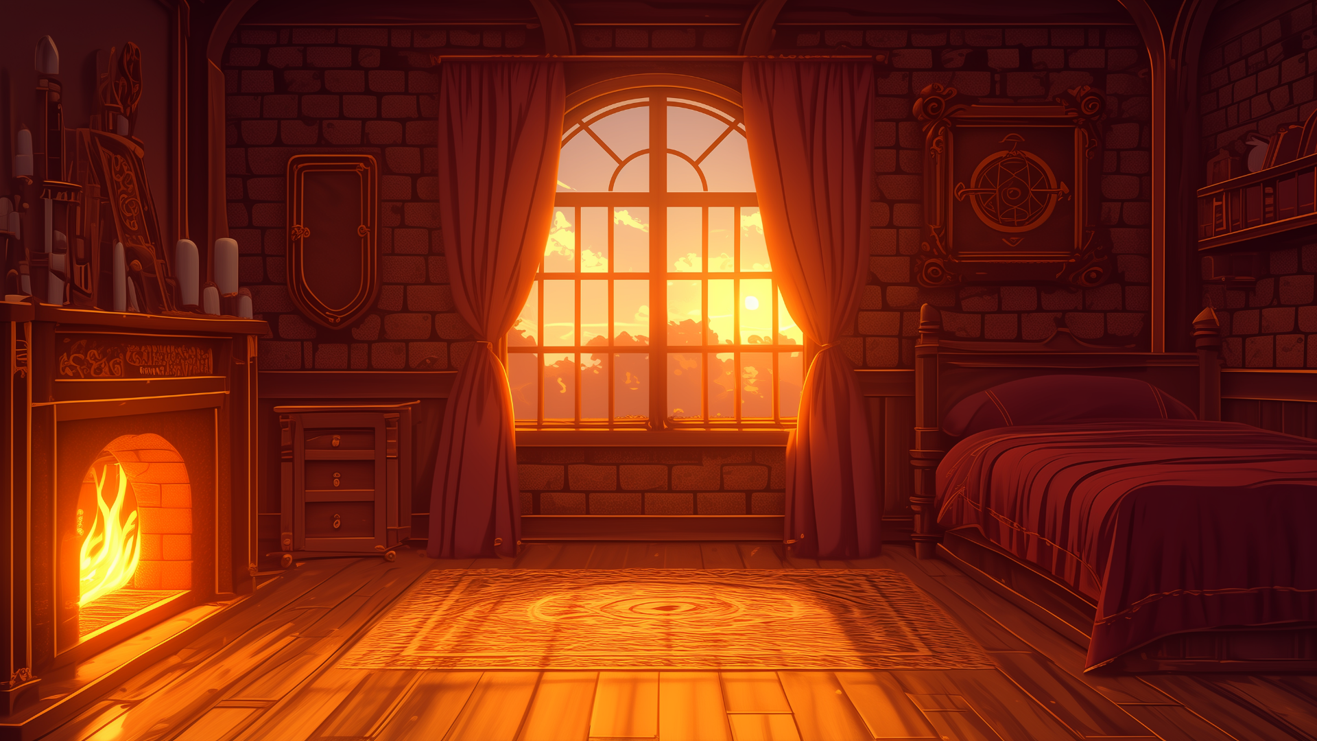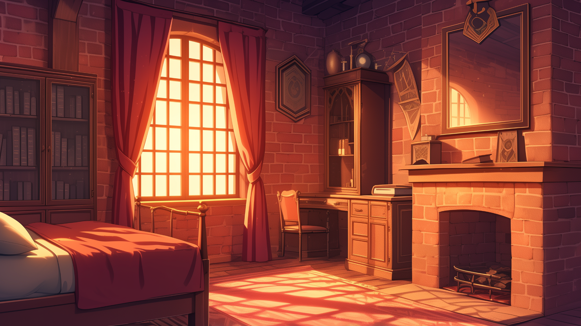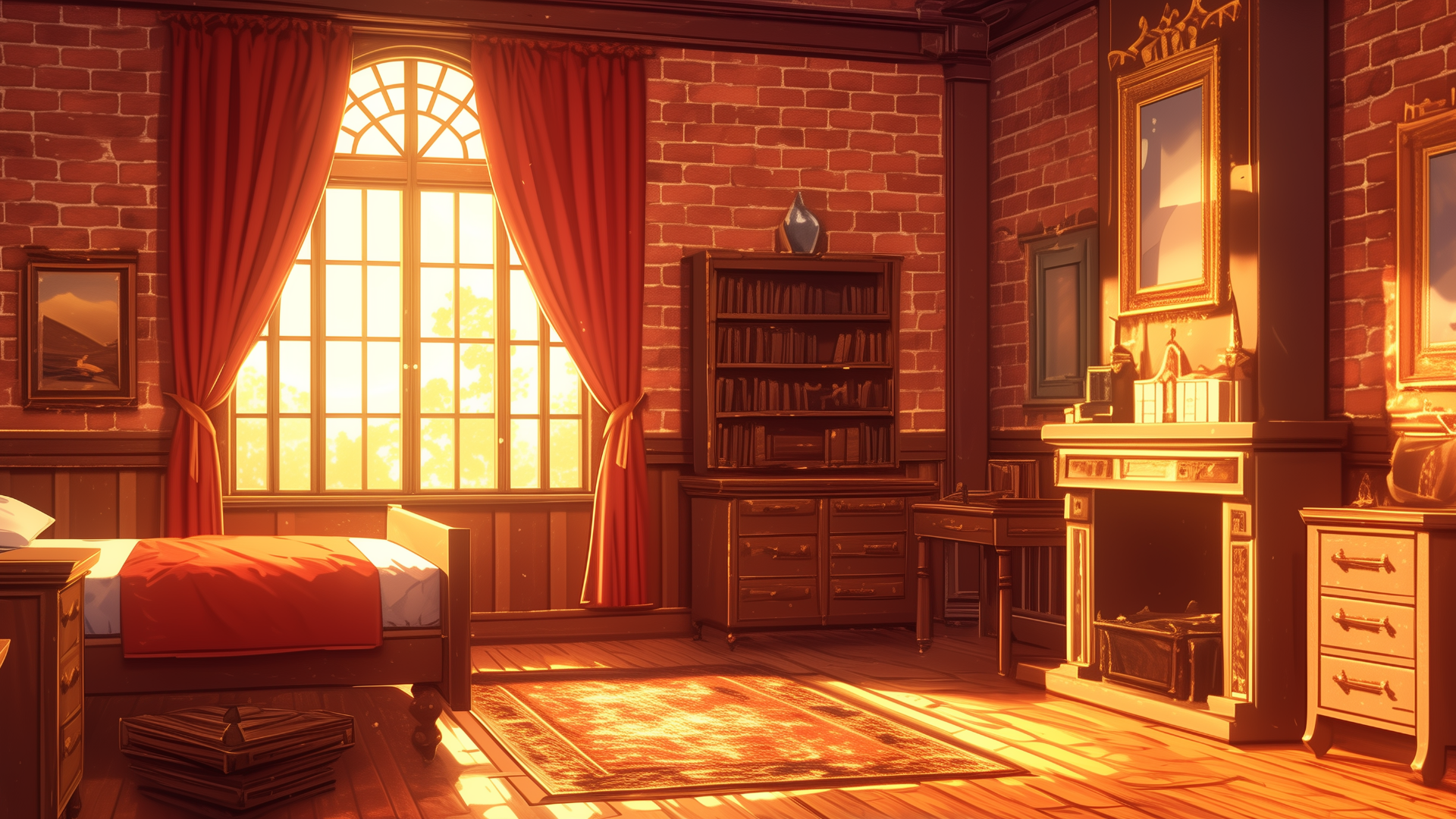 赤レンガ造りの壁と深紅のカーテンが印象的な炎属性の部屋。夕日が差し込むことで、空間全体が暖かな輝きに包まれている。魔法生徒の私室や、日常パートのシーン演出にぴったりな背景素材。