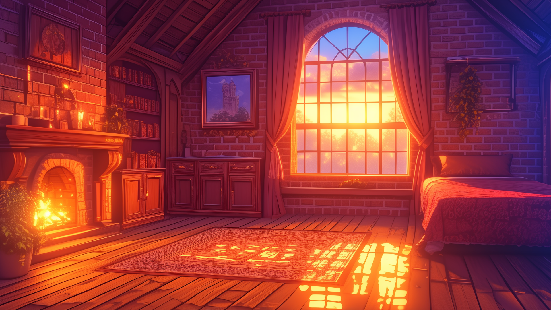 屋根裏のような構造が特徴的な、夕焼け色に染まる魔法寮の1人部屋。暖炉の炎と煉瓦の壁が、穏やかな時間の流れを感じさせる。回想や感傷的な展開に活かせる、ファンタジーTRPG向けの背景素材。