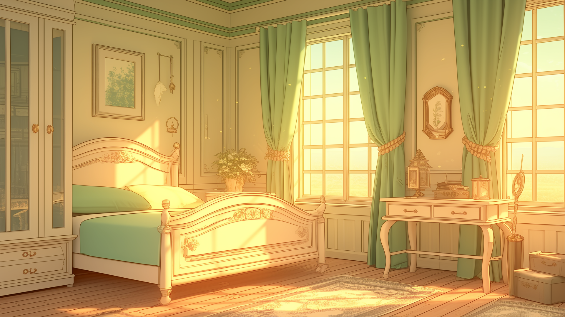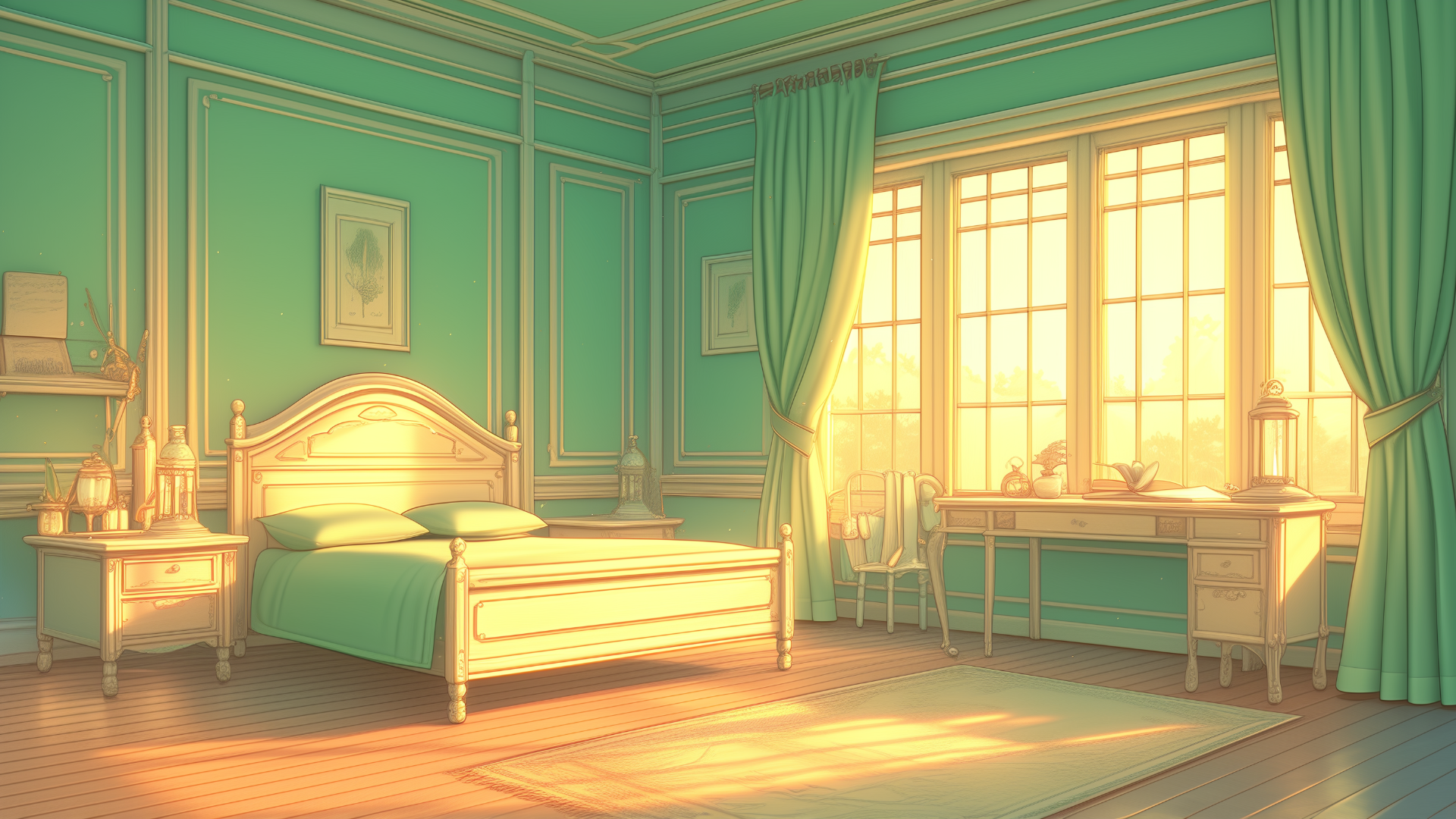 クラシカルな家具とエメラルドグリーンの壁が印象的な、穏やかな室内風景。 外の自然と調和するように差し込む光が、空間に柔らかな彩りを添えている。 風属性の魔法学生の部屋や、落ち着いた夕暮れの語り場として活用できる背景素材。
