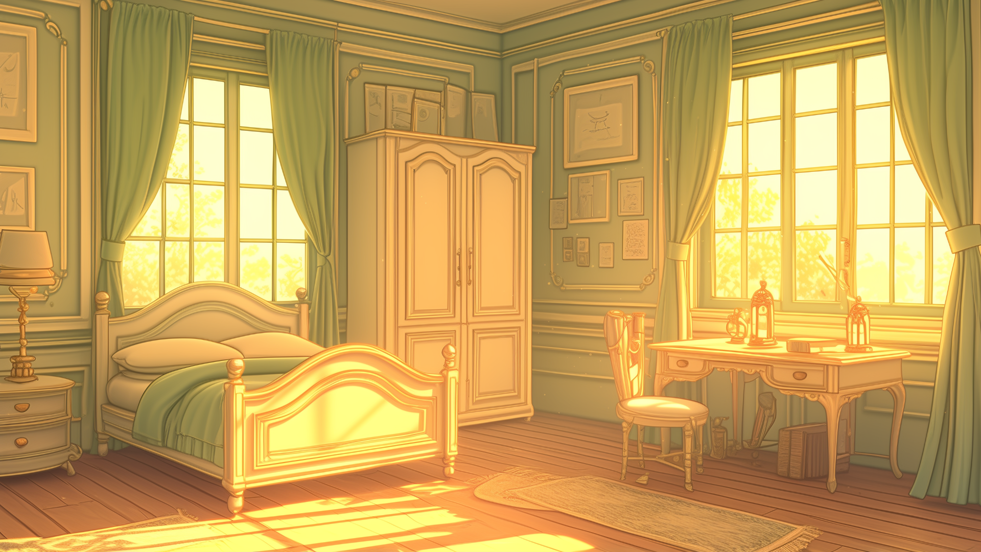 クラシカルな壁面と高い窓に囲まれた、洗練された雰囲気の寮の個室。 夕日が差し込み、ベッドや床に長く伸びる影が幻想的な印象を与えている。 風の精霊との対話やひとときの休息を描くシーンに適したTRPG背景画像。
