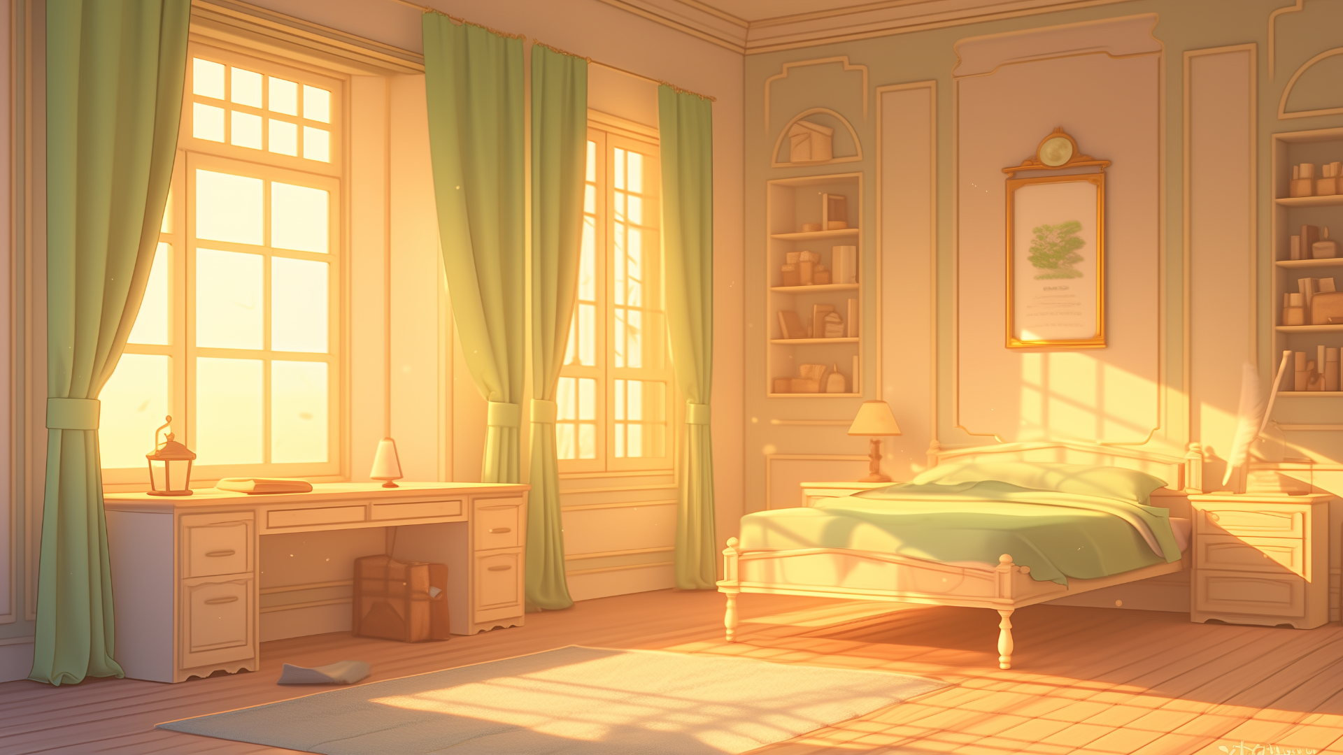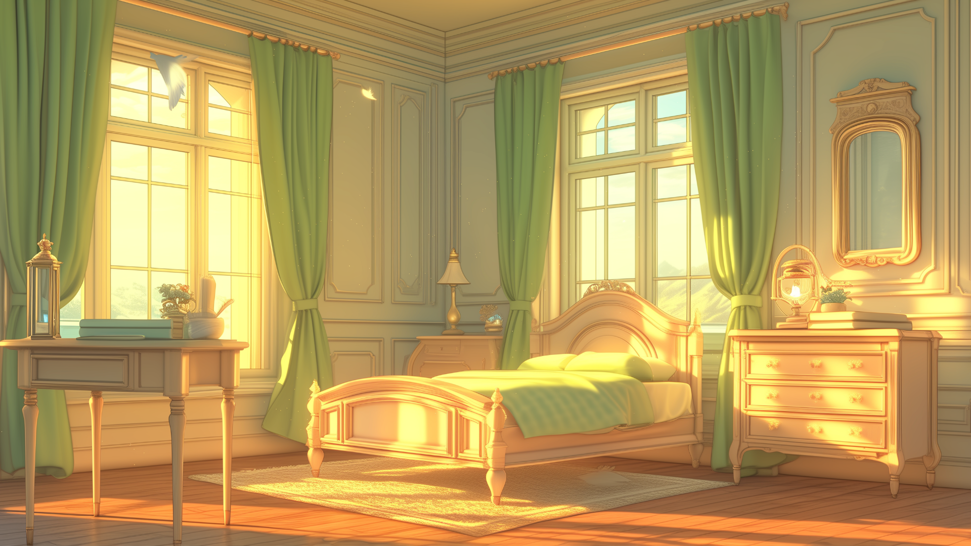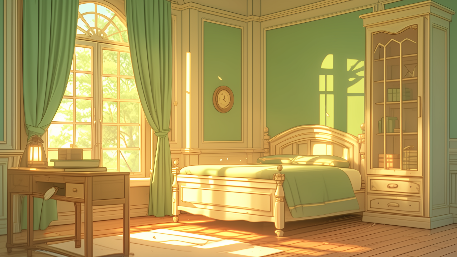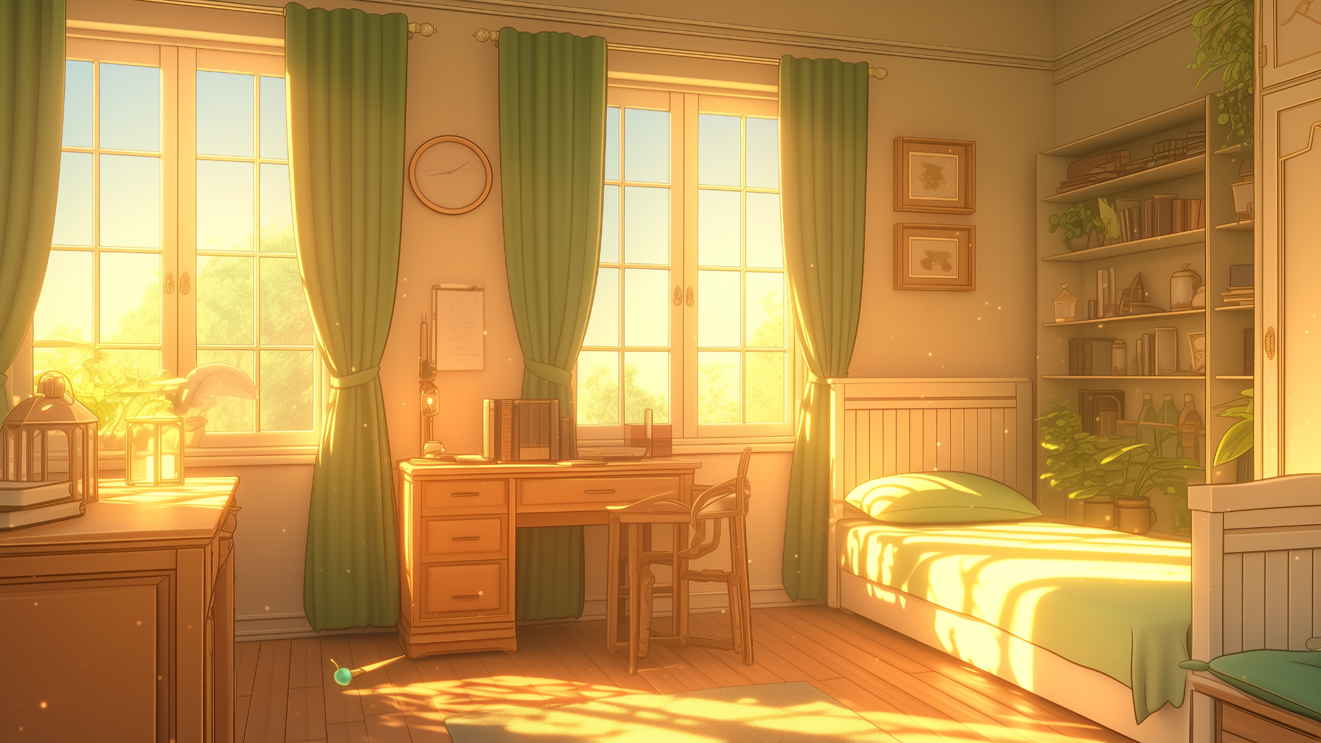 緑と金を基調とした風通しの良い明るい寮の1人部屋。窓の外から柔らかい夕陽が差し込み、優しい空気が流れている。風の魔法使いが住む部屋を表現したいTRPGシーンにぴったりの背景素材。