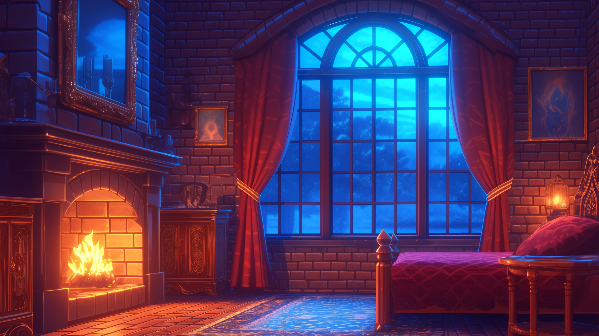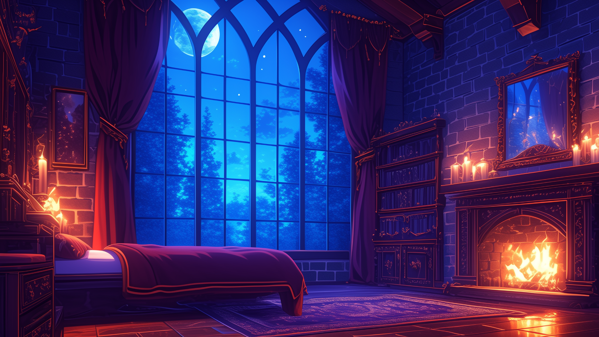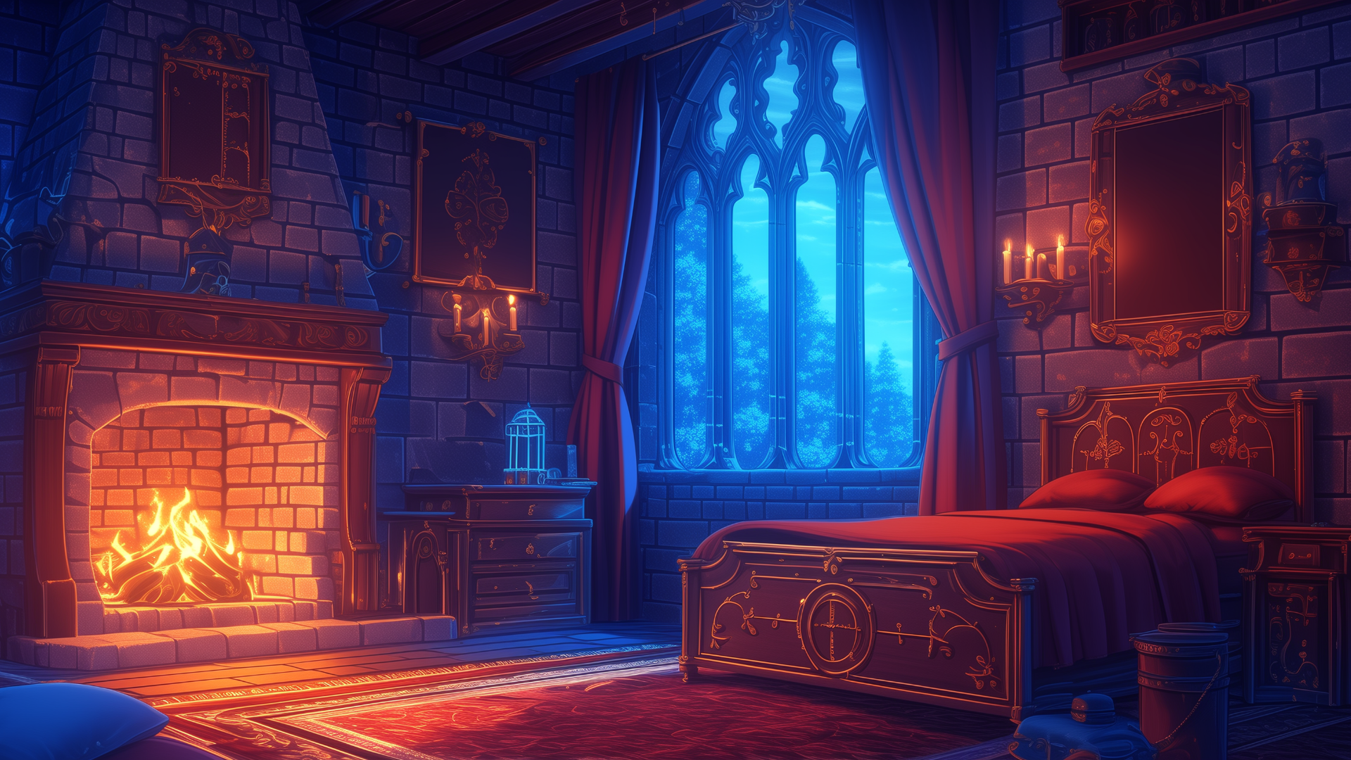 magic-school, dormitory, fire-element, fireplace, single-room, bedroom, night