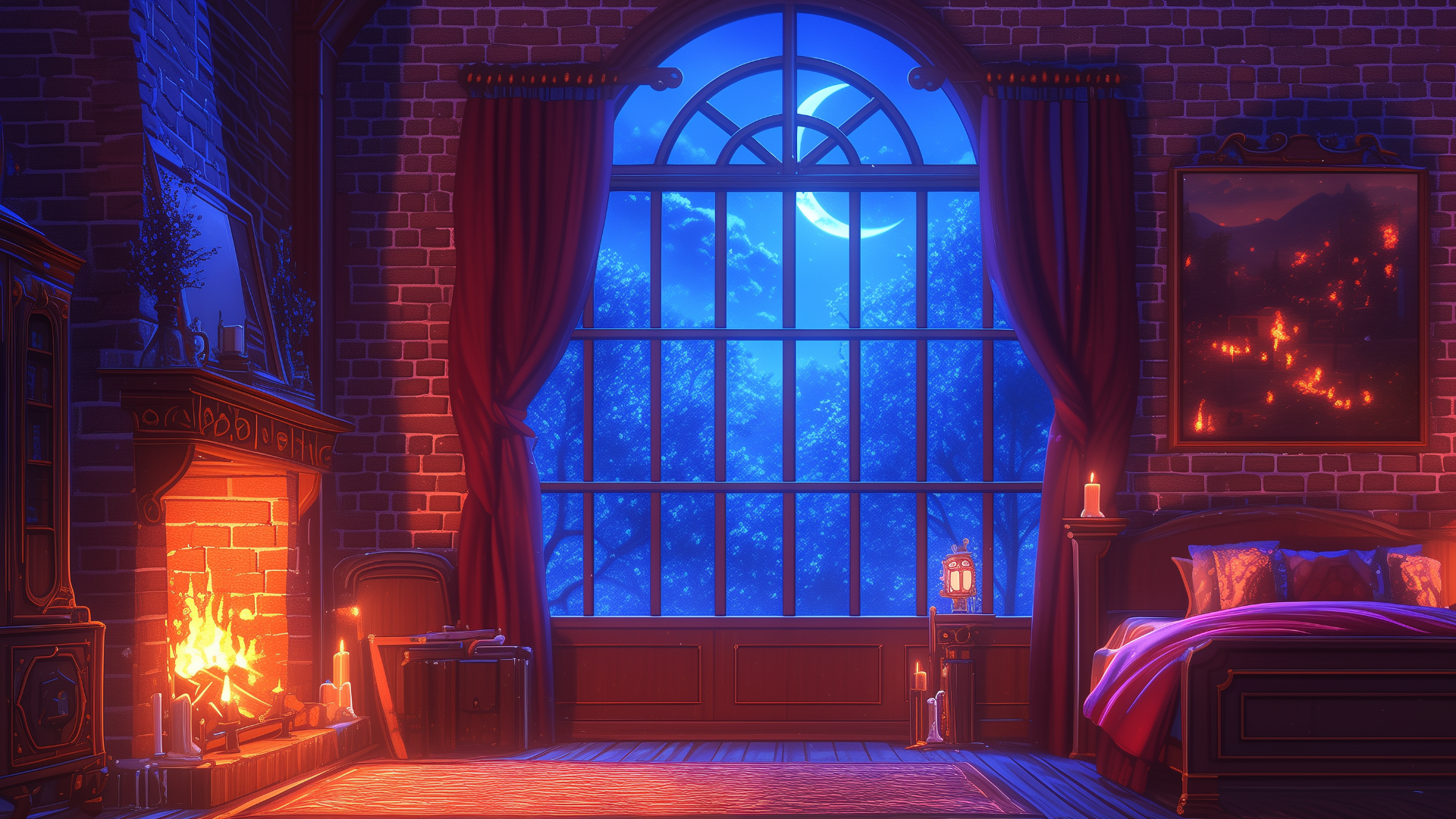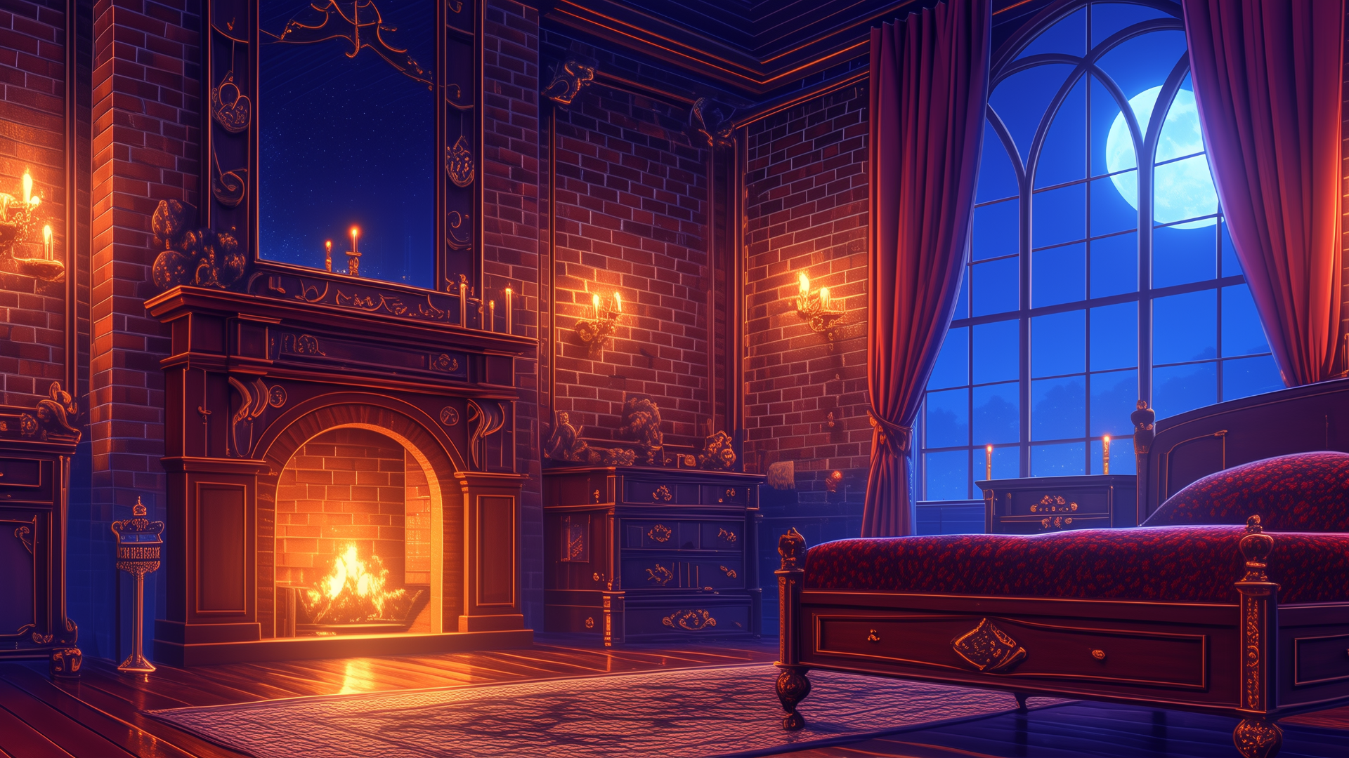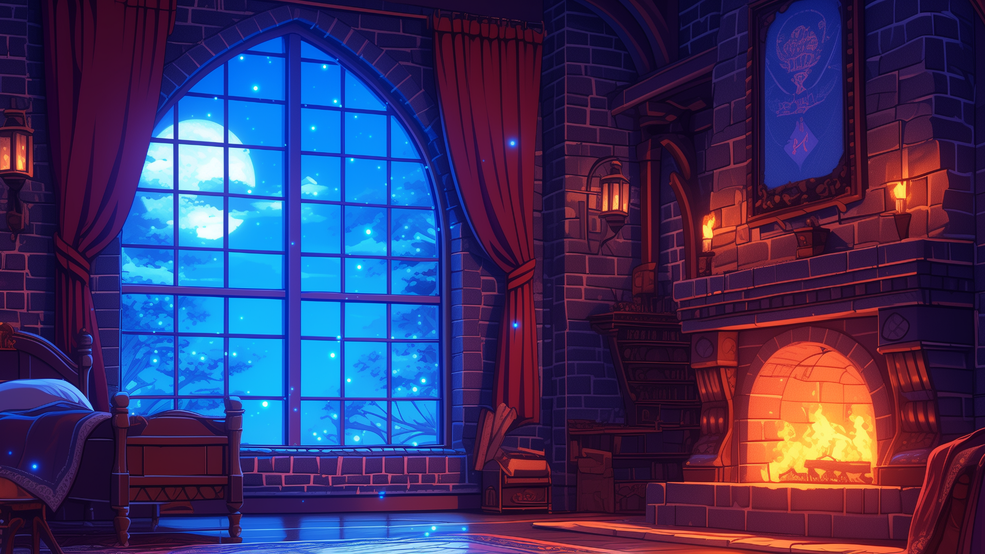 magic-school, dormitory, fire-element, fireplace, single-room, bedroom, night