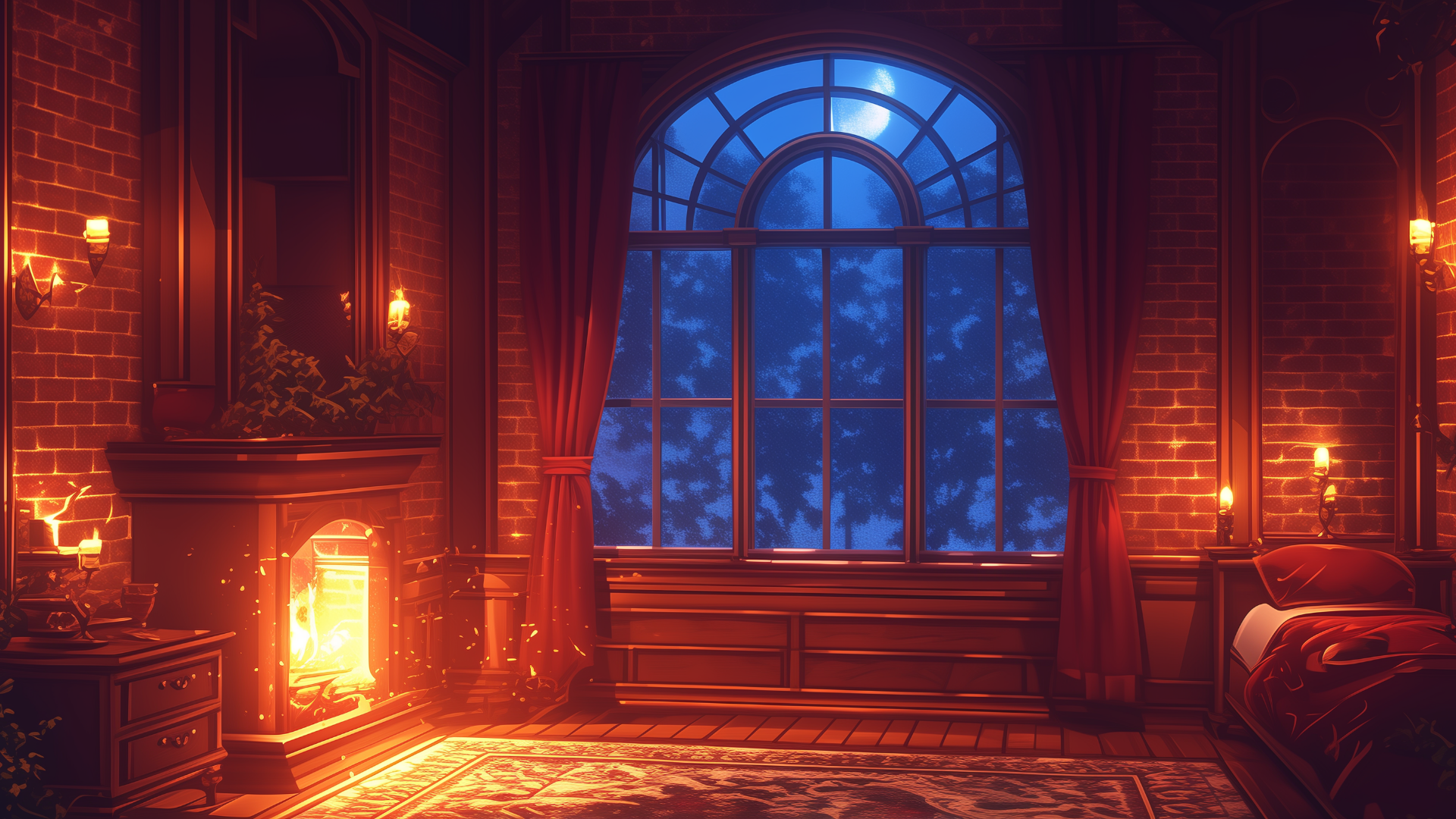 魔法学校, 寮, 炎属性, 暖炉, 1人部屋, 寝室, 夜
