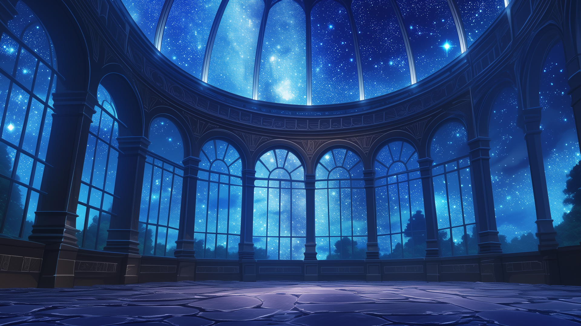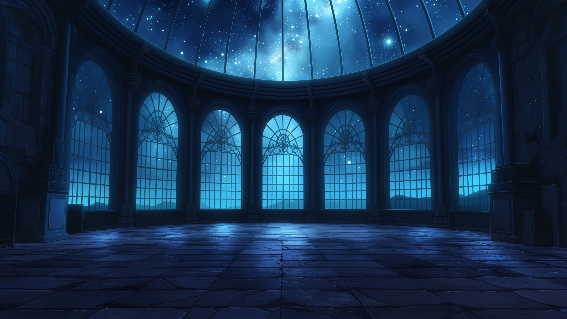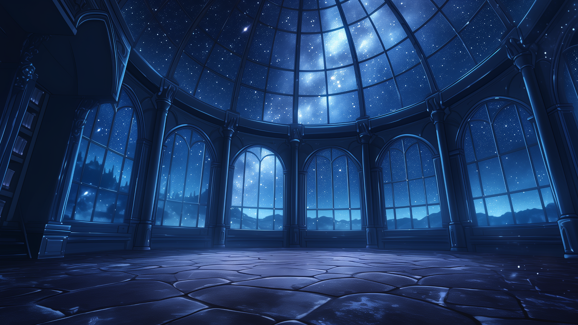 円形の展望ドームが星空を見上げるように広がり、天井からはきらめく星が降り注ぐ。高くそびえる窓が周囲を囲み、静かな夜の雰囲気を演出している。TRPGの夜間イベントや神秘的な集会に最適なフリー背景。
