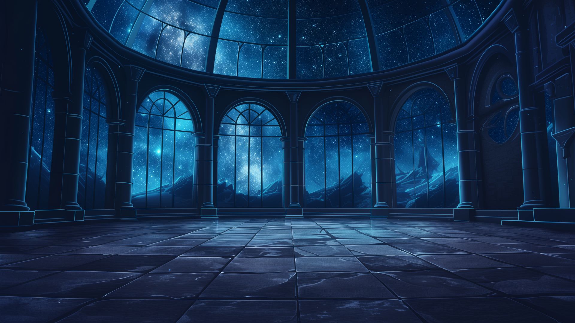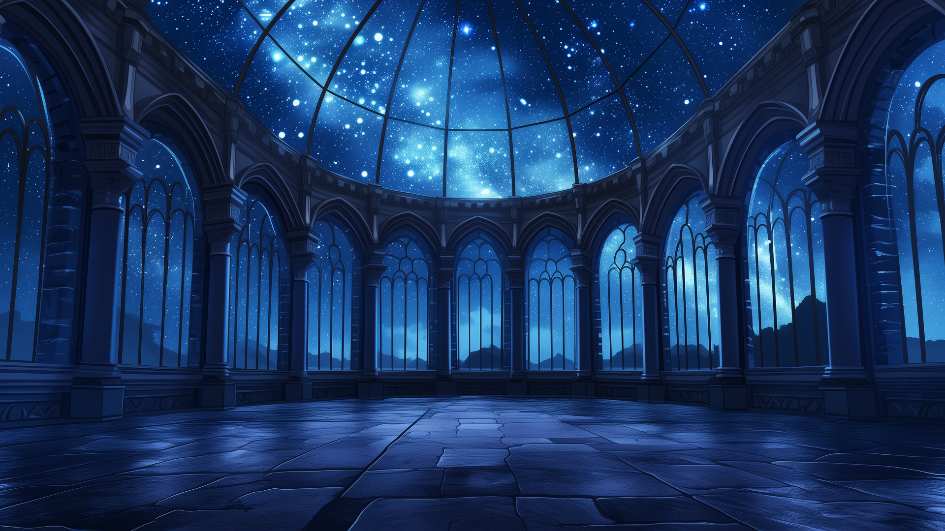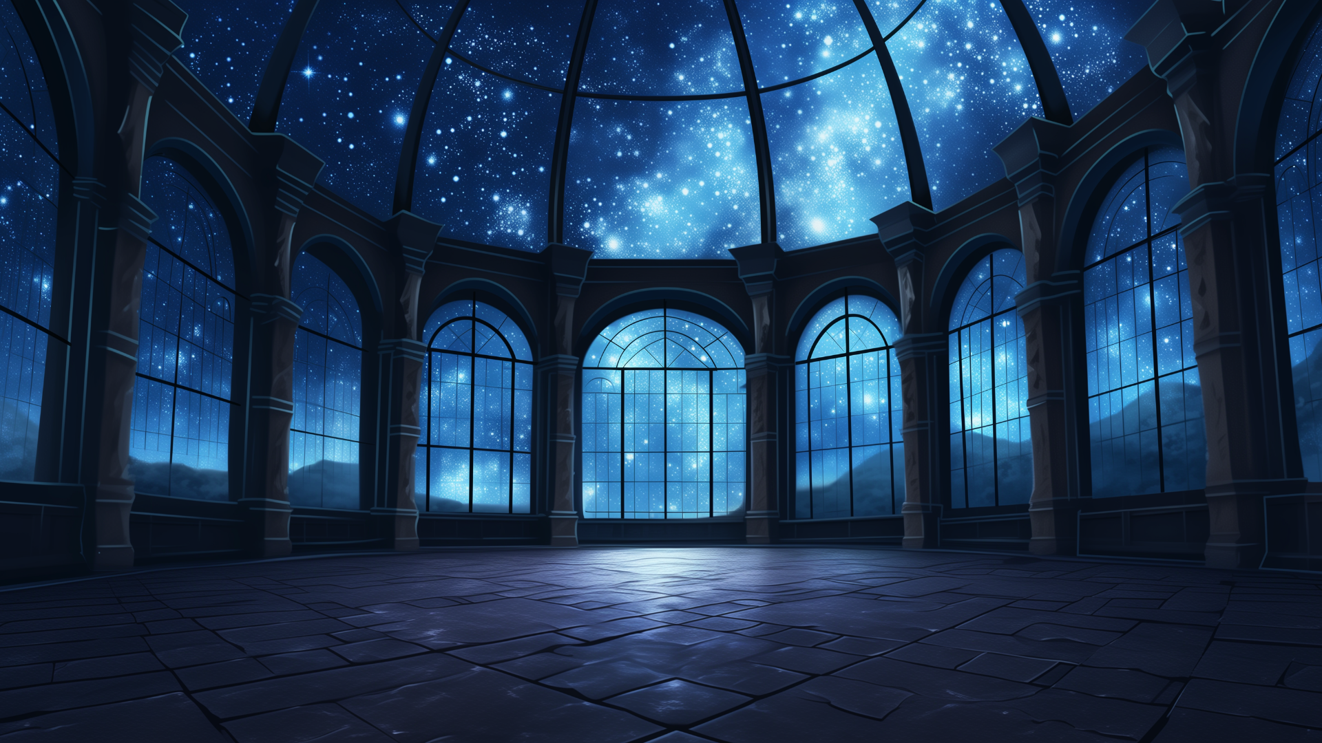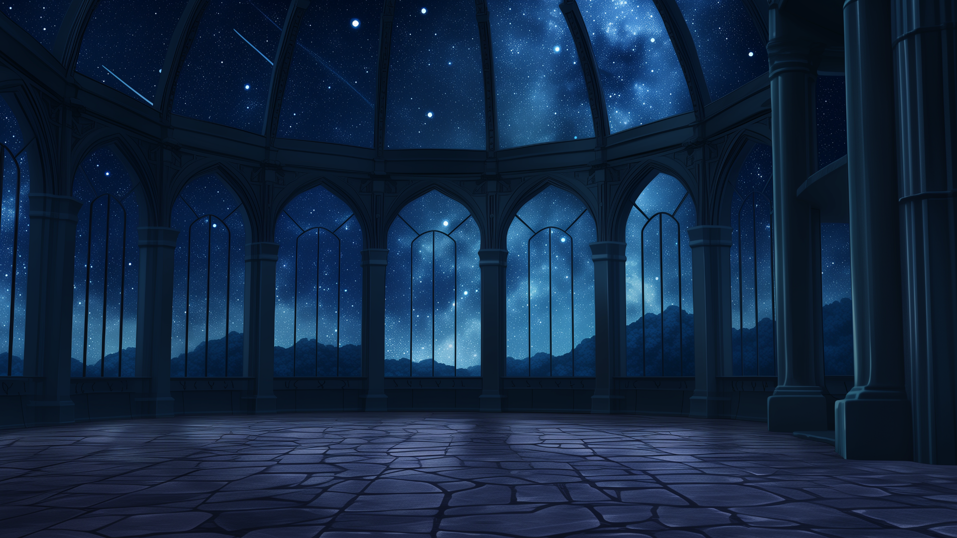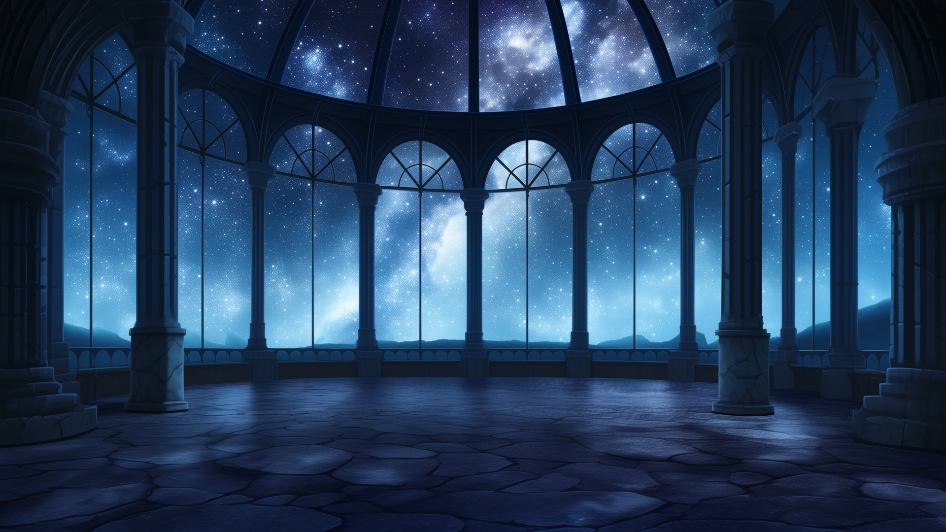 壮大な星空の下、静かなドーム型の展望室が広がる。整ったアーチと石造りの床が幻想的な空気を際立たせる。ファンタジーなTRPGシナリオにも活用できるフリーの舞台背景。