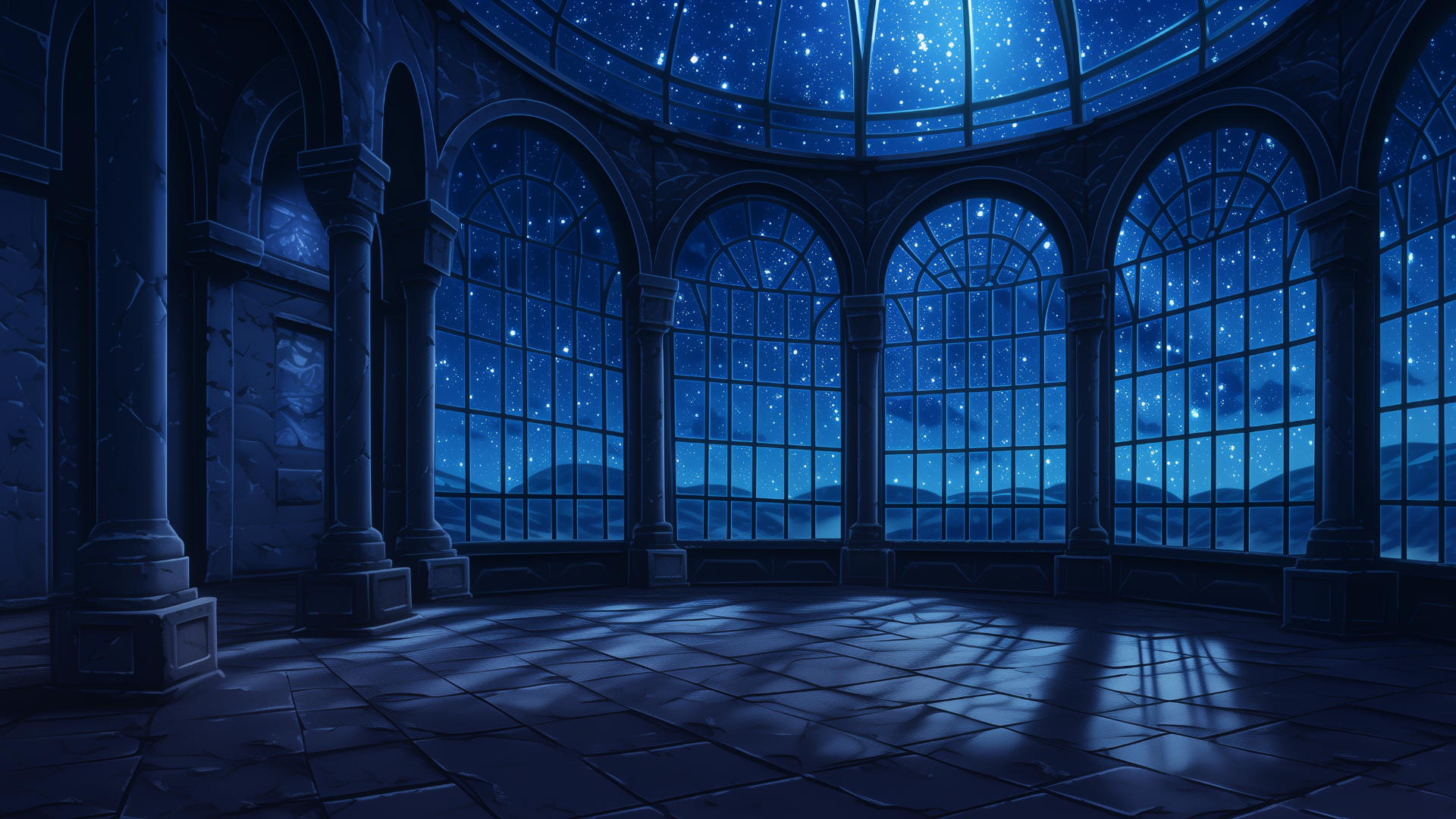 石造りのホールに差し込む星の光と窓の影が美しく、神秘的な雰囲気を演出。空が見渡せる高所の展望エリアとして描かれている。深夜の会話シーンや天体観測の導入に適したTRPG向け背景。