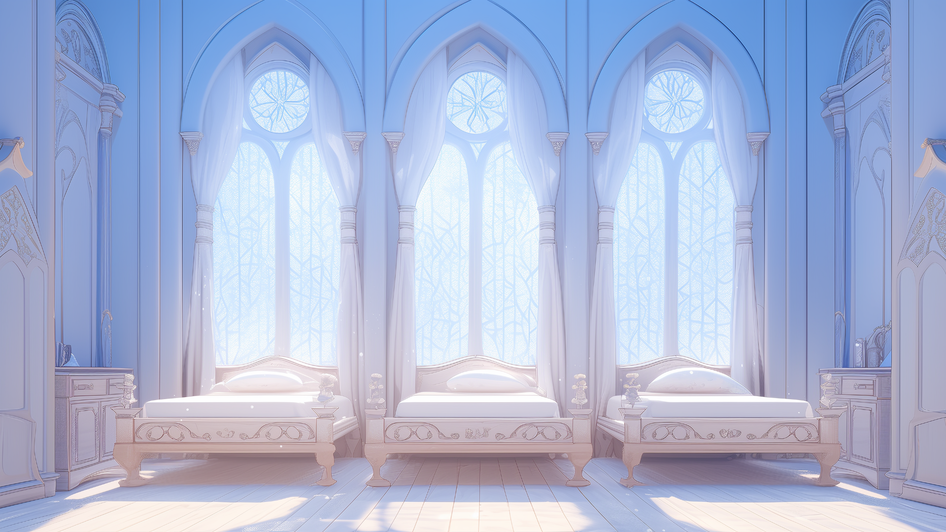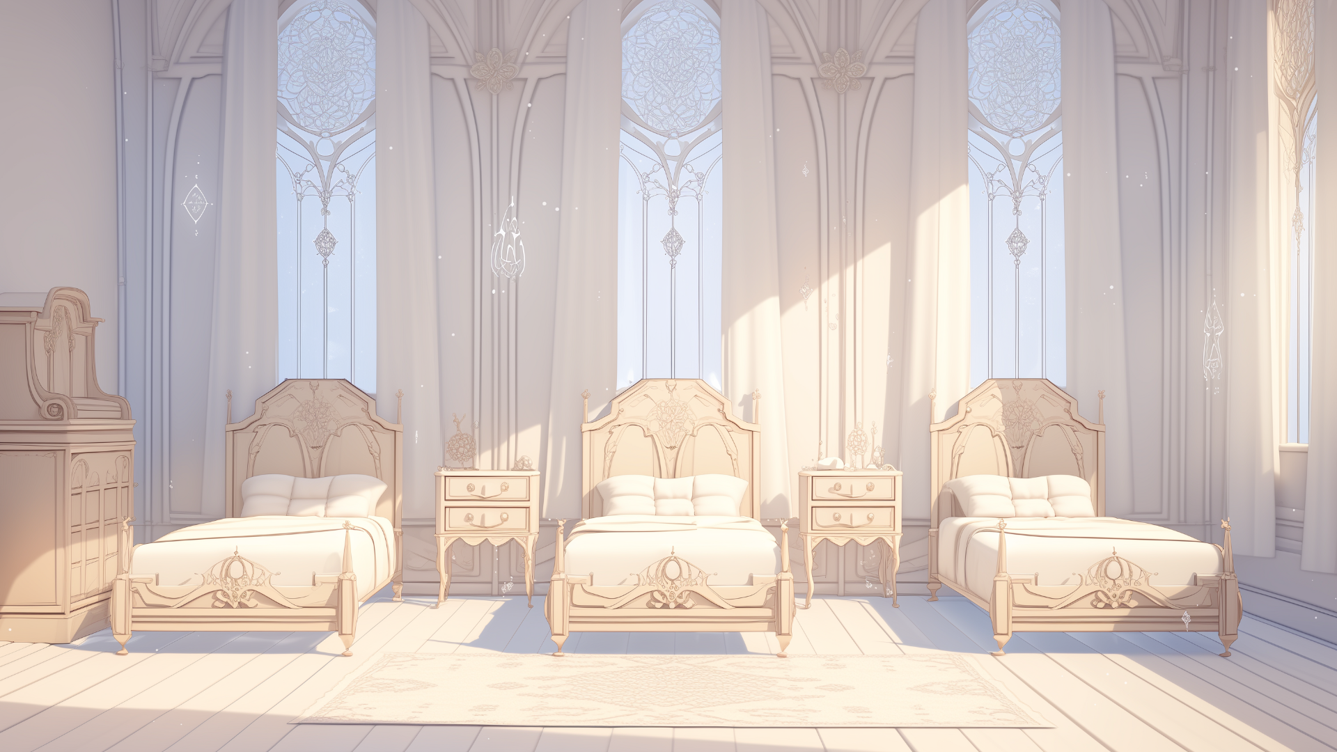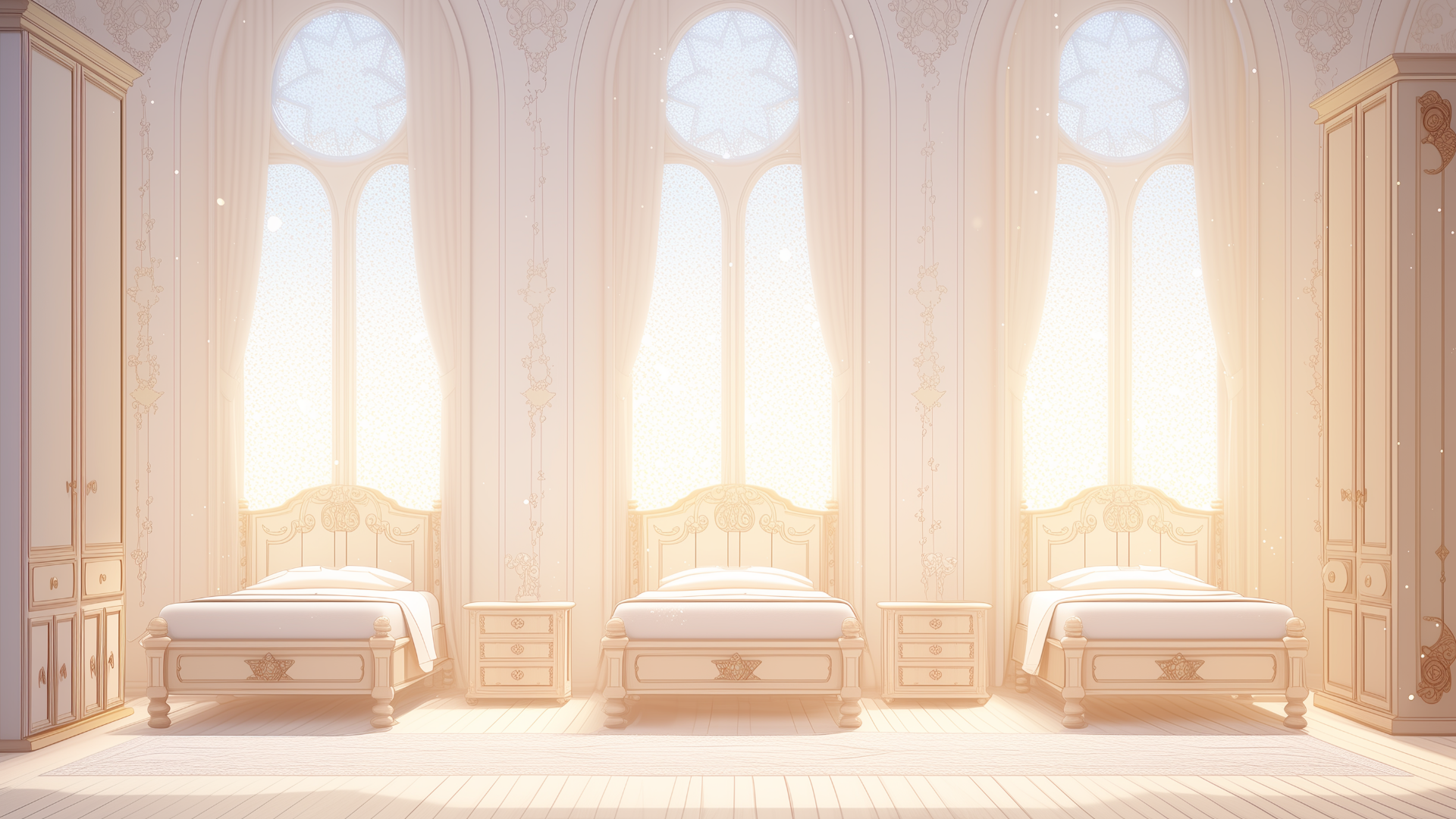宝石のような光が差し込む、純白の装飾が美しい三人部屋。ベッドや家具には神聖なモチーフがあしらわれている。祝福の儀式や聖騎士団の拠点などを描くシーンに最適な背景画像。
