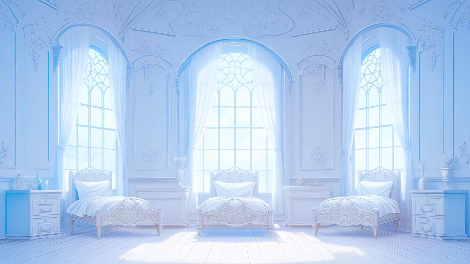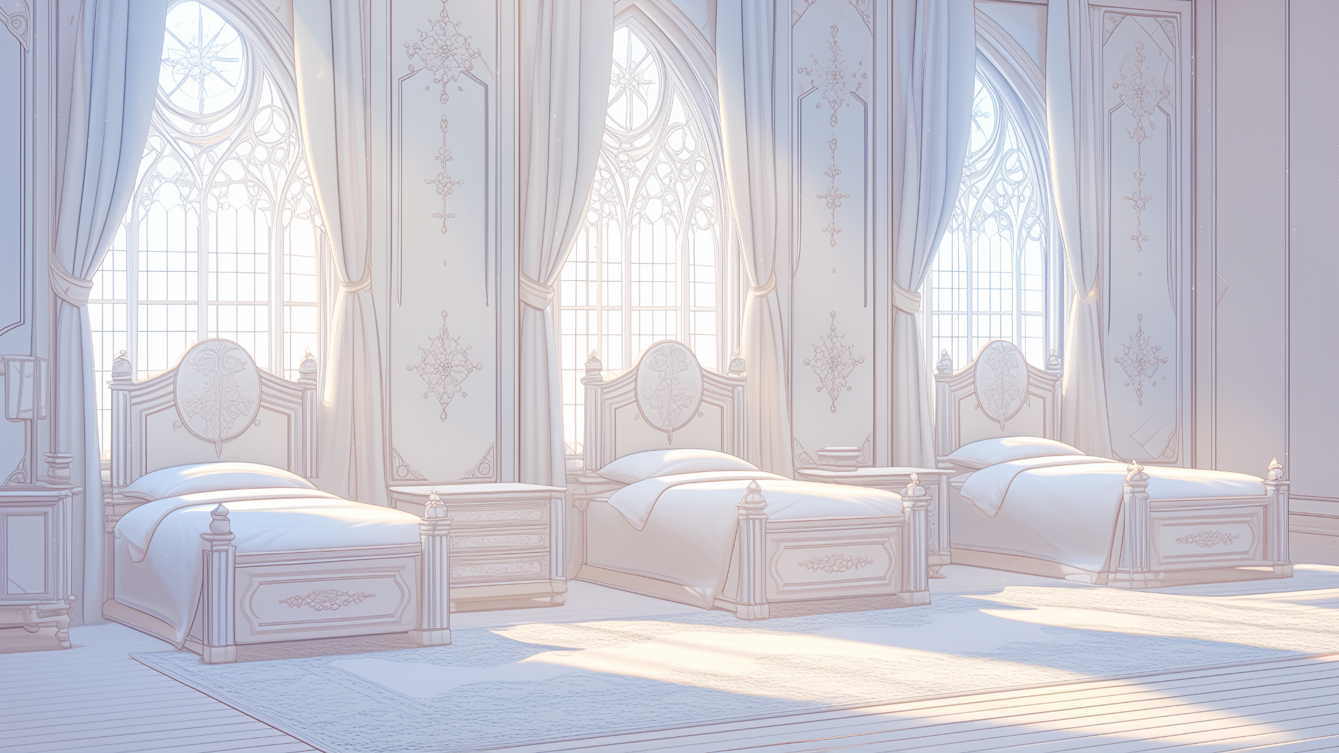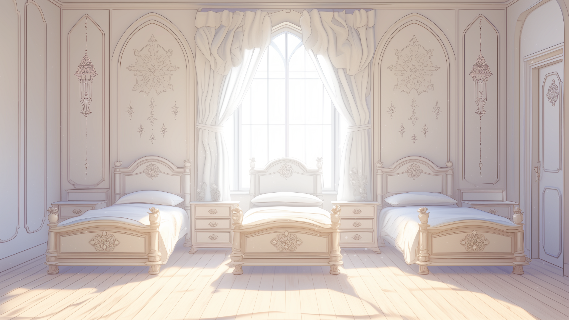 宝石のような光が差し込む、純白の装飾が美しい三人部屋。ベッドや家具には神聖なモチーフがあしらわれている。祝福の儀式や聖騎士団の拠点などを描くシーンに最適な背景画像。