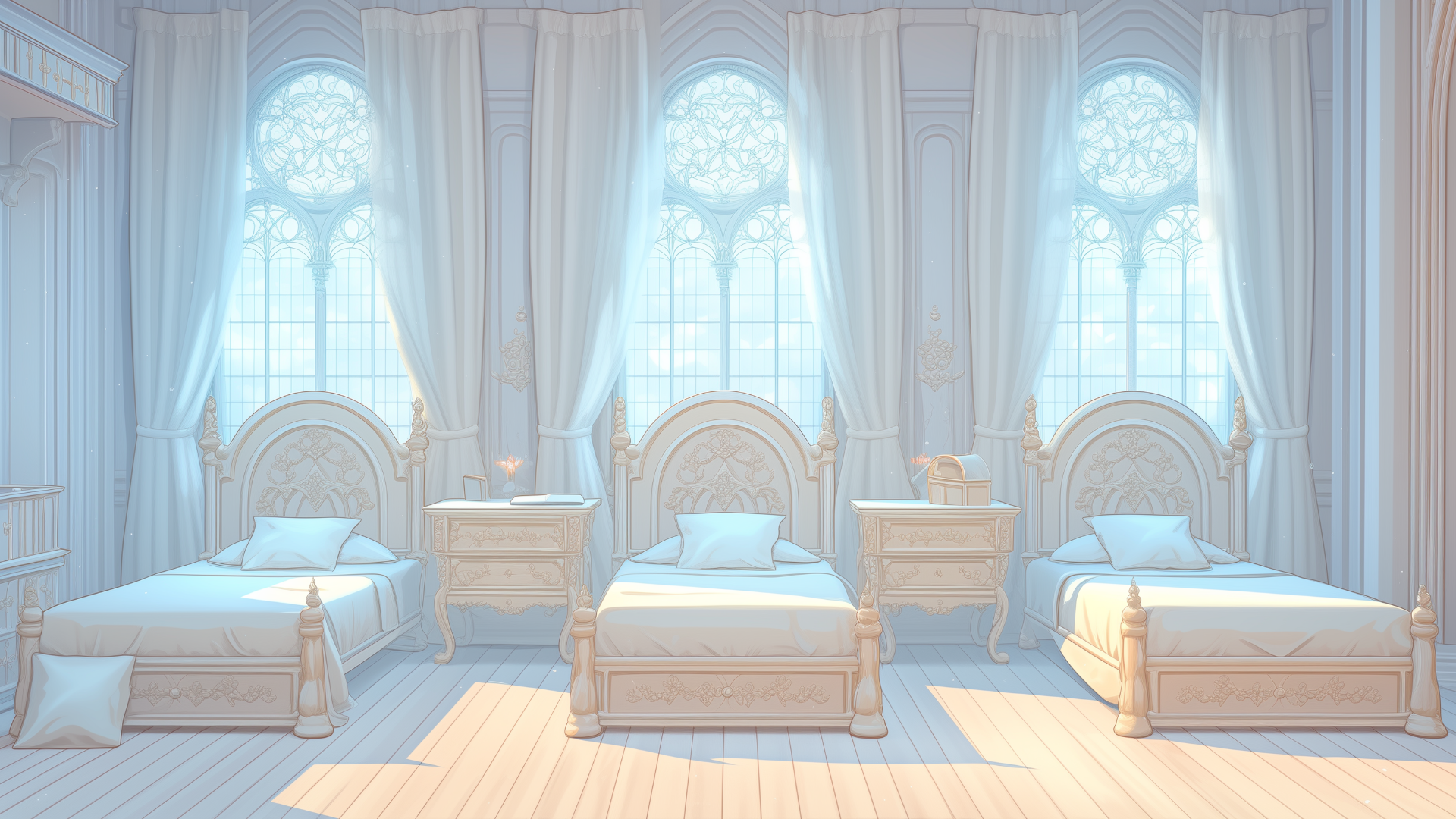 高い天井とアーチ型の窓から柔らかな光が差す三人部屋。優雅なデザインと整ったベッド配置が、静謐な雰囲気を生み出している。天使の暮らす学園や神殿内部の生活感を演出する背景素材。
