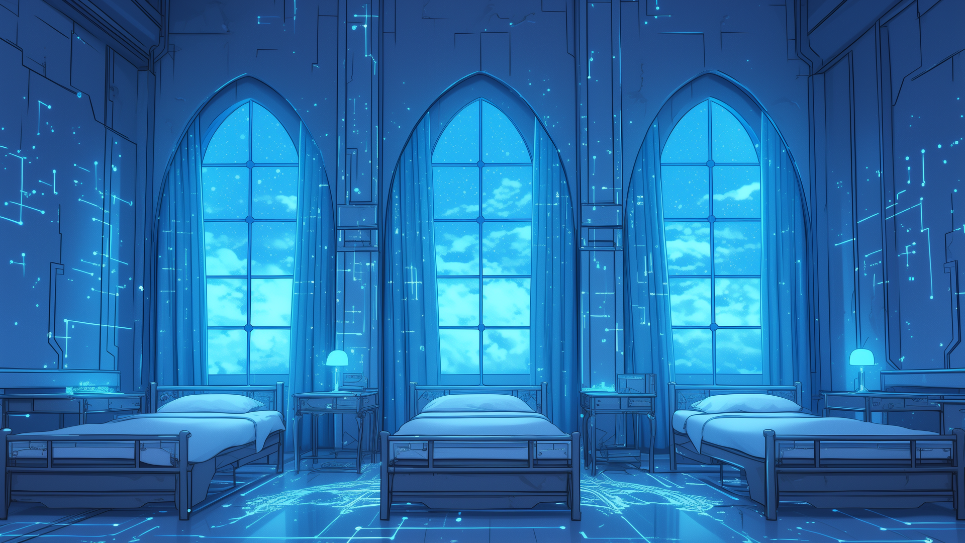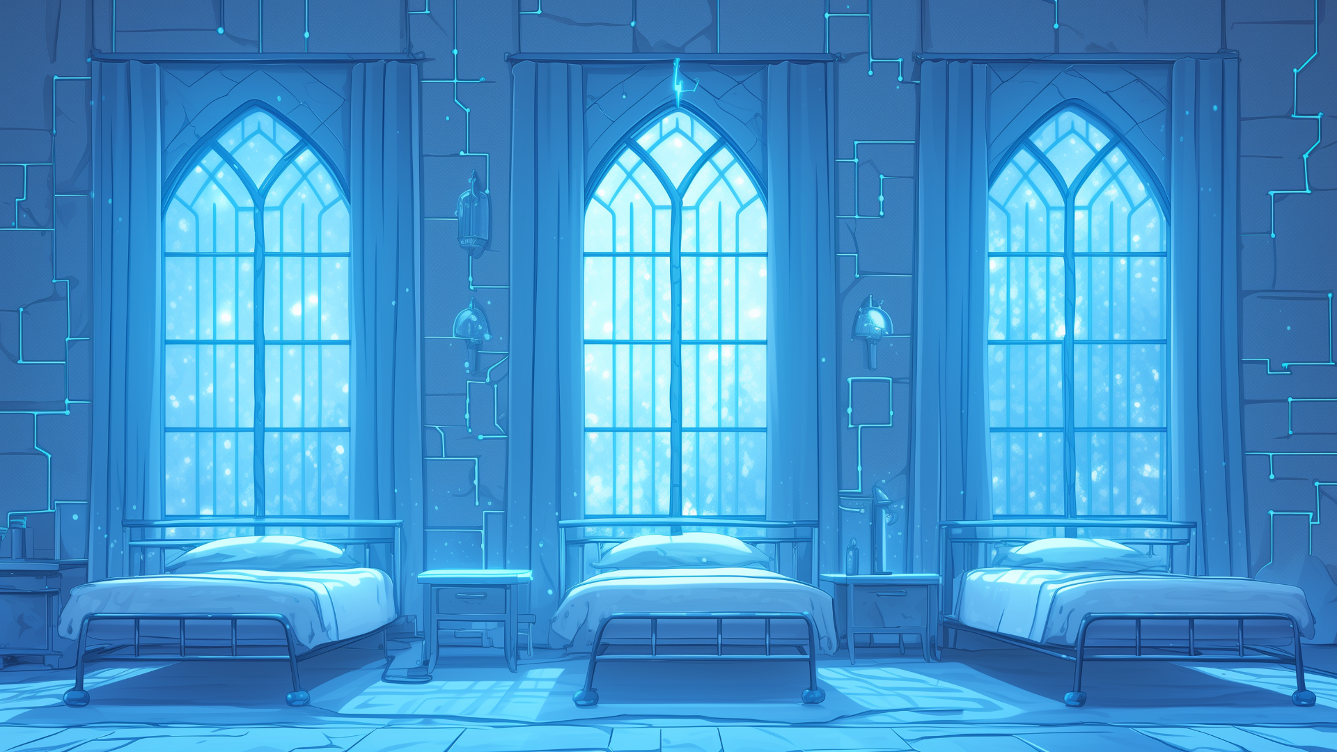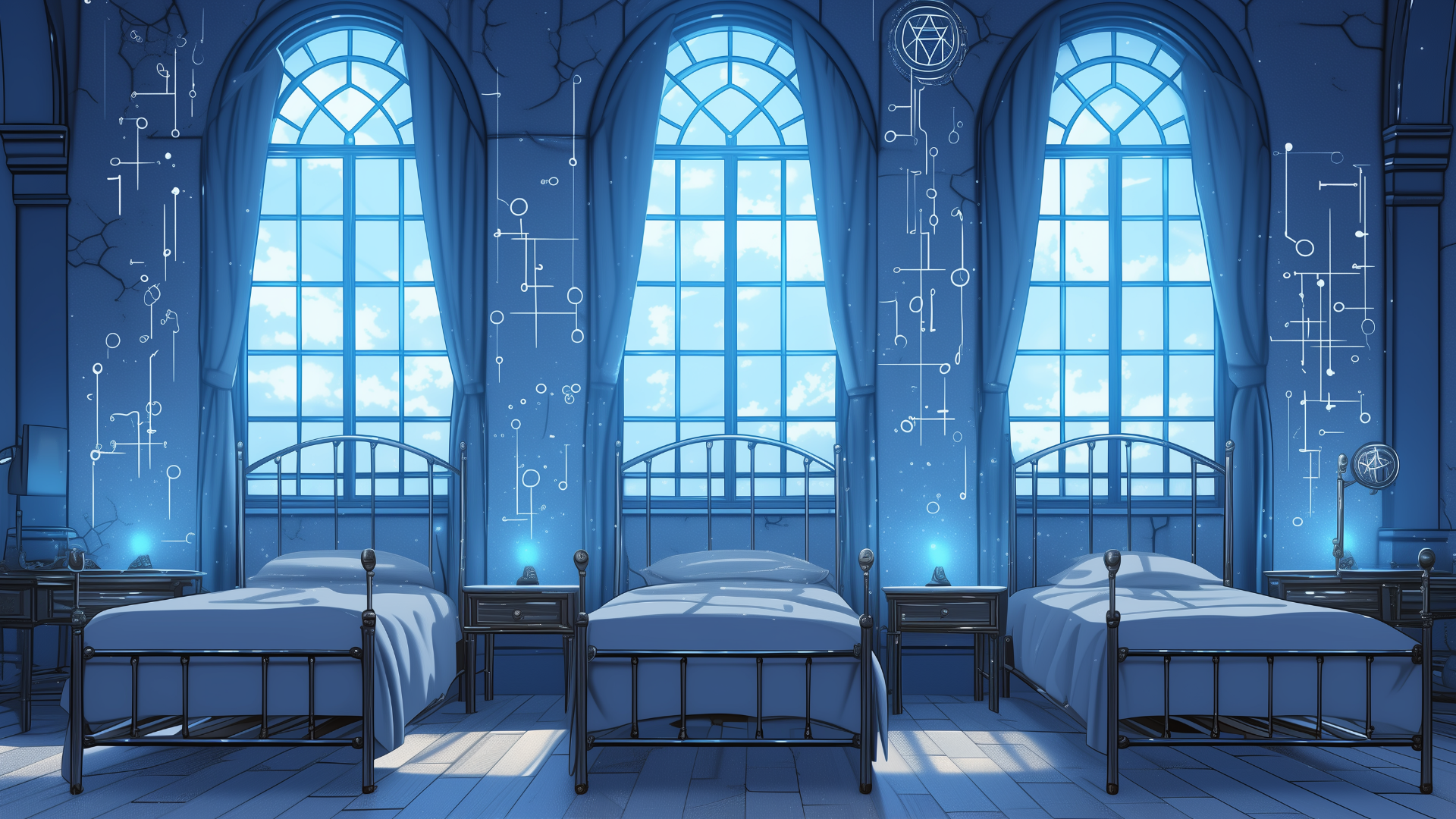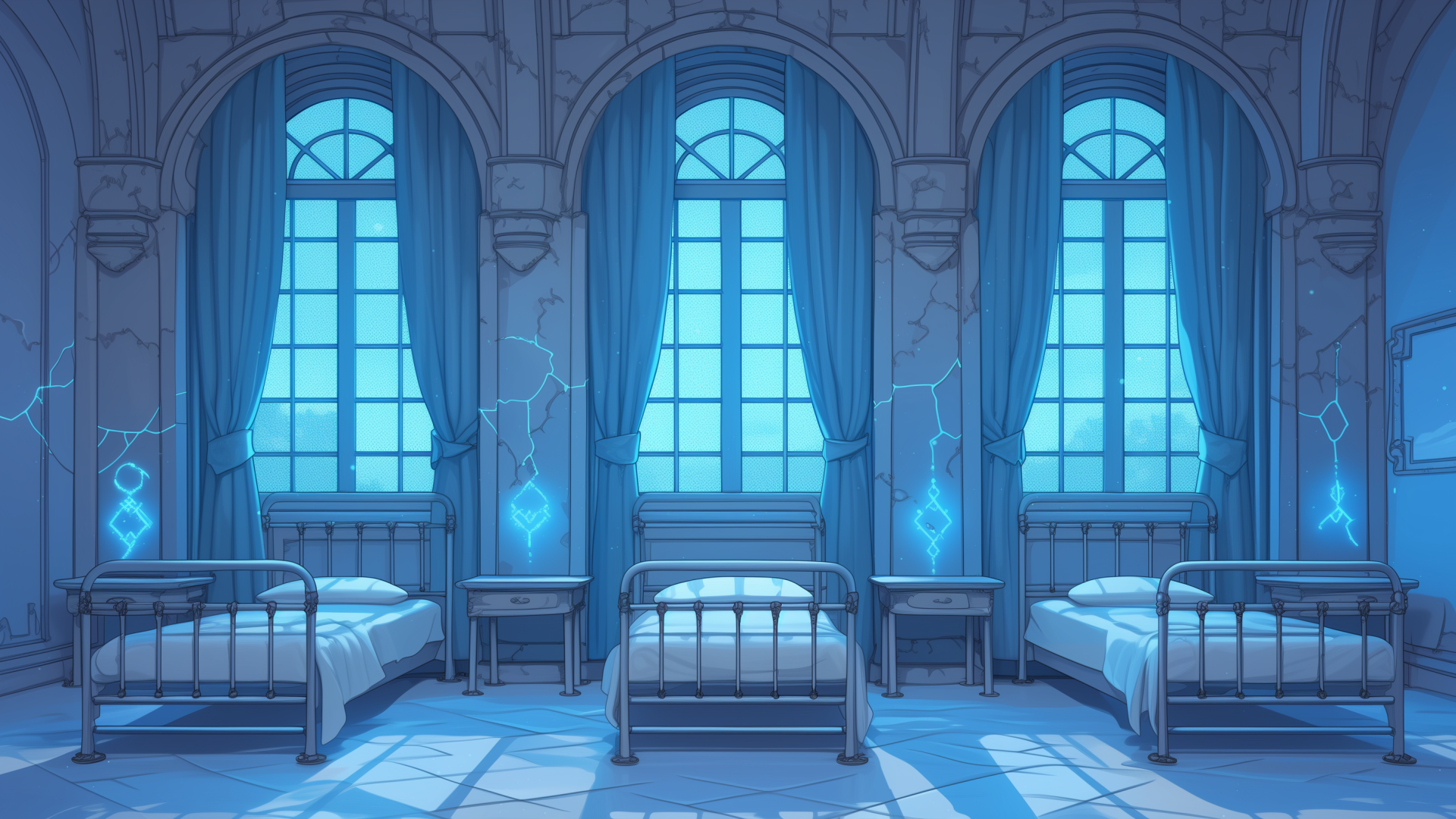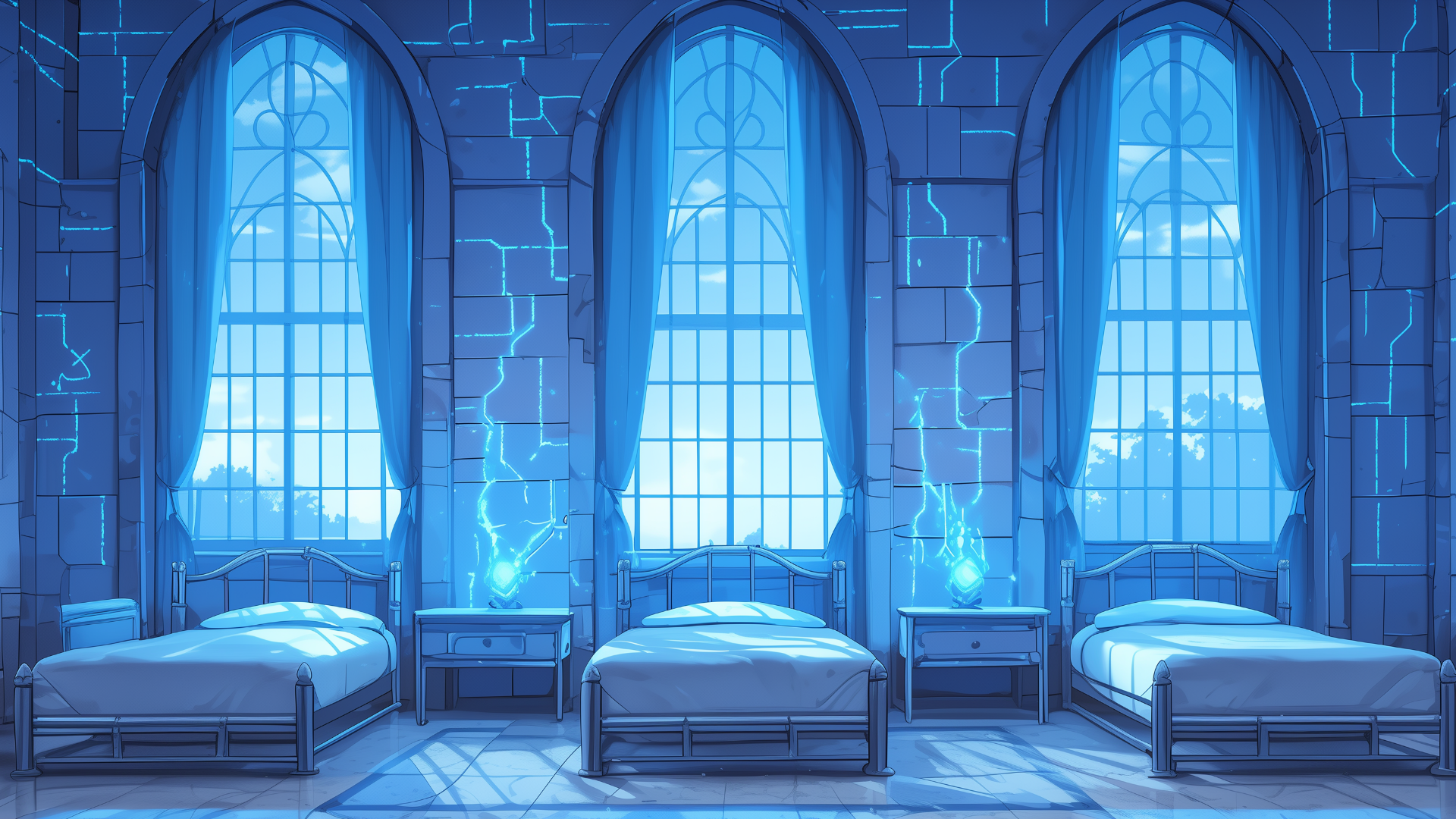 magic-school, dormitory, lightning-element, three-person-room, bedroom, daytime