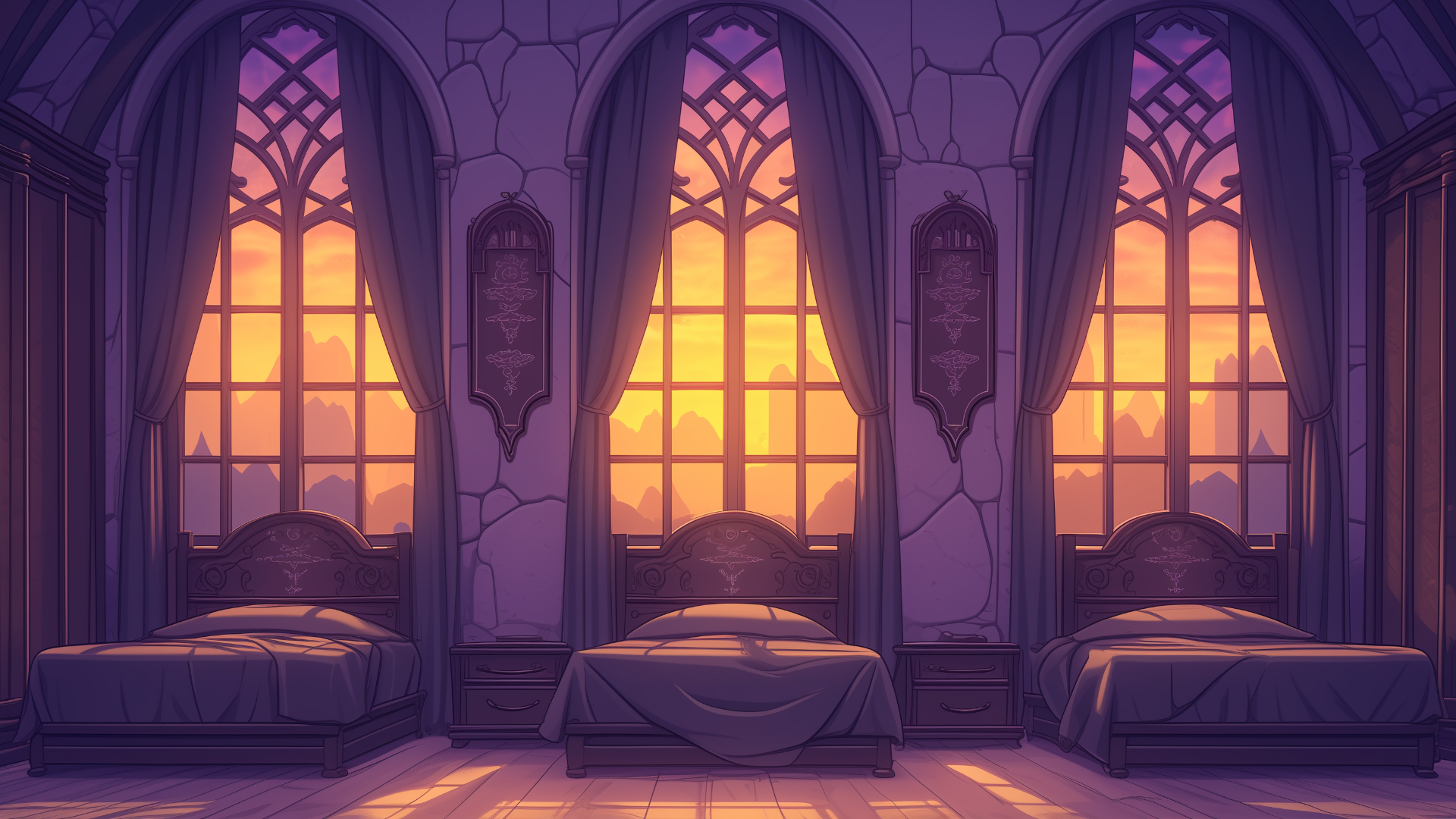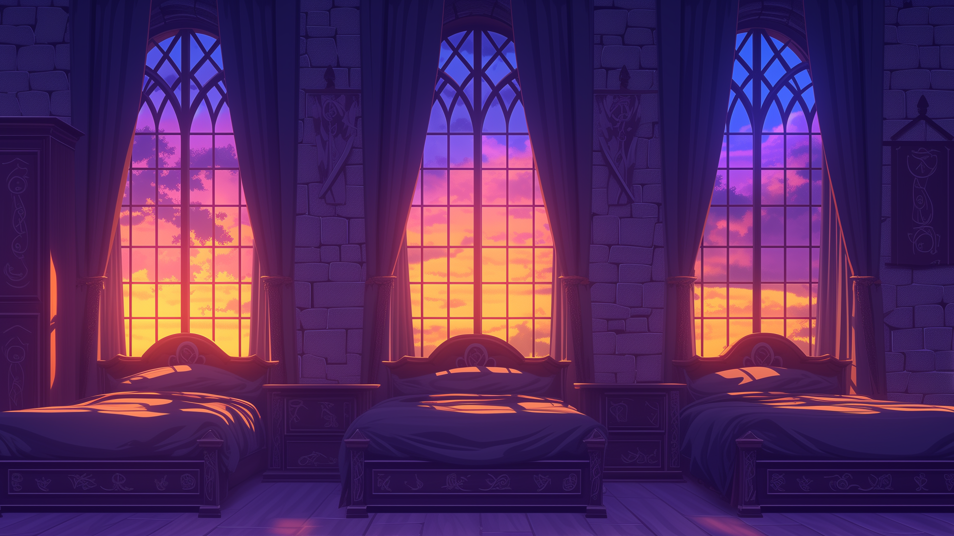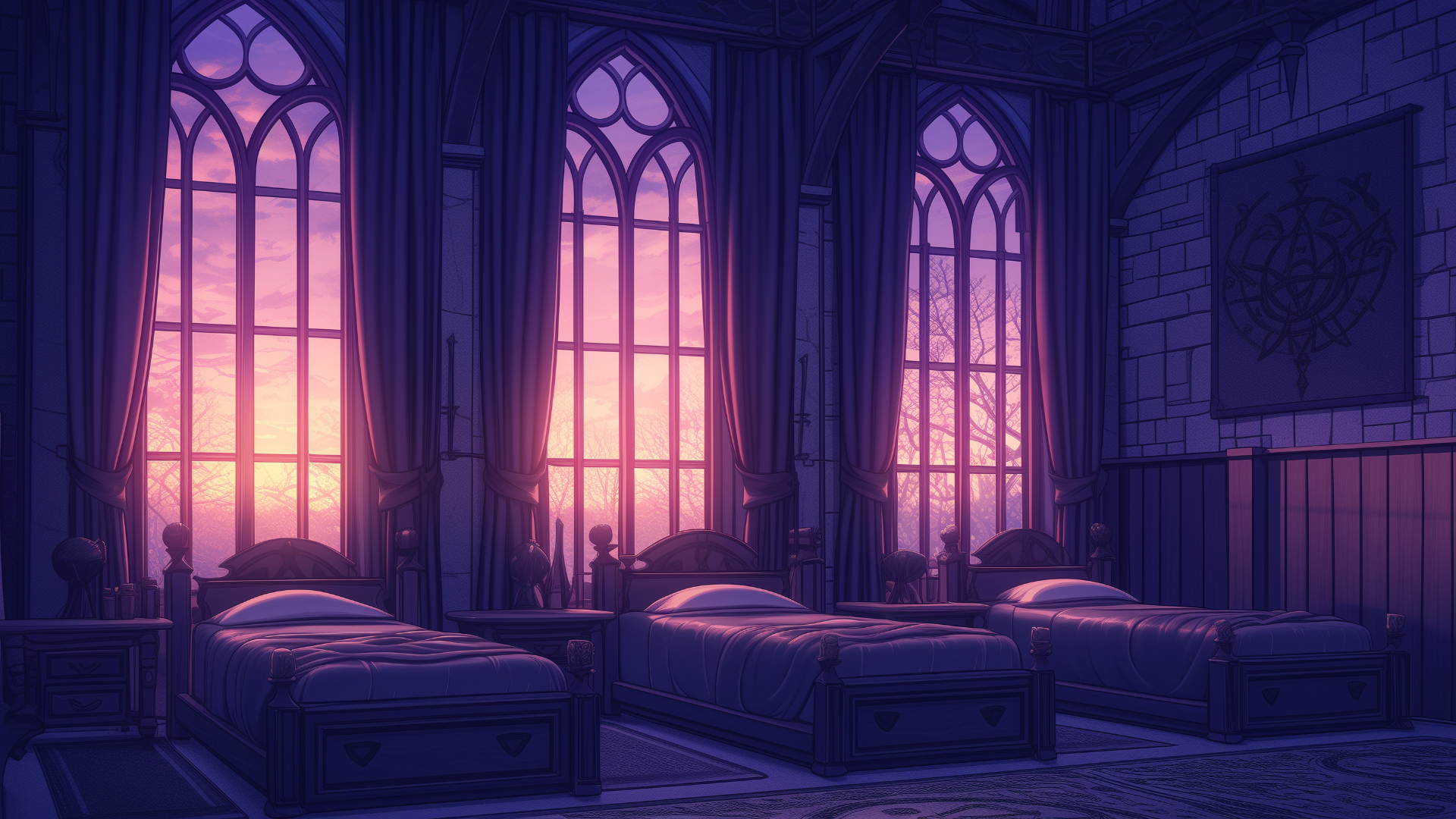魔法学校の寮(闇属性・夕方)、3人部屋のフリー背景素材です。
