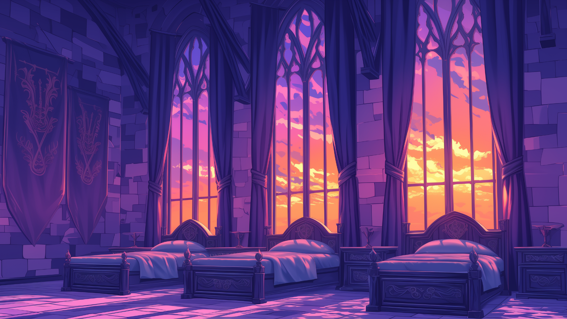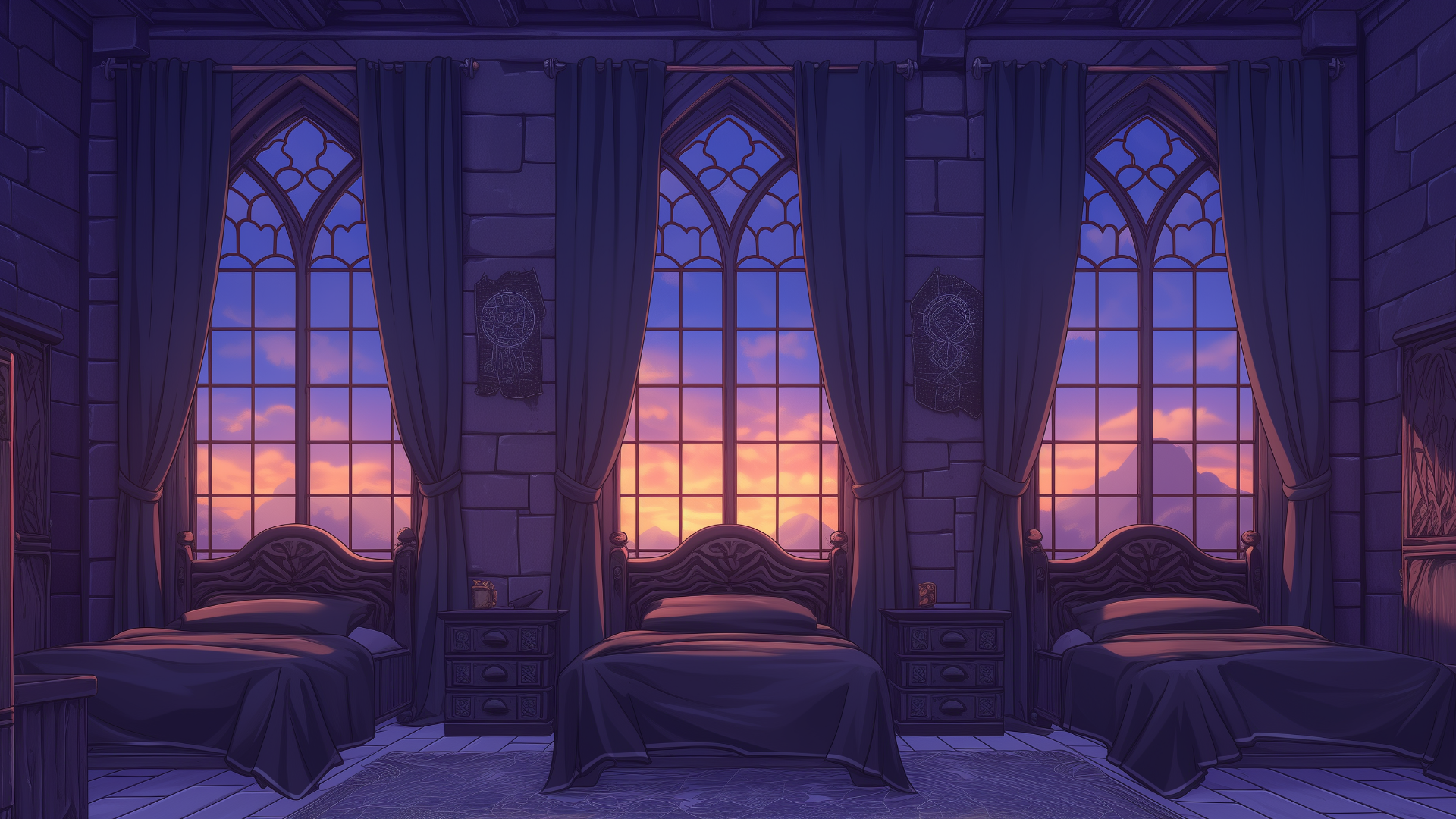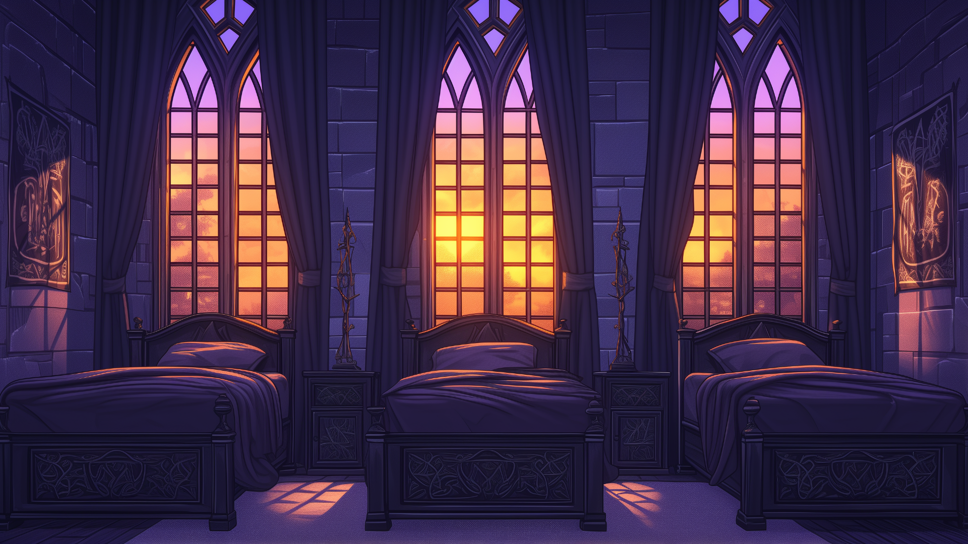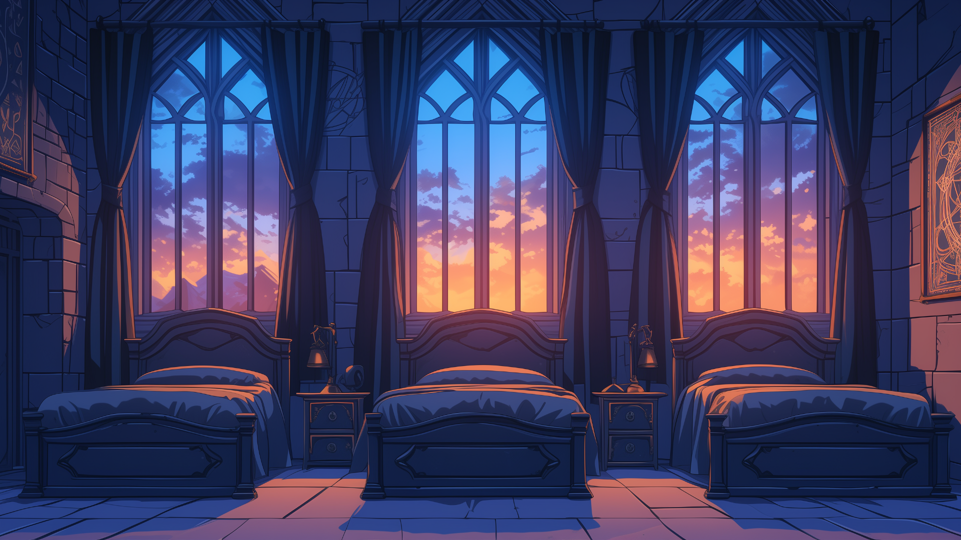 魔法学校の寮(闇属性・夕方)、3人部屋のフリー背景素材です。