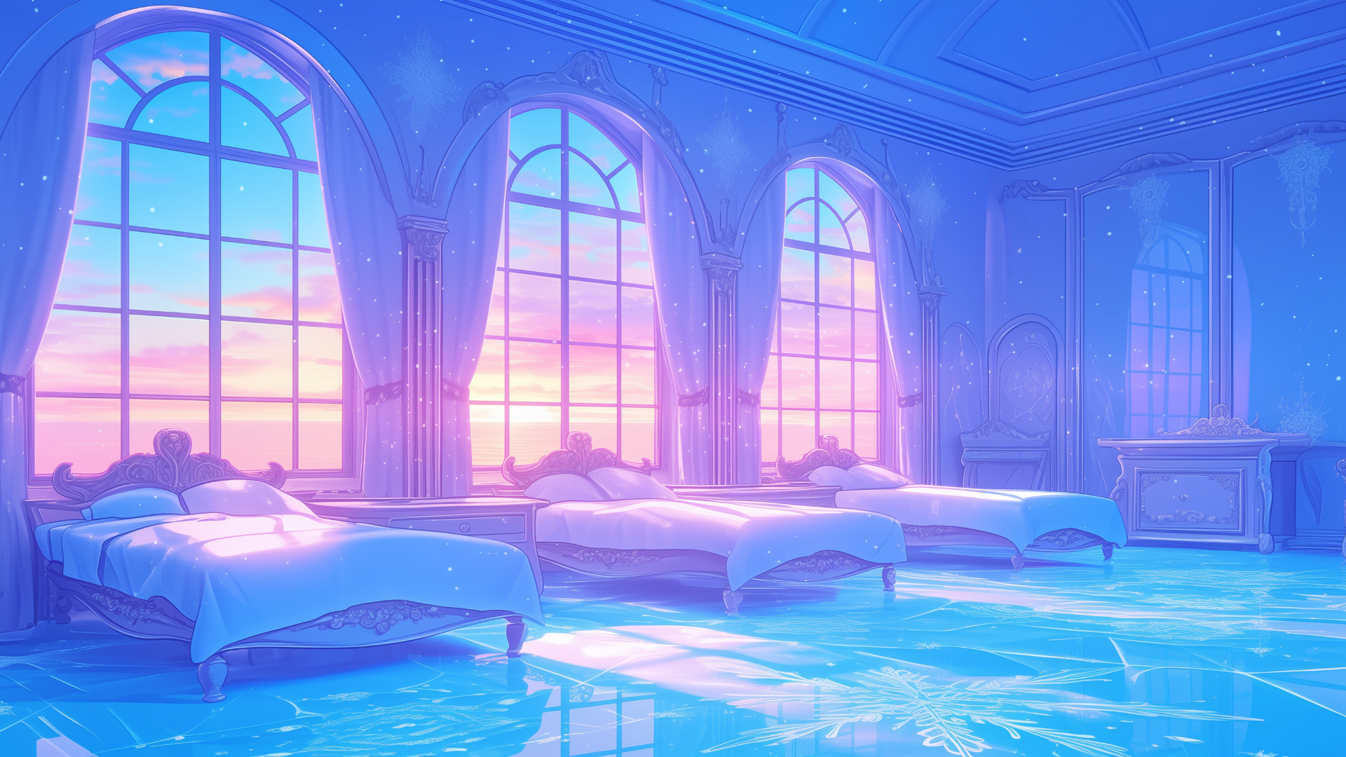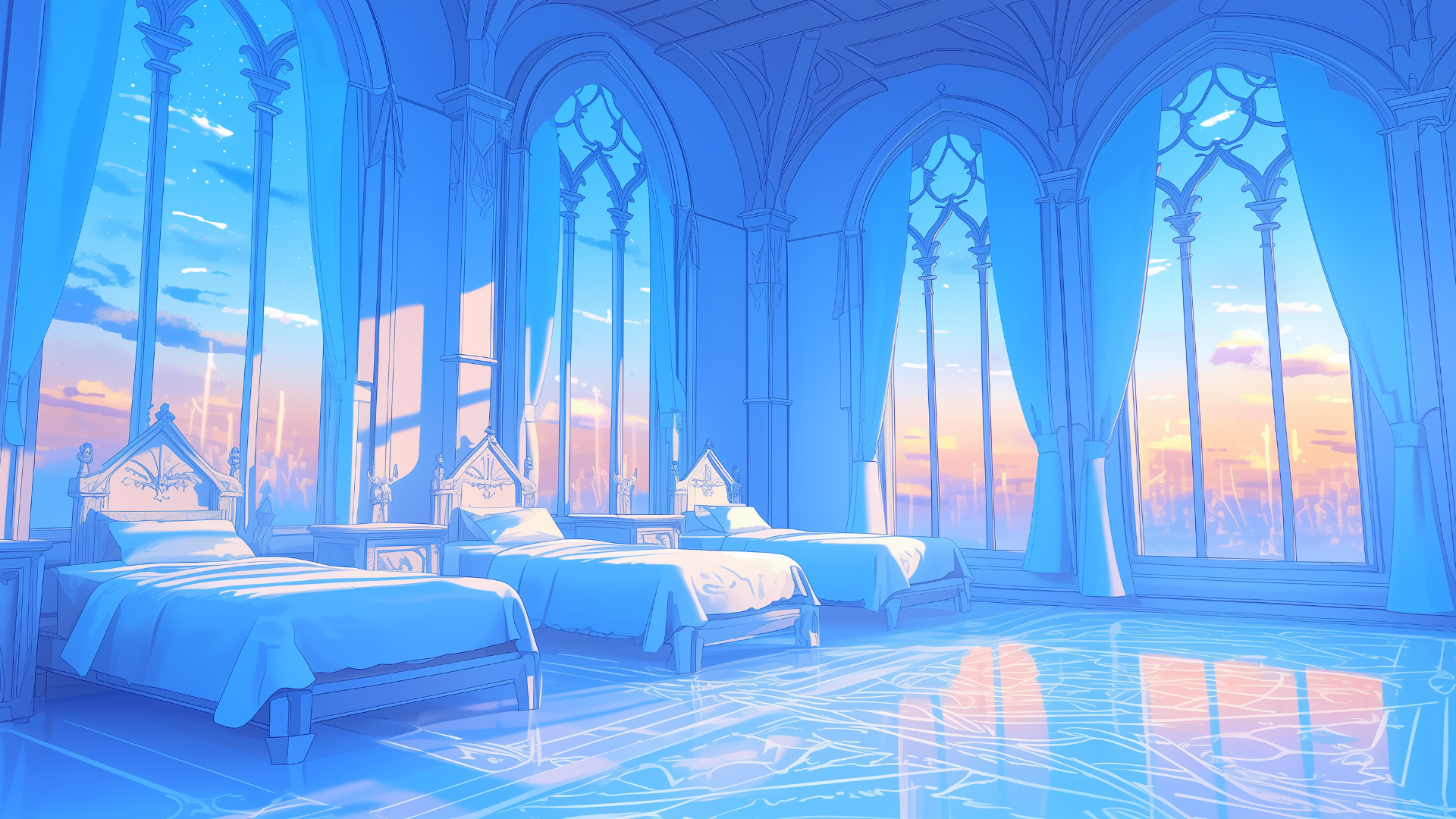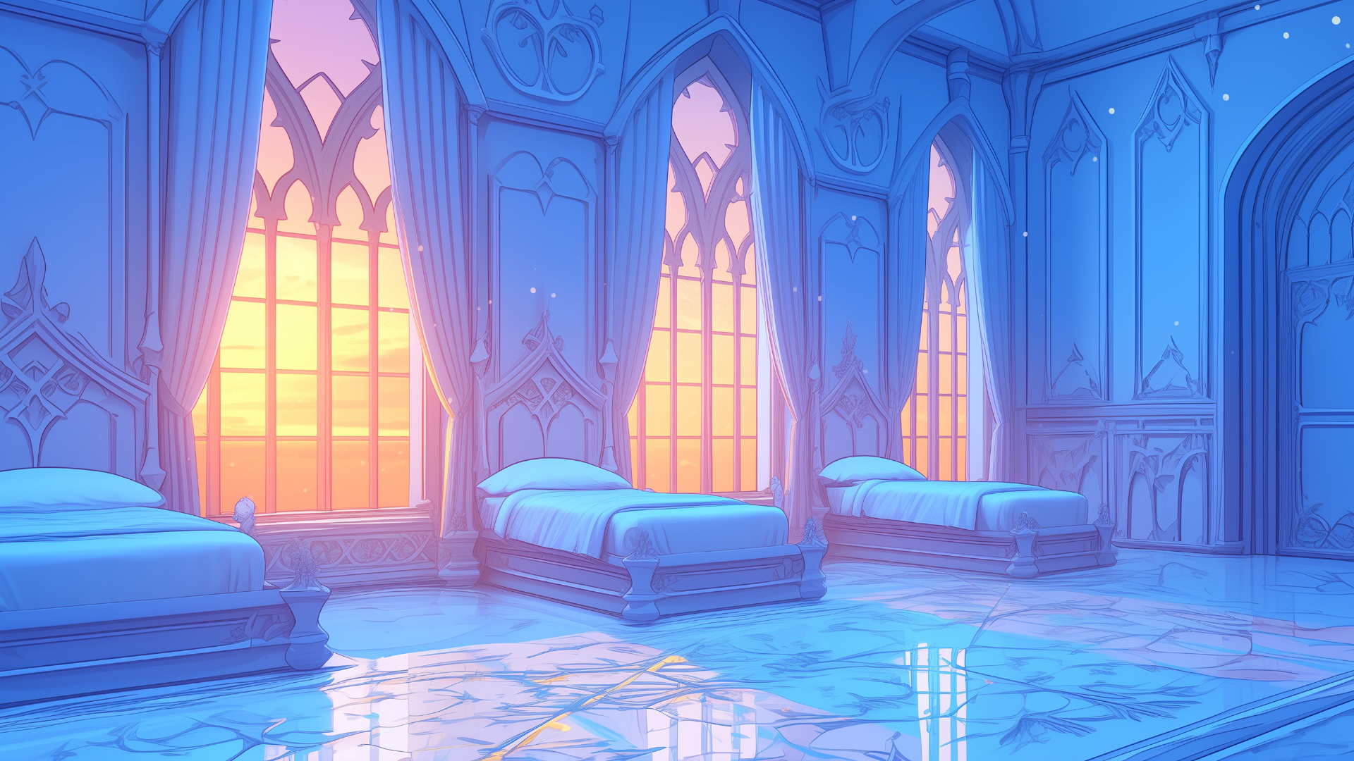 魔法学校の寮(氷属性・夕方)、3人部屋のフリー背景素材です。