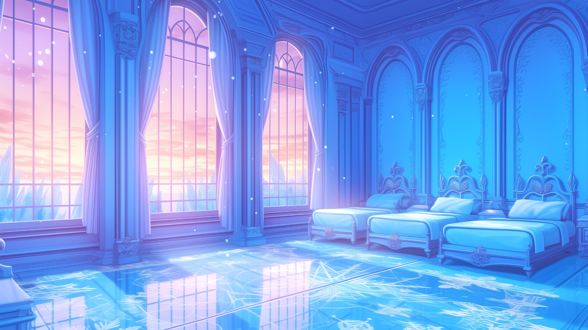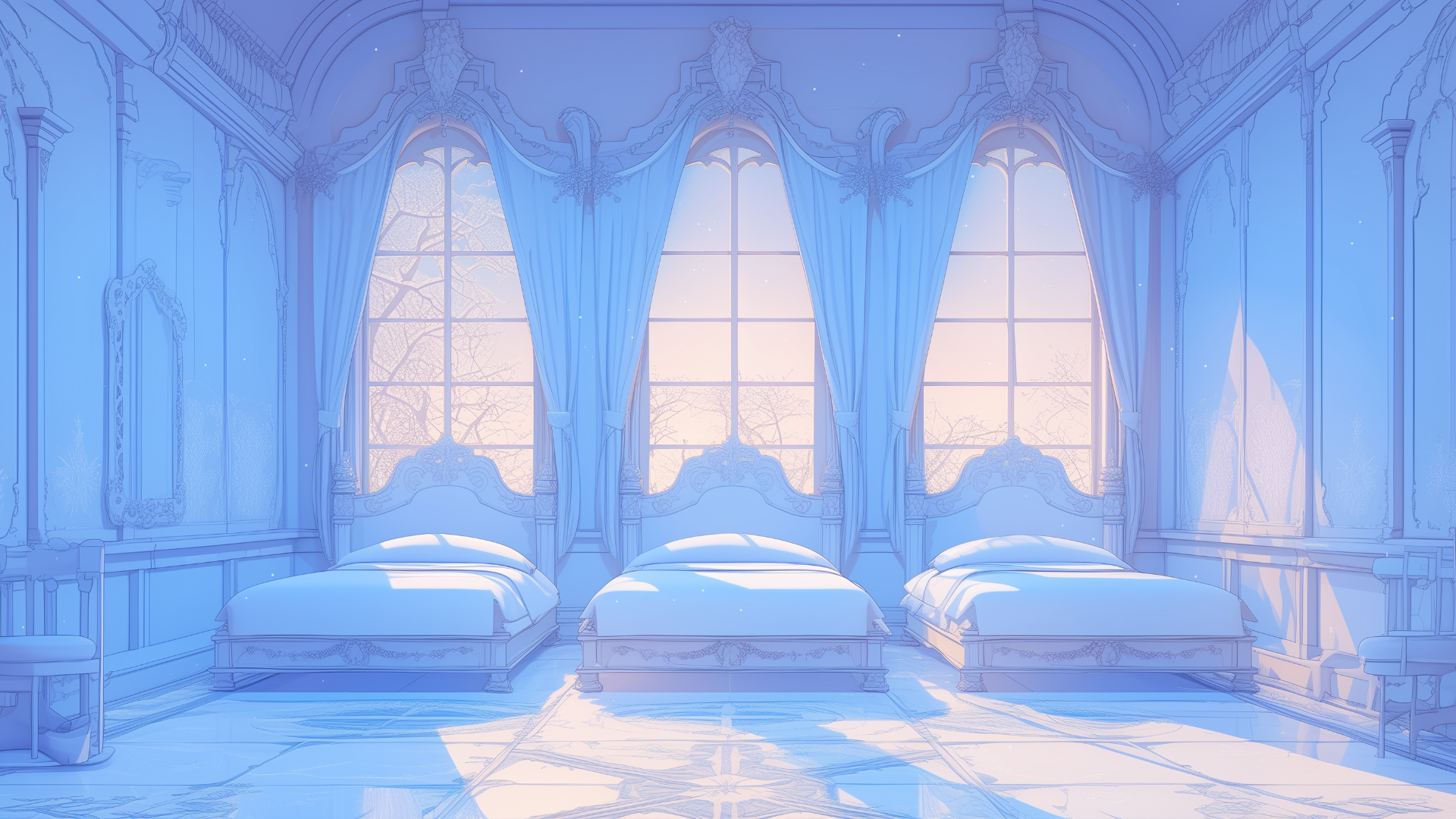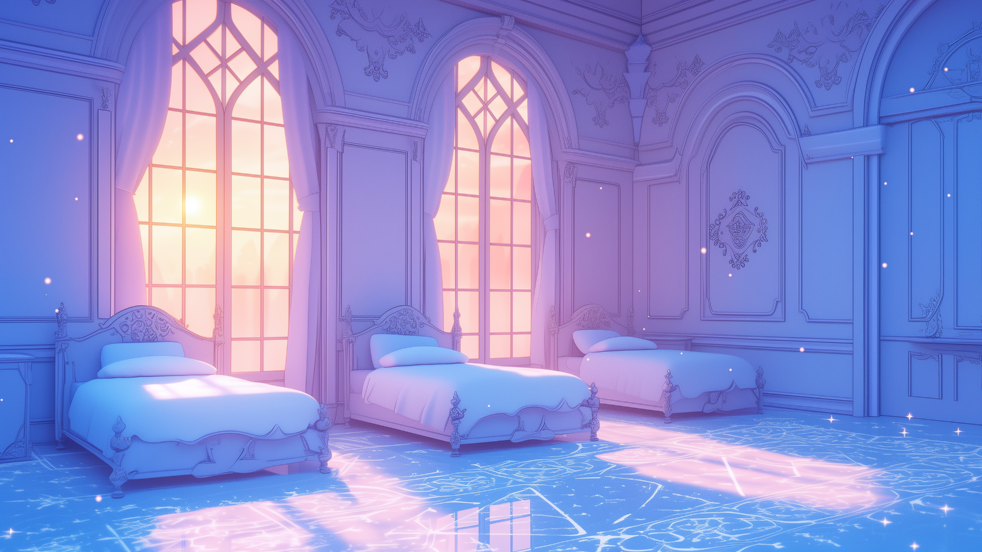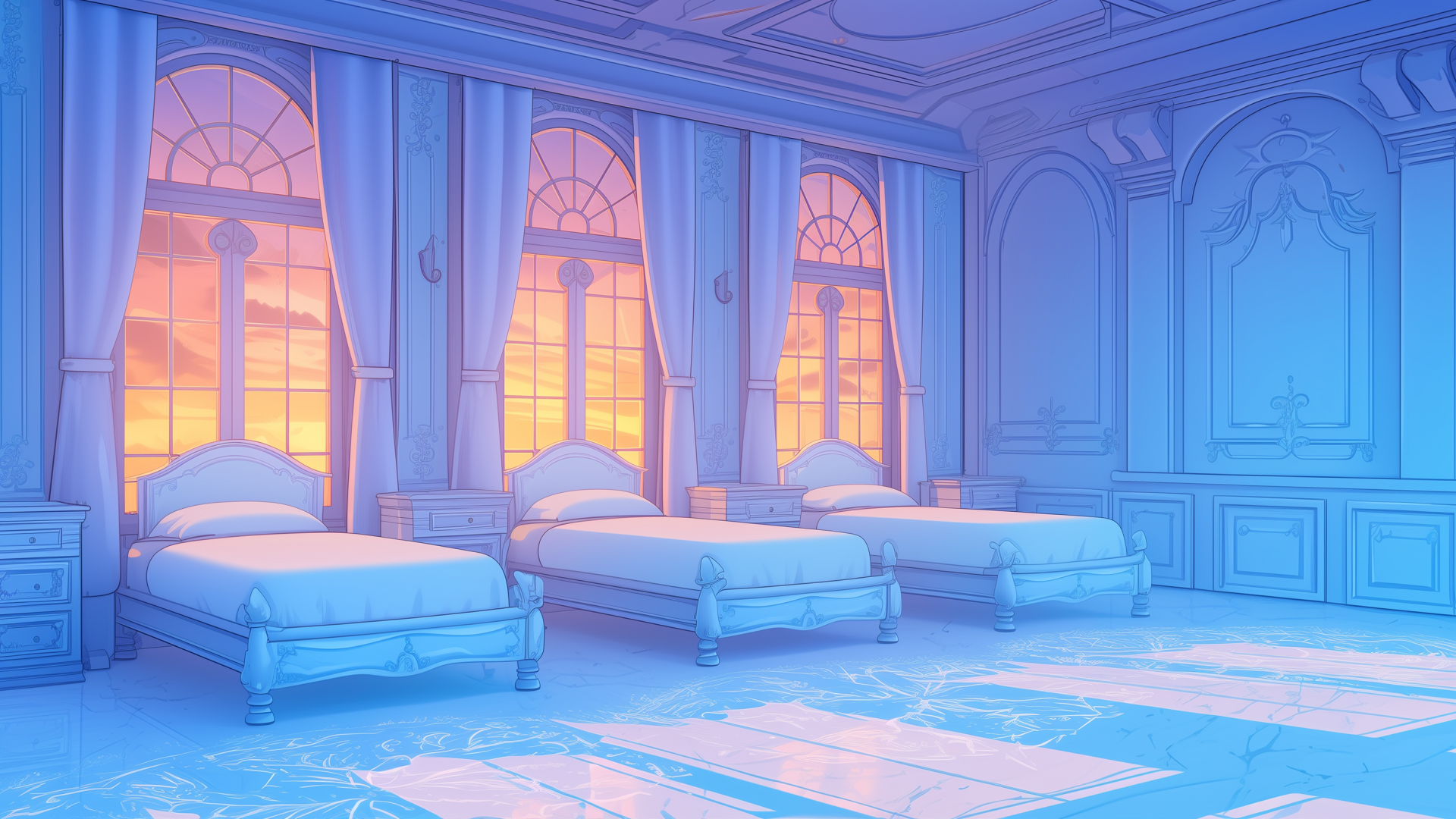 魔法学校の寮(氷属性・夕方)、3人部屋のフリー背景素材です。