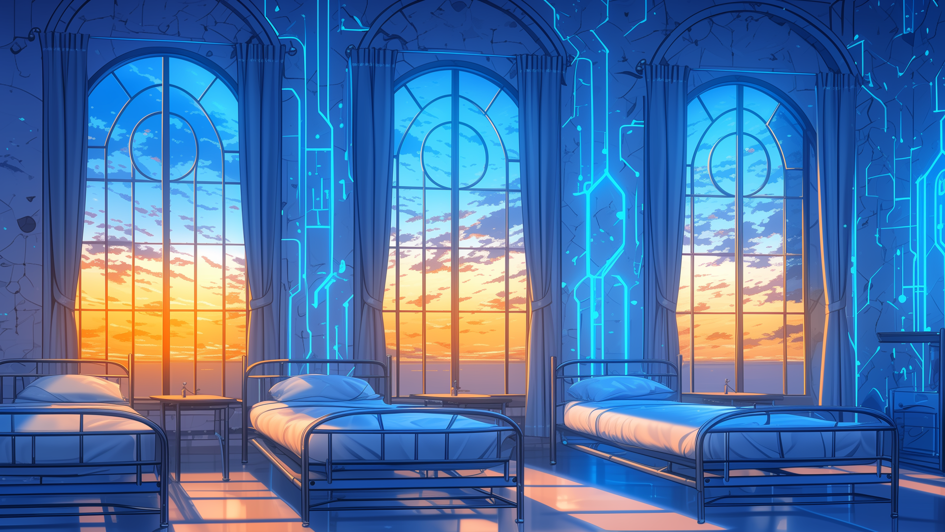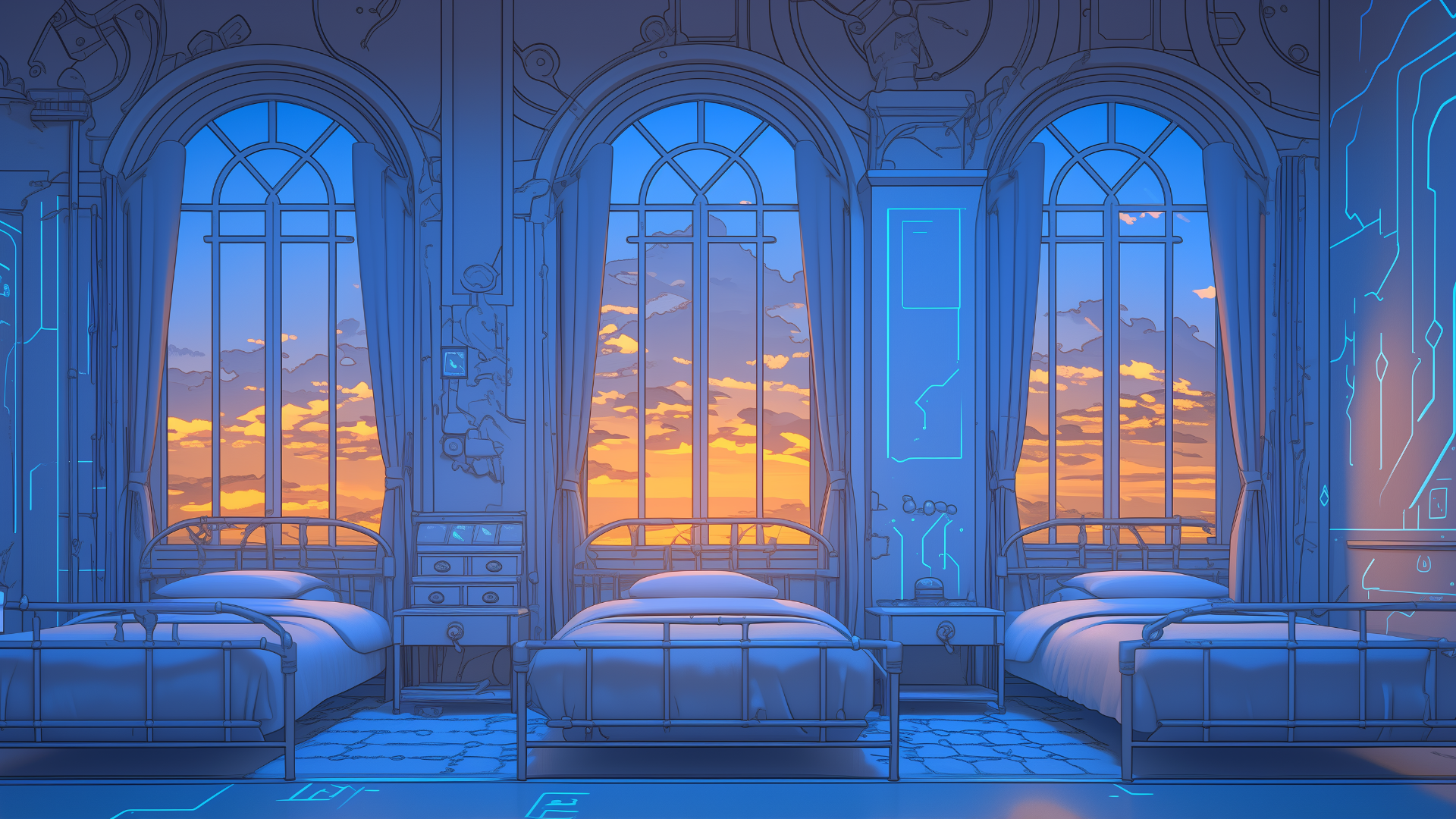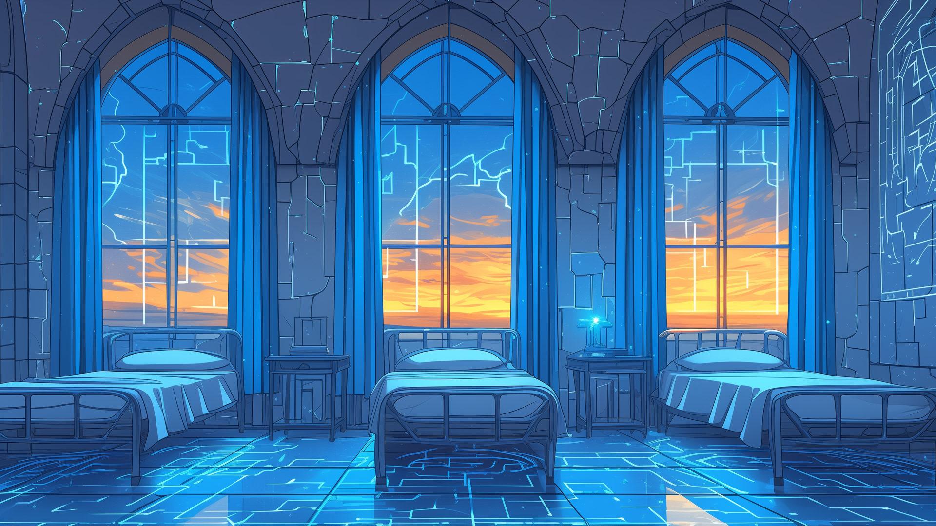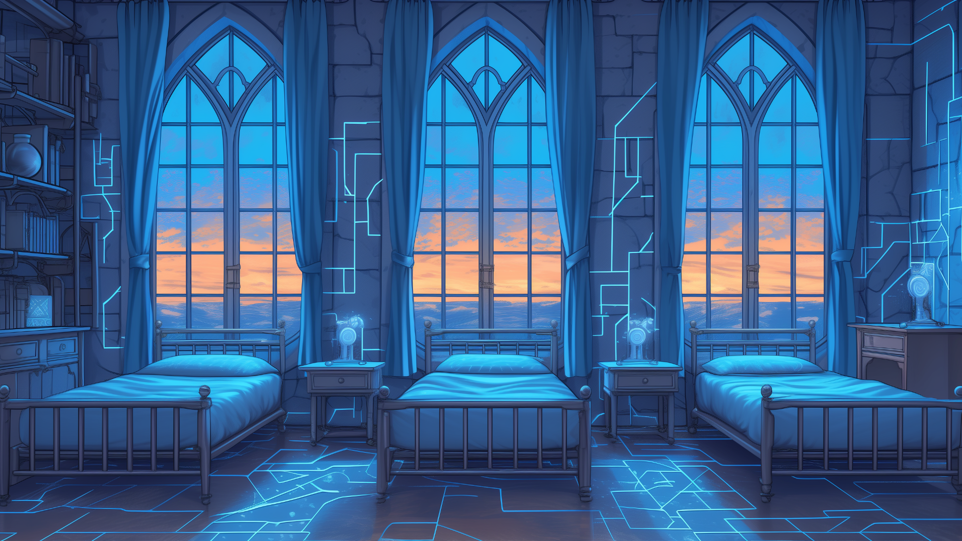 機械的な文様が光る壁と、クラシックな窓が融合した三人部屋。光の加減によって床面にも青い模様が浮かび、現実と非現実が交錯する雰囲気を演出。電脳世界や実験施設風のTRPGシナリオに適した背景素材。