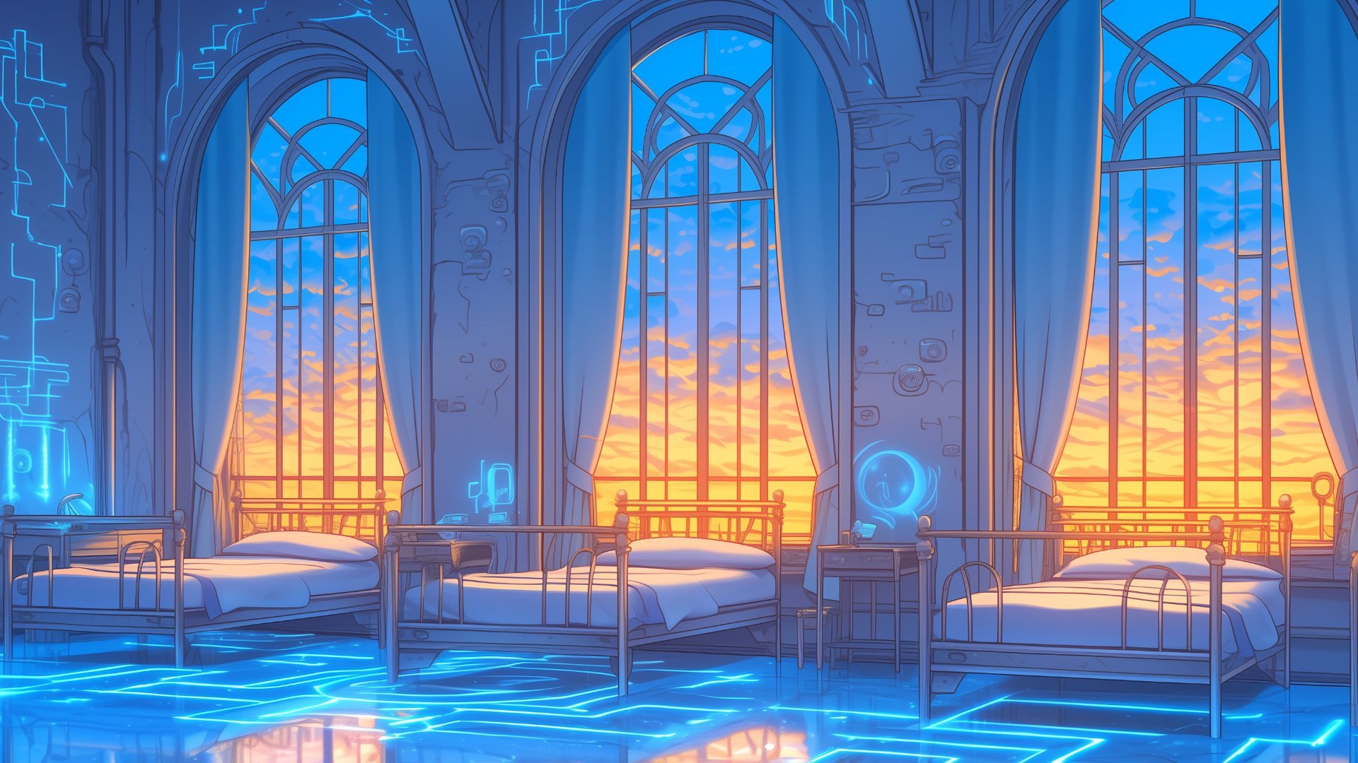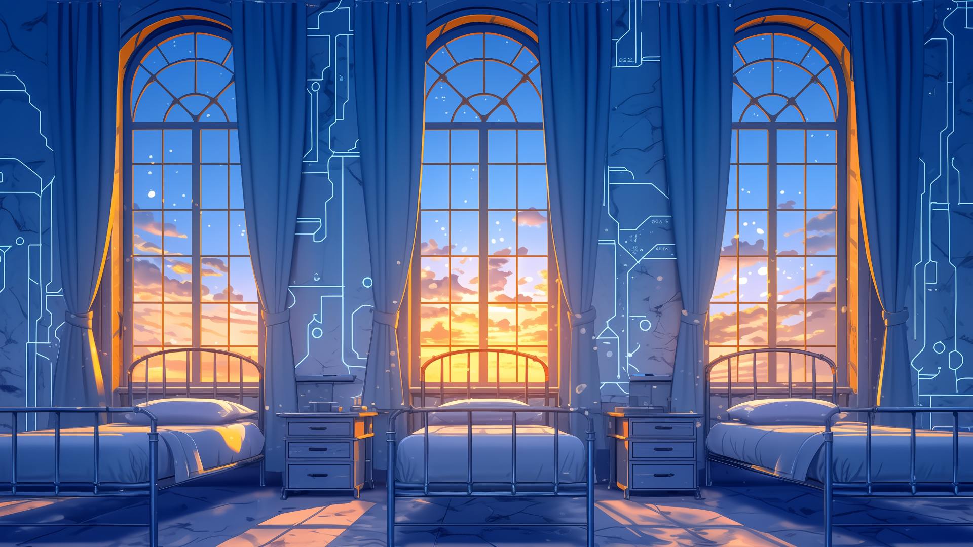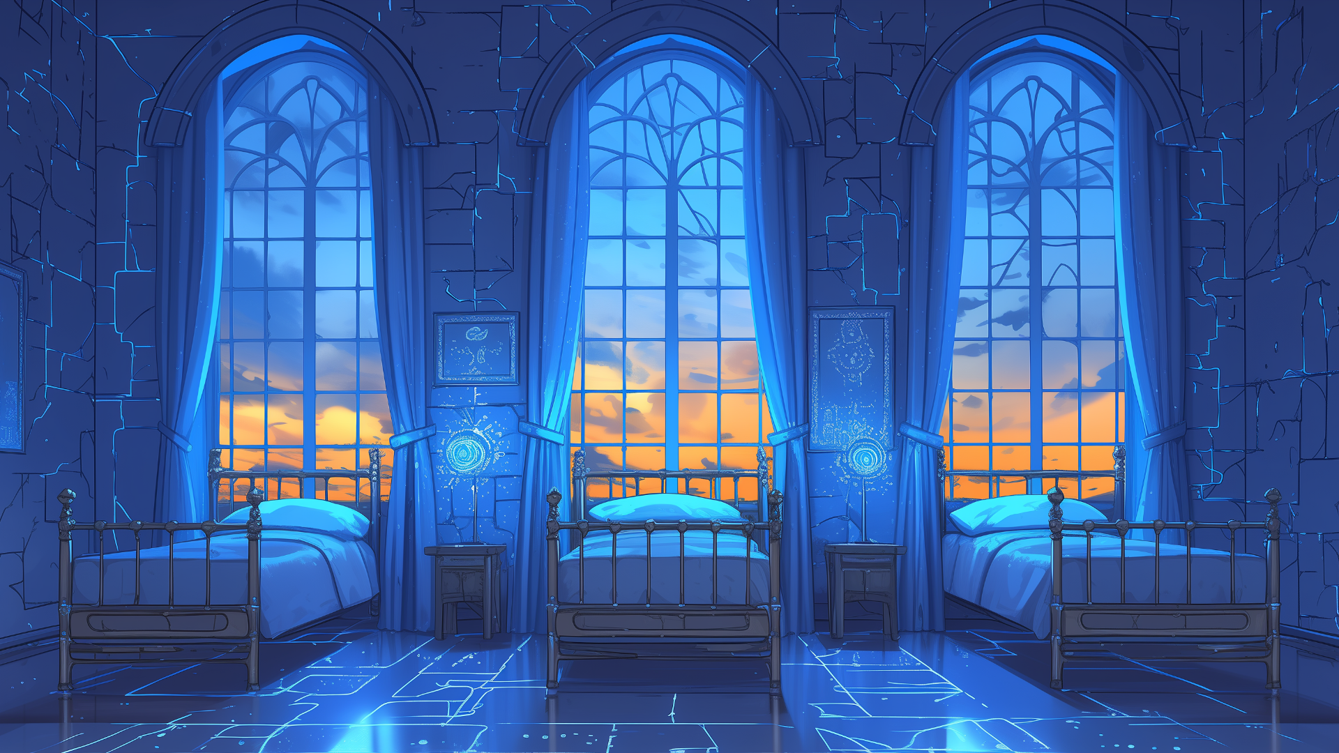 夕焼けの空が鮮やかに映るアーチ型の窓が並ぶ、整然とした三人部屋。壁や床に青い回路が浮かび上がる演出があり、魔導技術や近未来の学園など、TRPGでの幅広い演出に使える背景素材。