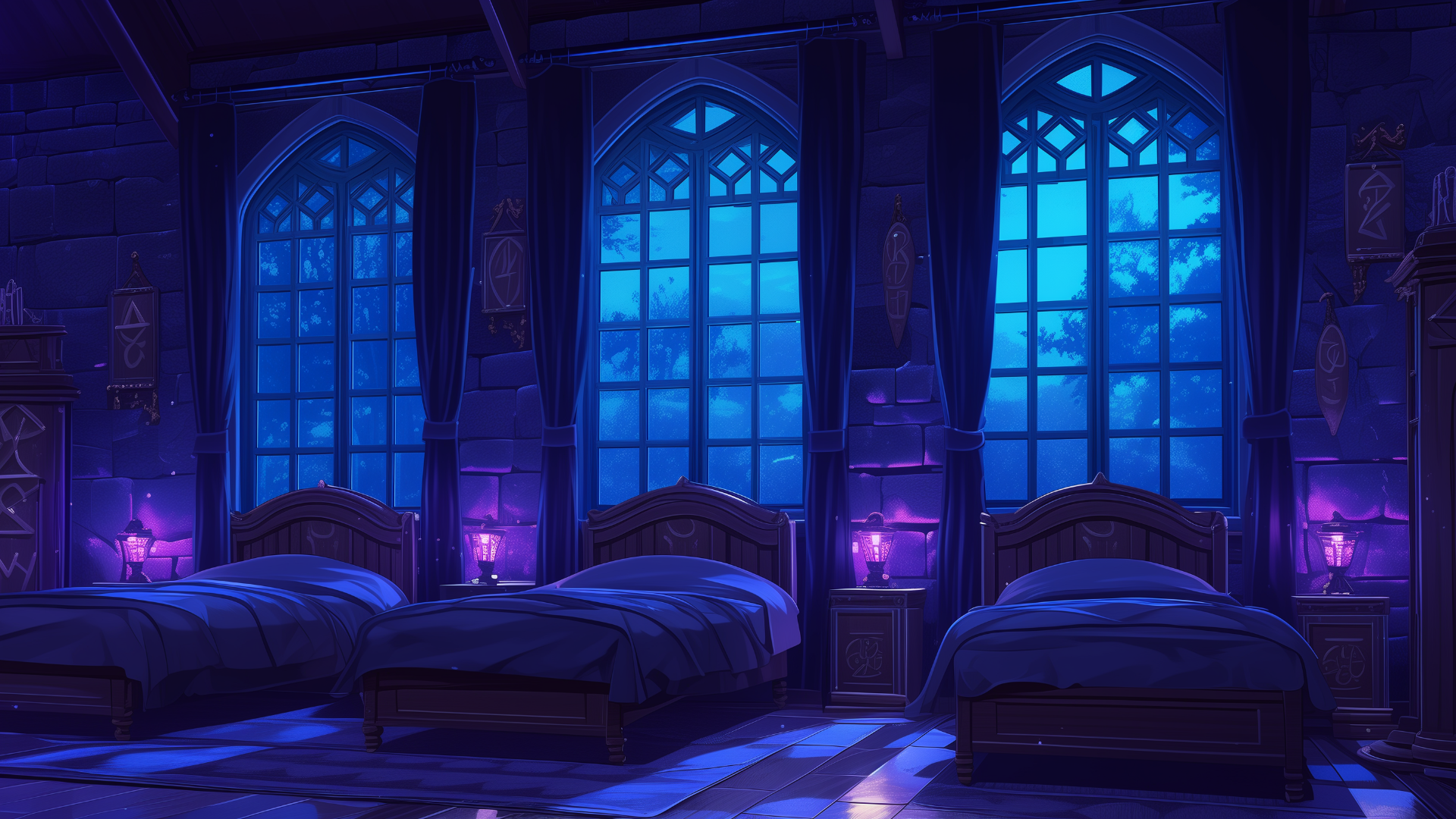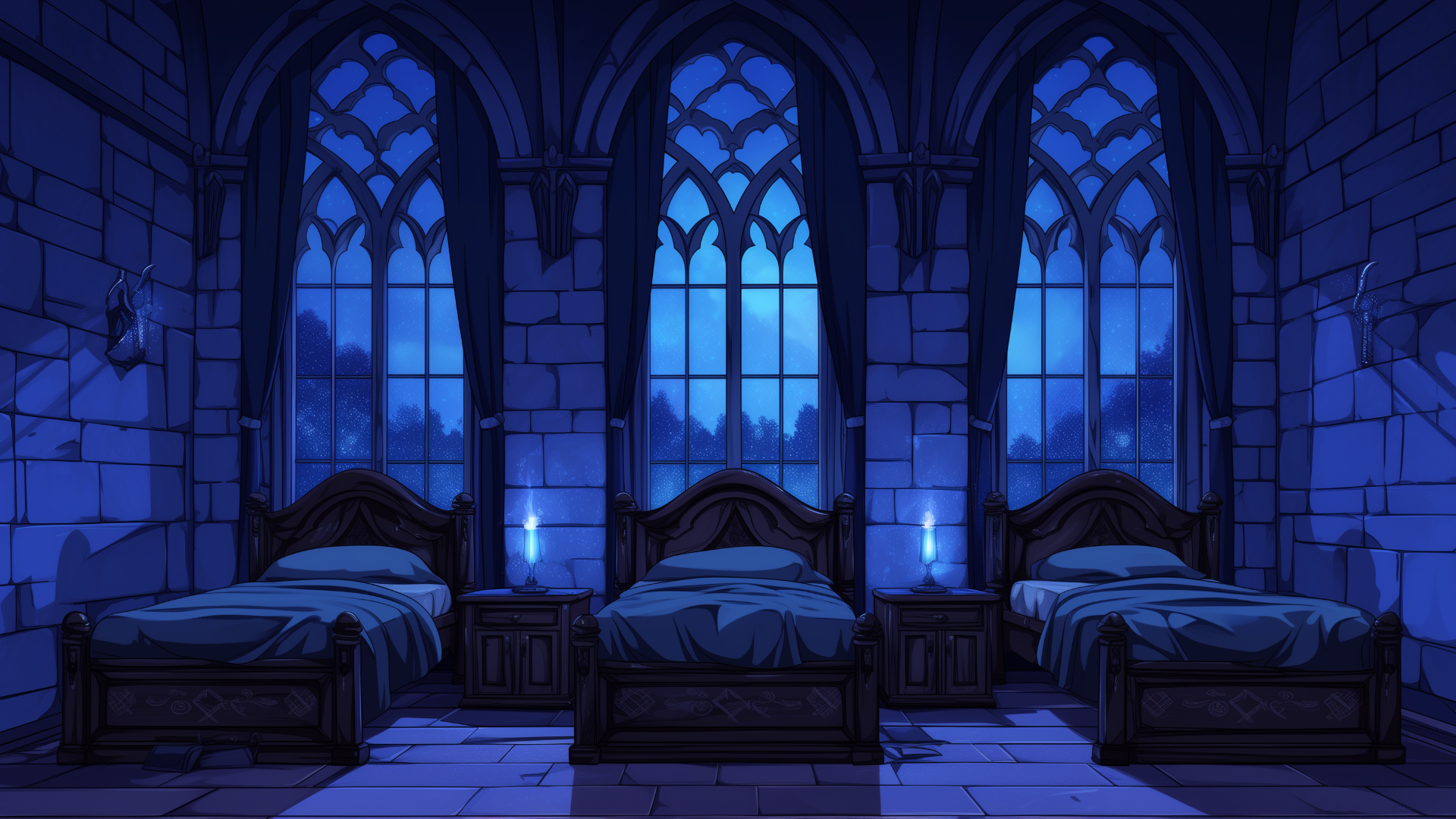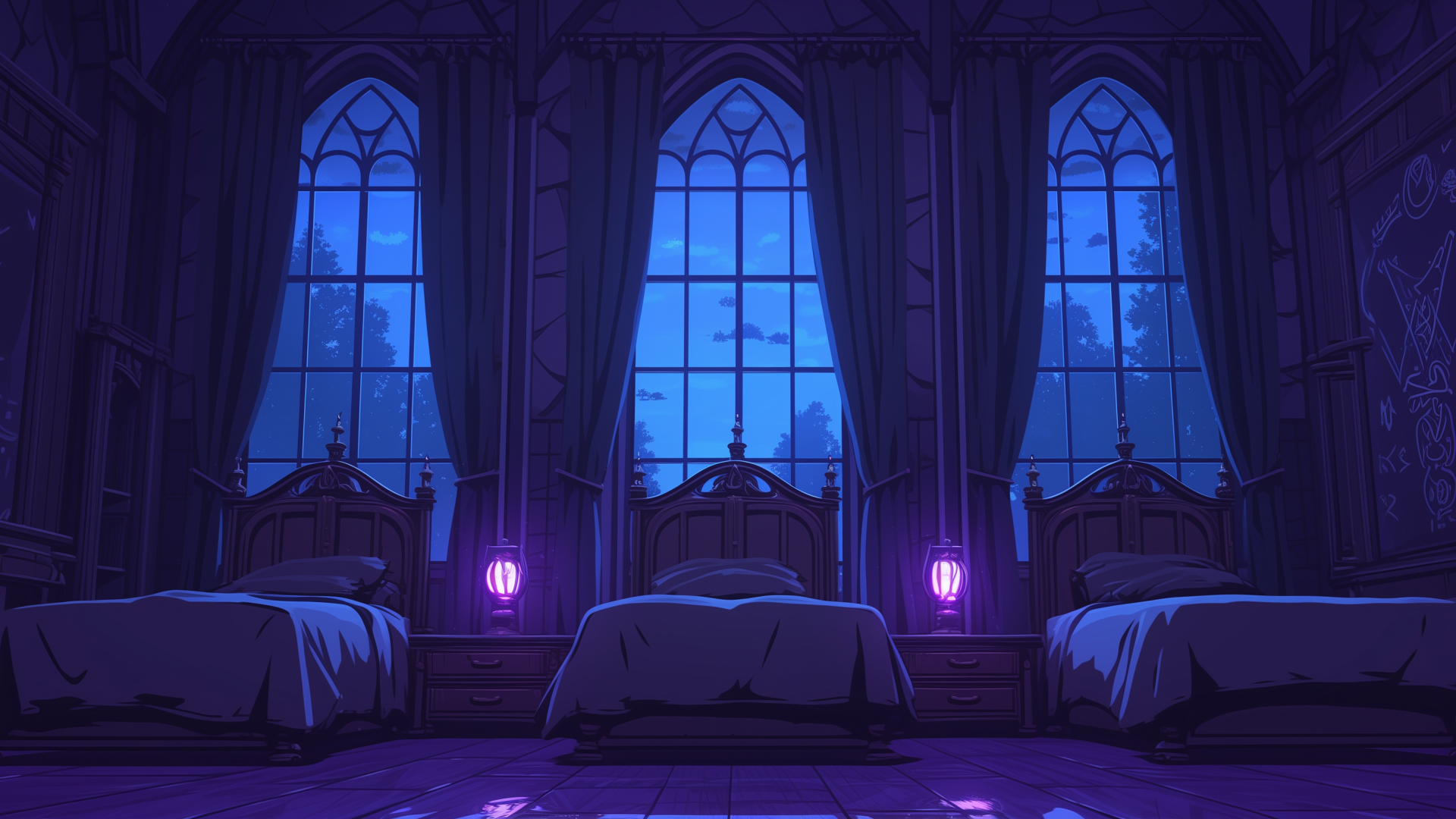 magic-school, dormitory, dark-element, three-person-room, bedroom, night