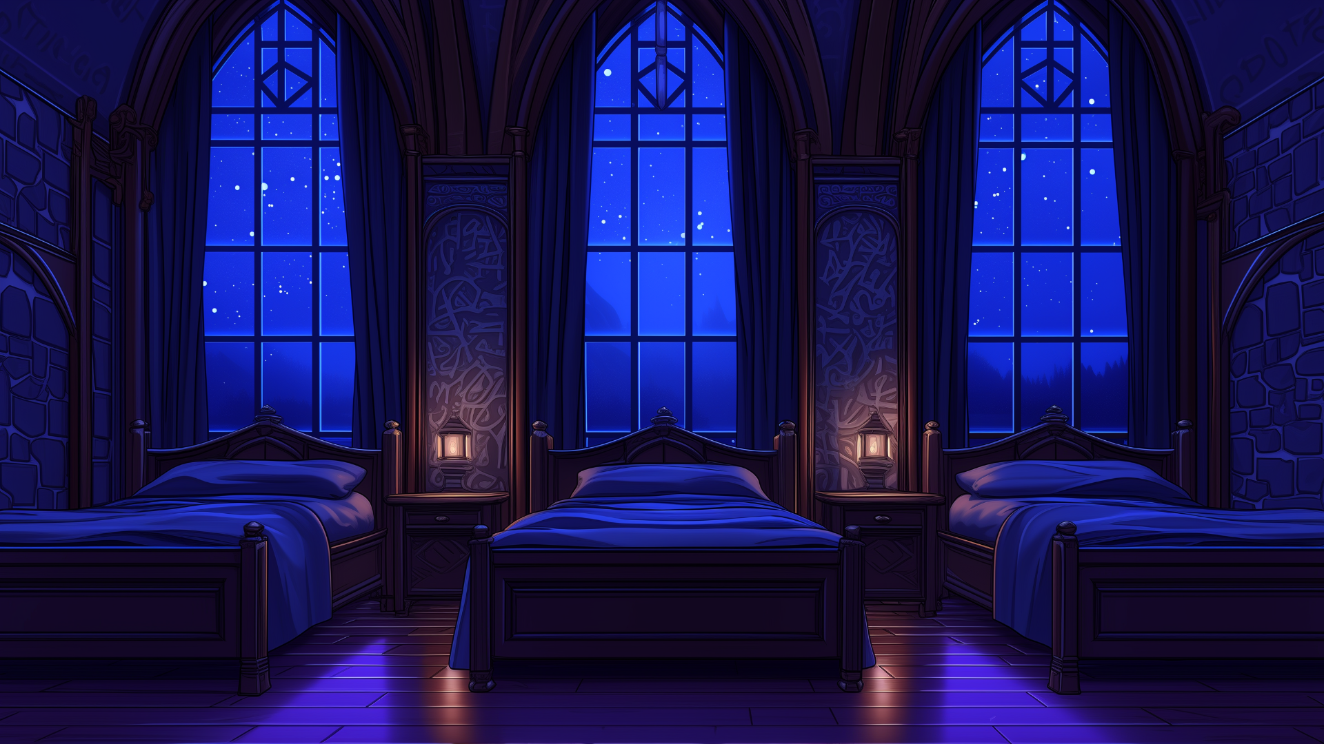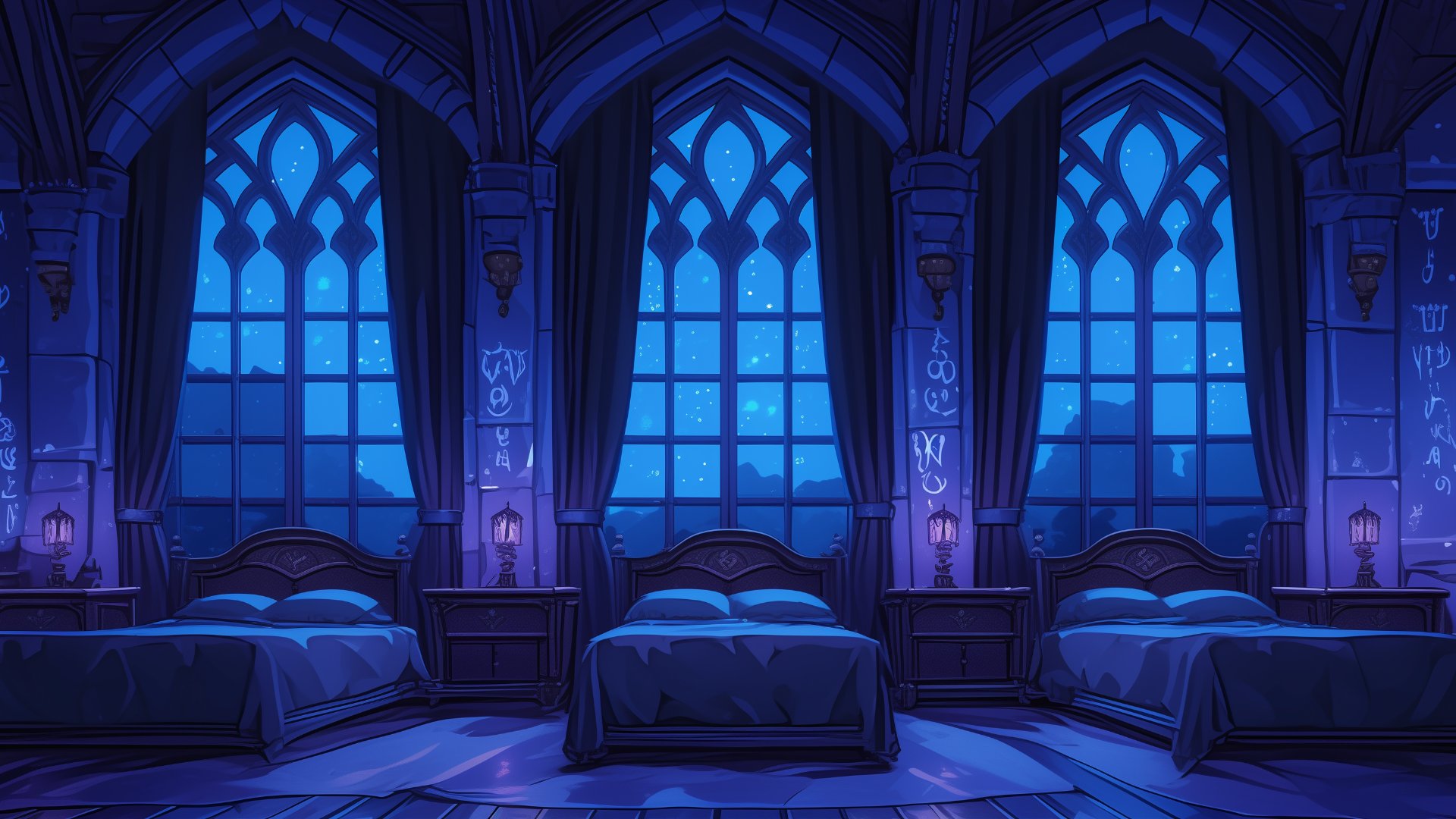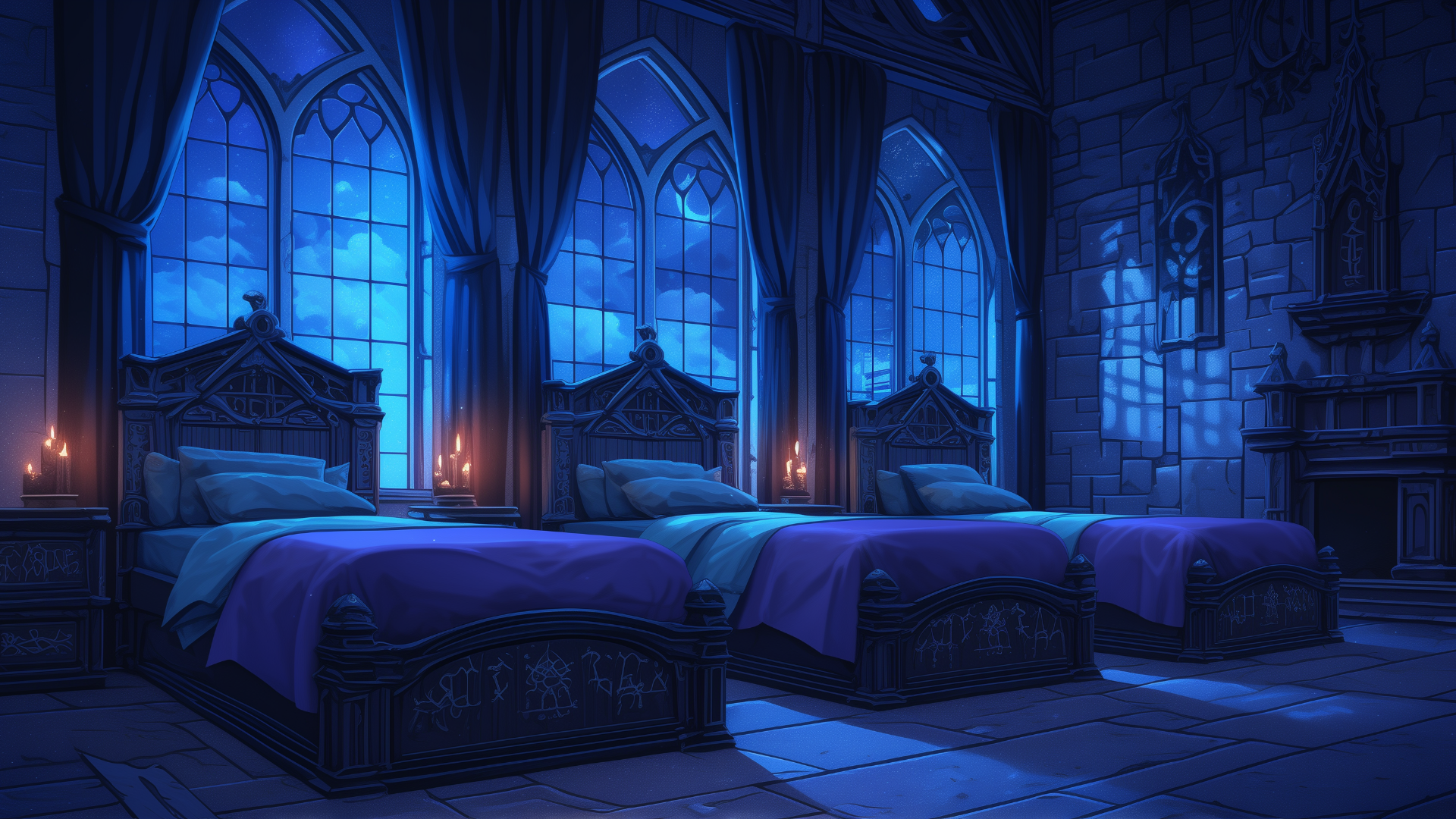 magic-school, dormitory, dark-element, three-person-room, bedroom, night