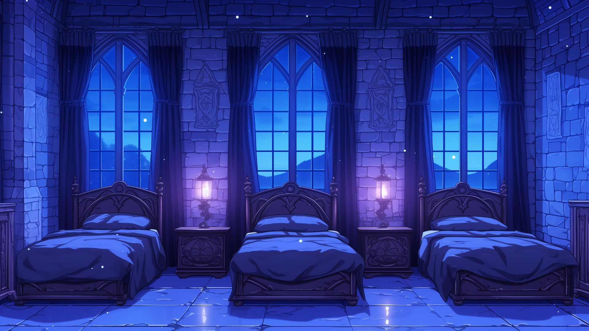 魔法学校の寮(闇属性・夜)、3人部屋のフリー背景素材です。