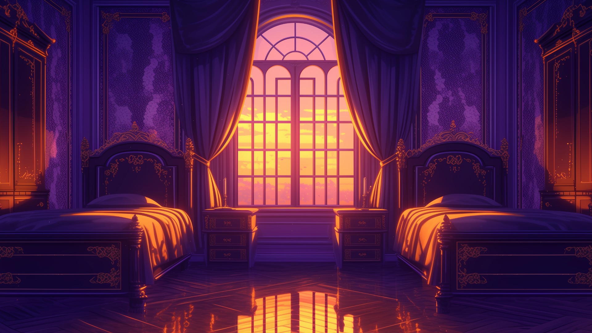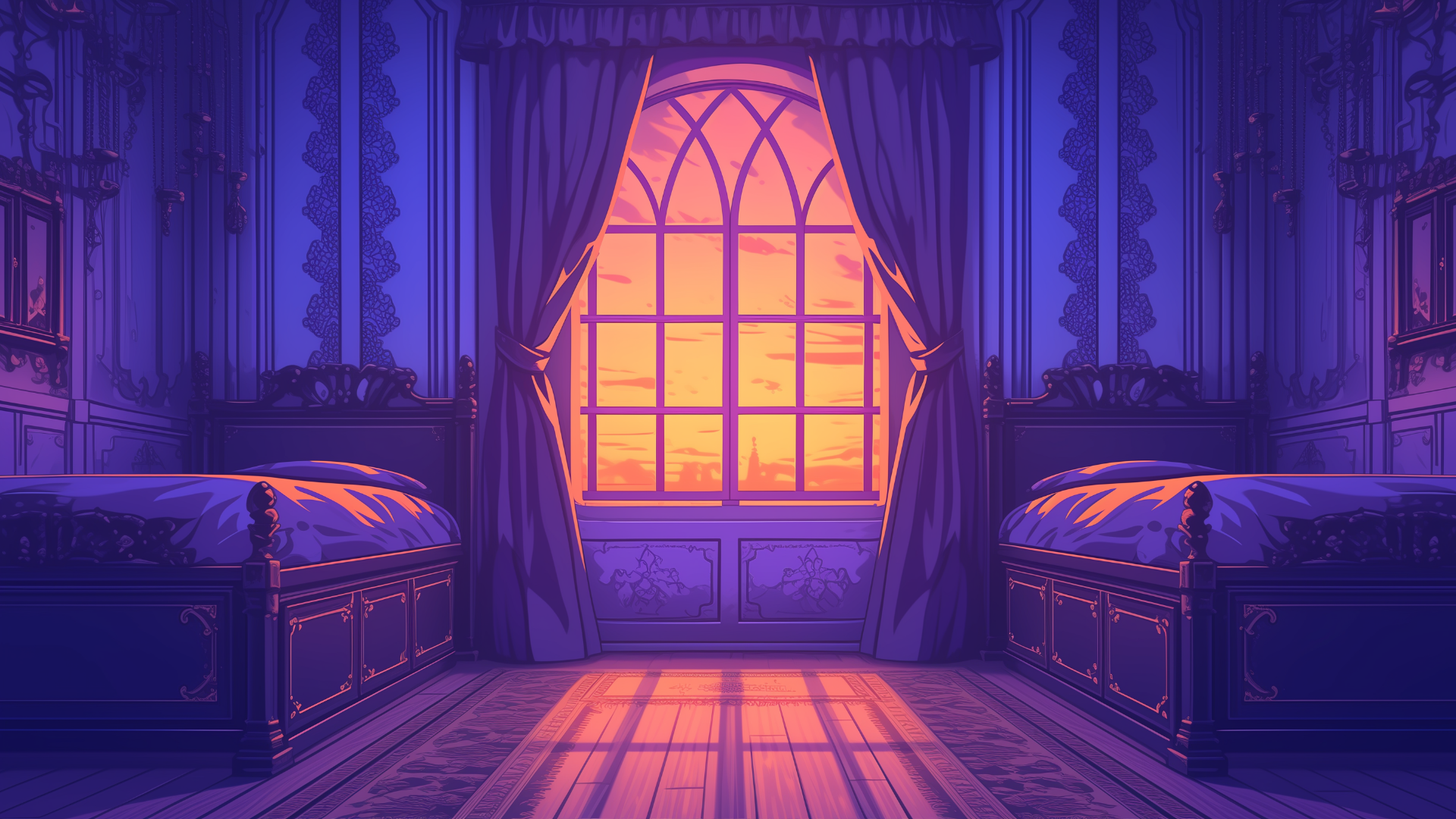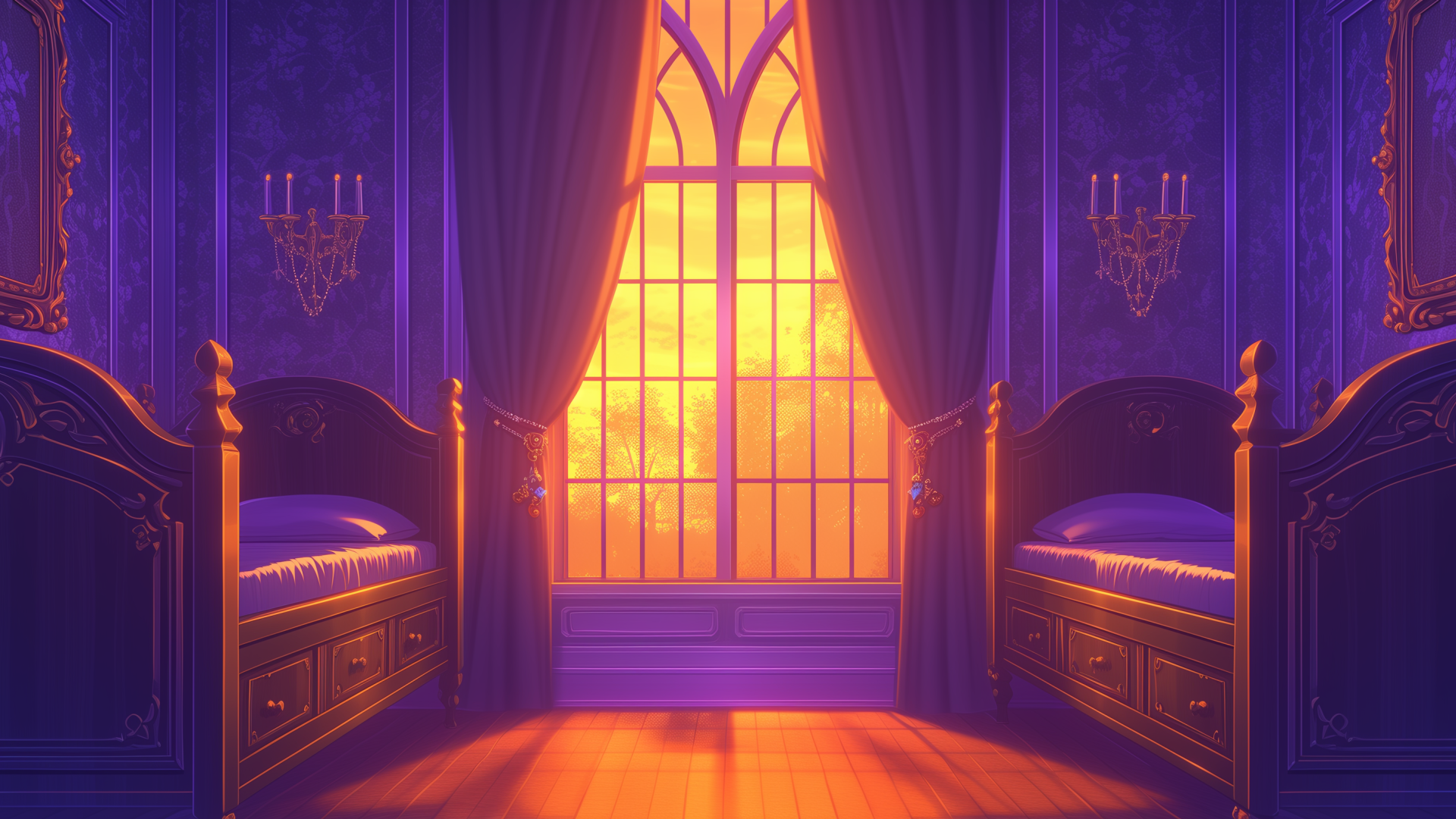 魔法学校の寮(闇属性・夕方)、2人部屋のフリー背景素材です。