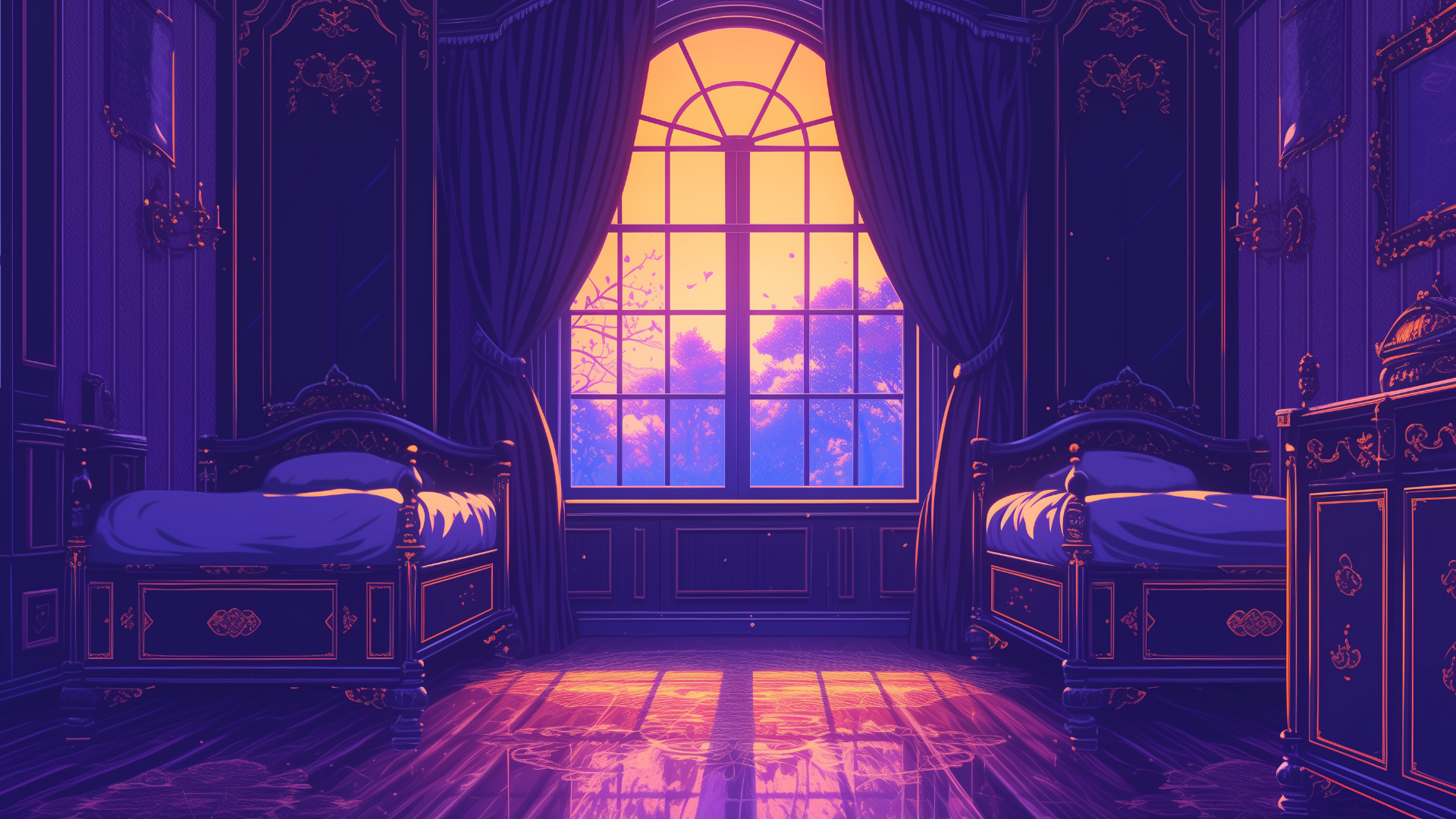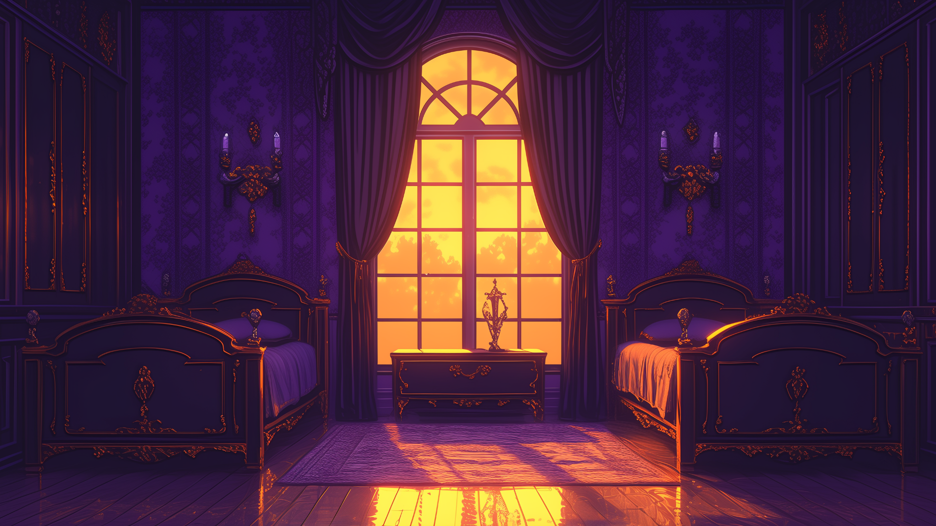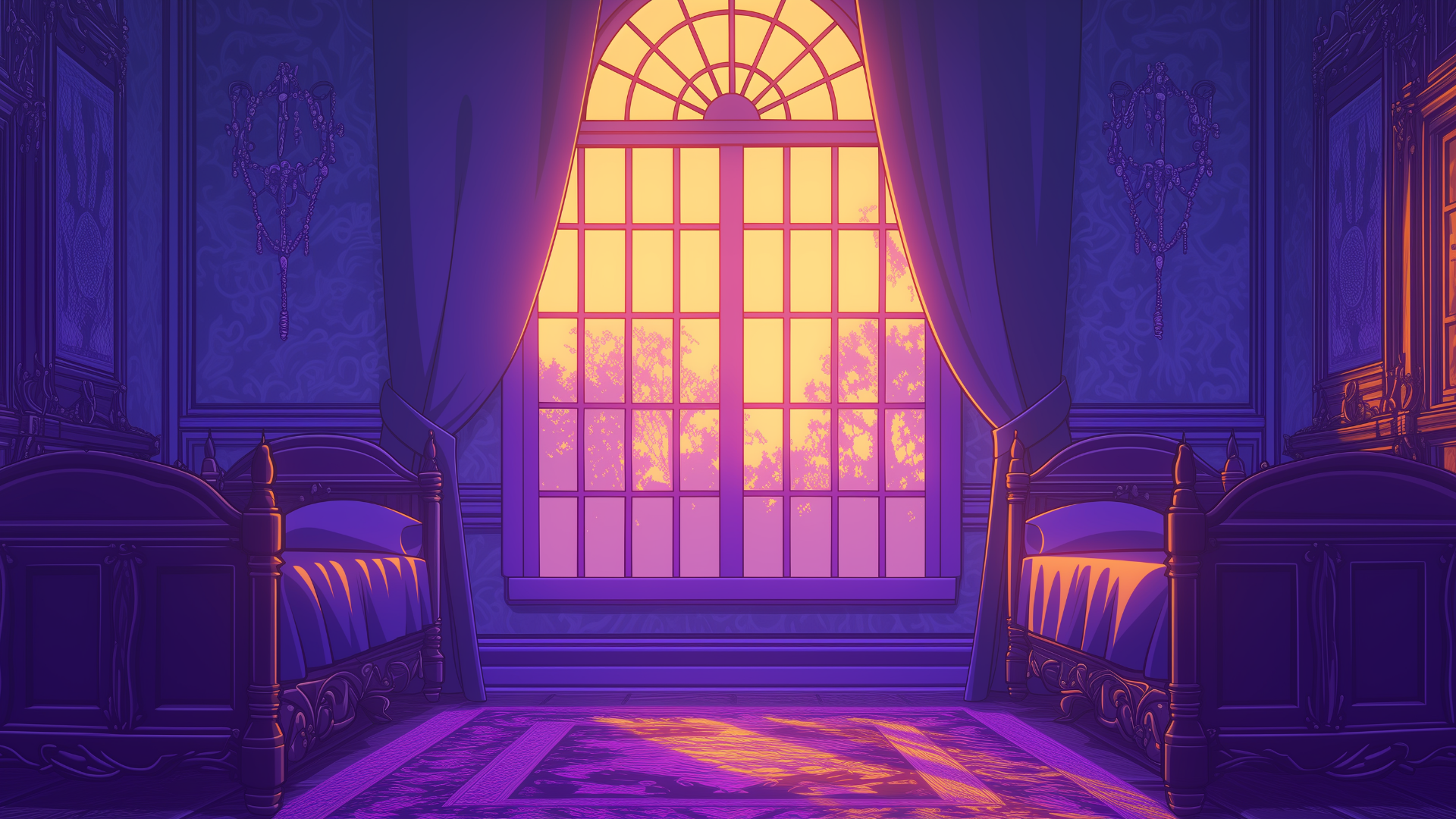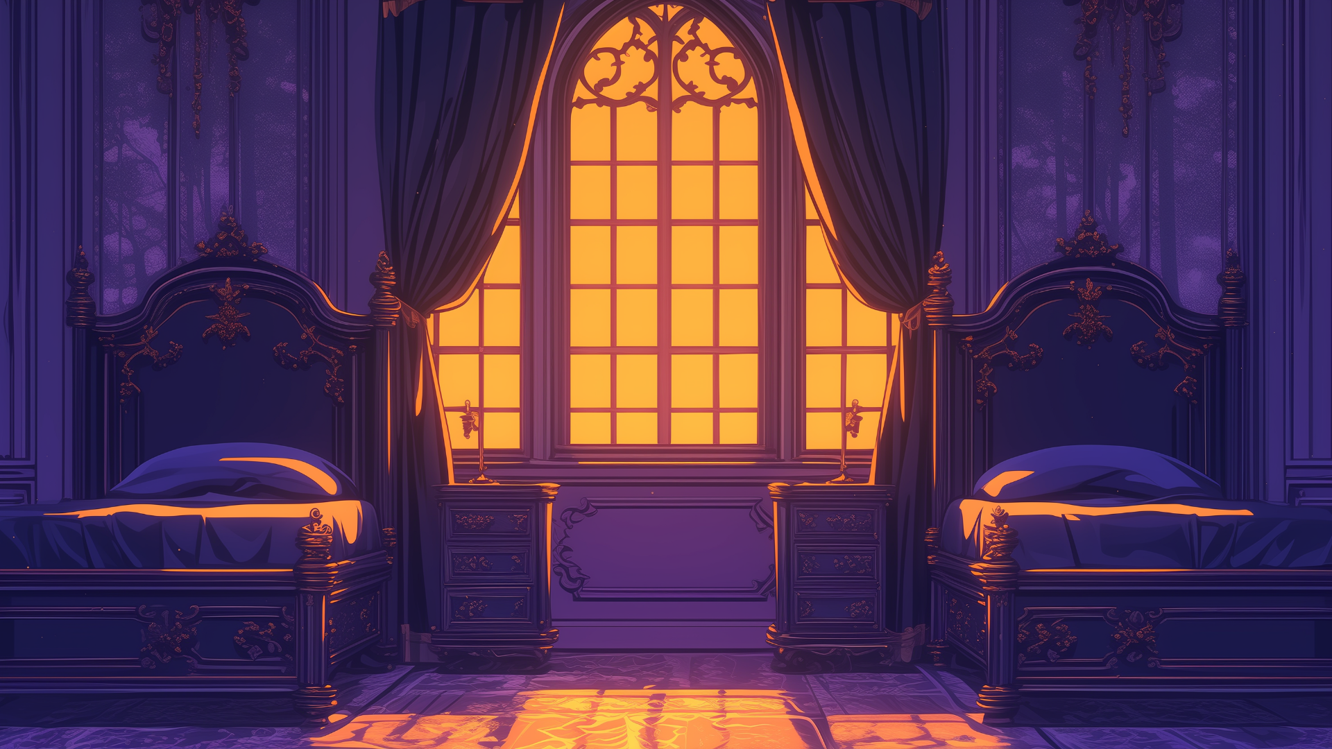 magic-school, dormitory, dark-element, two-person-room, bedroom, evening