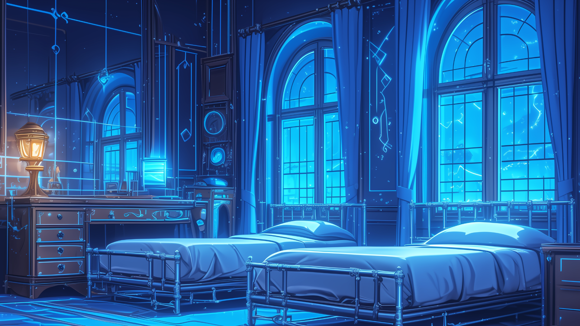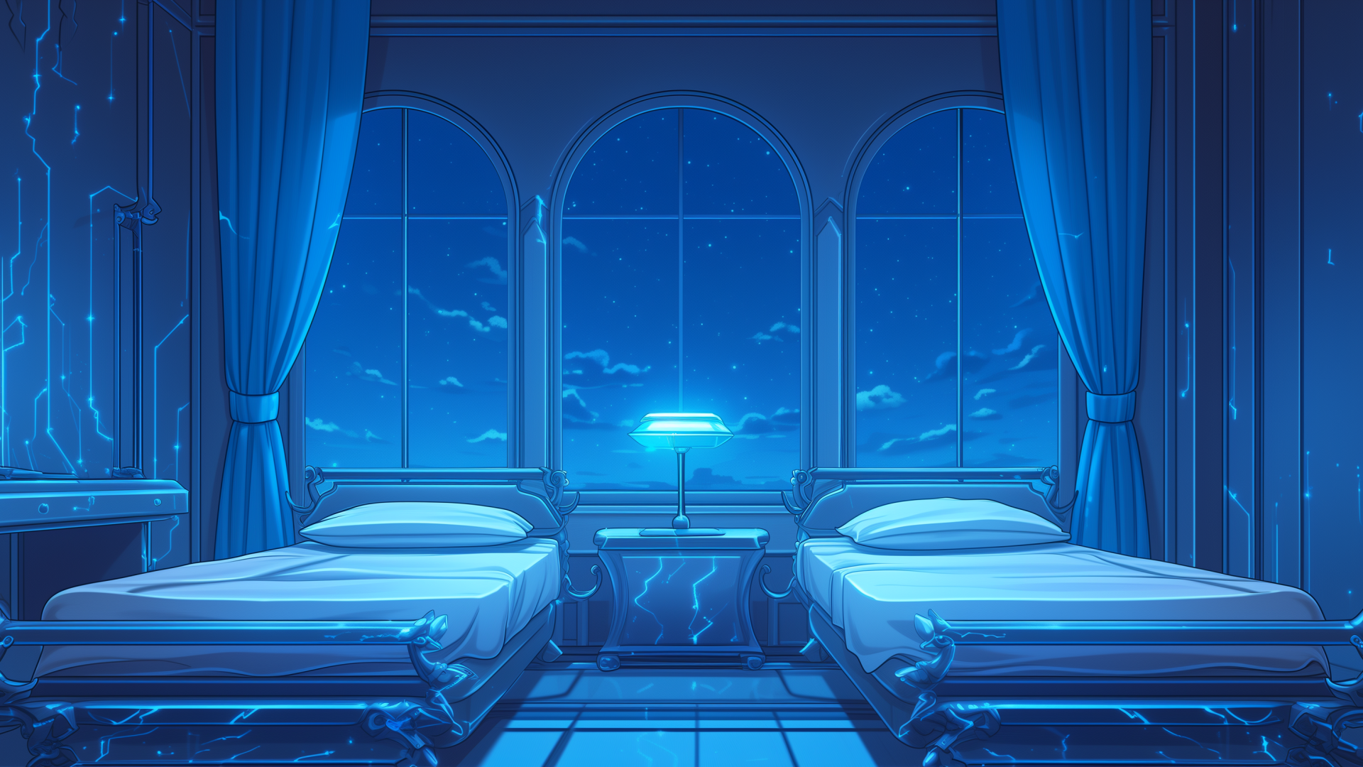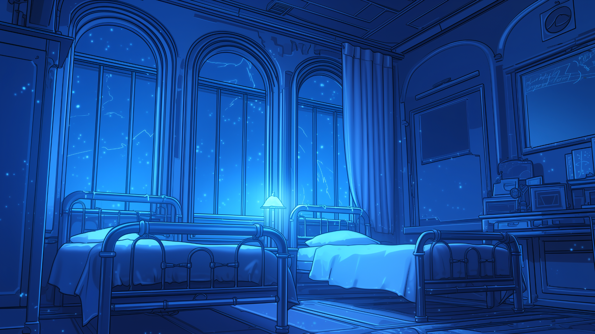 青と白を基調とし、壁面には稲妻模様が走る印象的な夜の寮部屋。天候の変化や雷系の魔法を扱う設定にマッチ。未来的な魔法学園や異能バトル系のTRPGに適した背景画像。