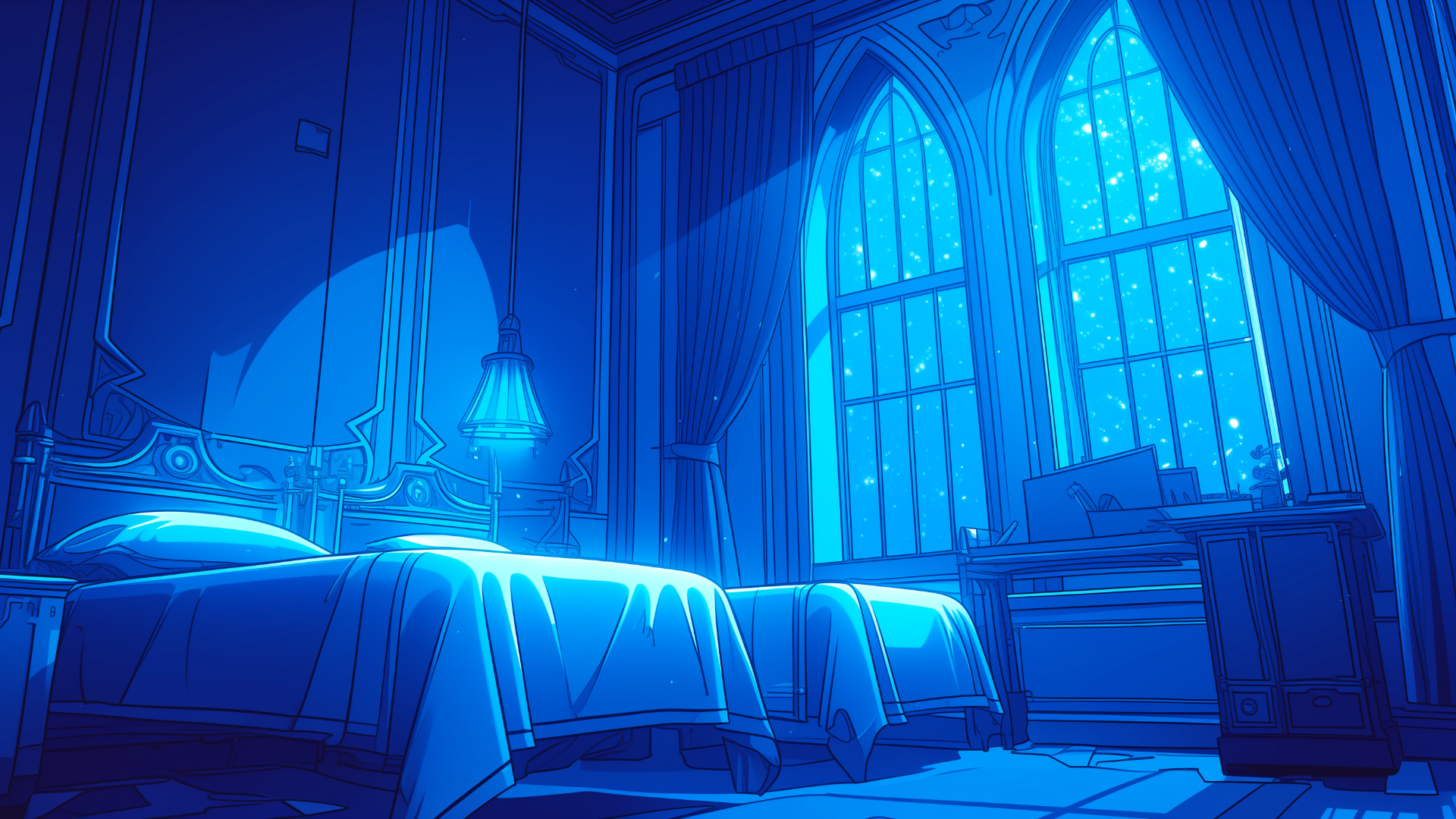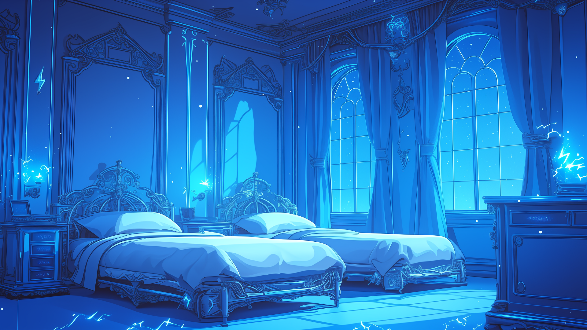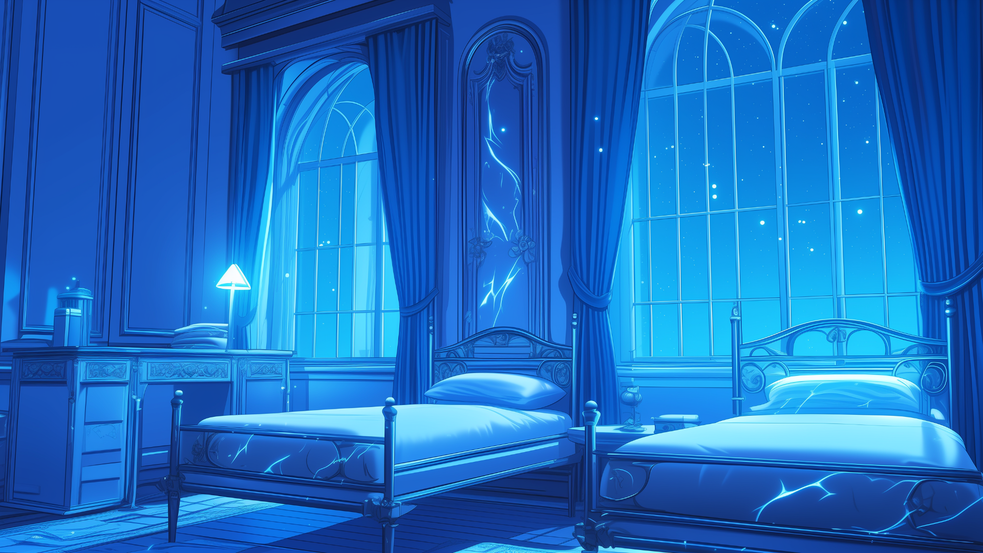 magic-school, dormitory, lightning-element, two-person-room, bedroom, night