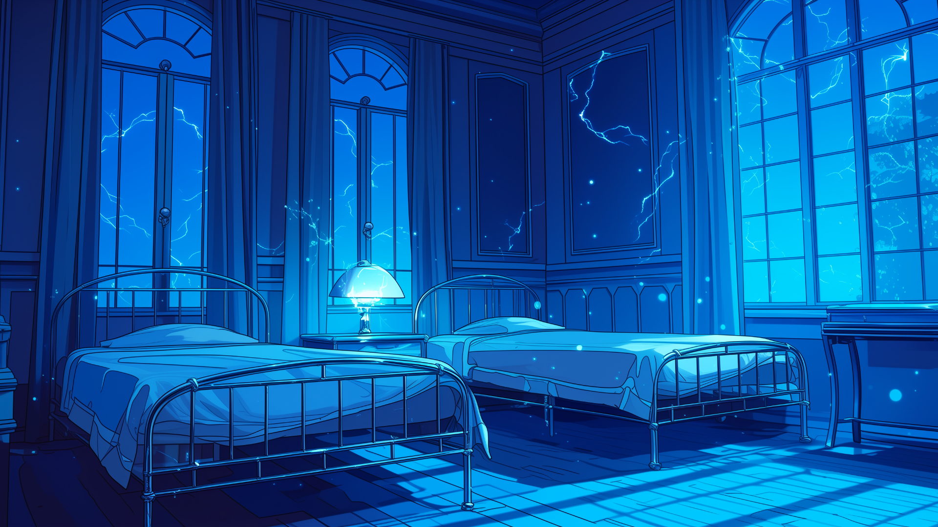 部屋中に雷の閃光が浮かぶような演出が施され、緊張感のある雰囲気が広がる。古めかしい寮の構造と、電気を象徴する効果が融合した不思議な空間。研究者の部屋や暴走する力の拠点などに使えるTRPG向け素材。
