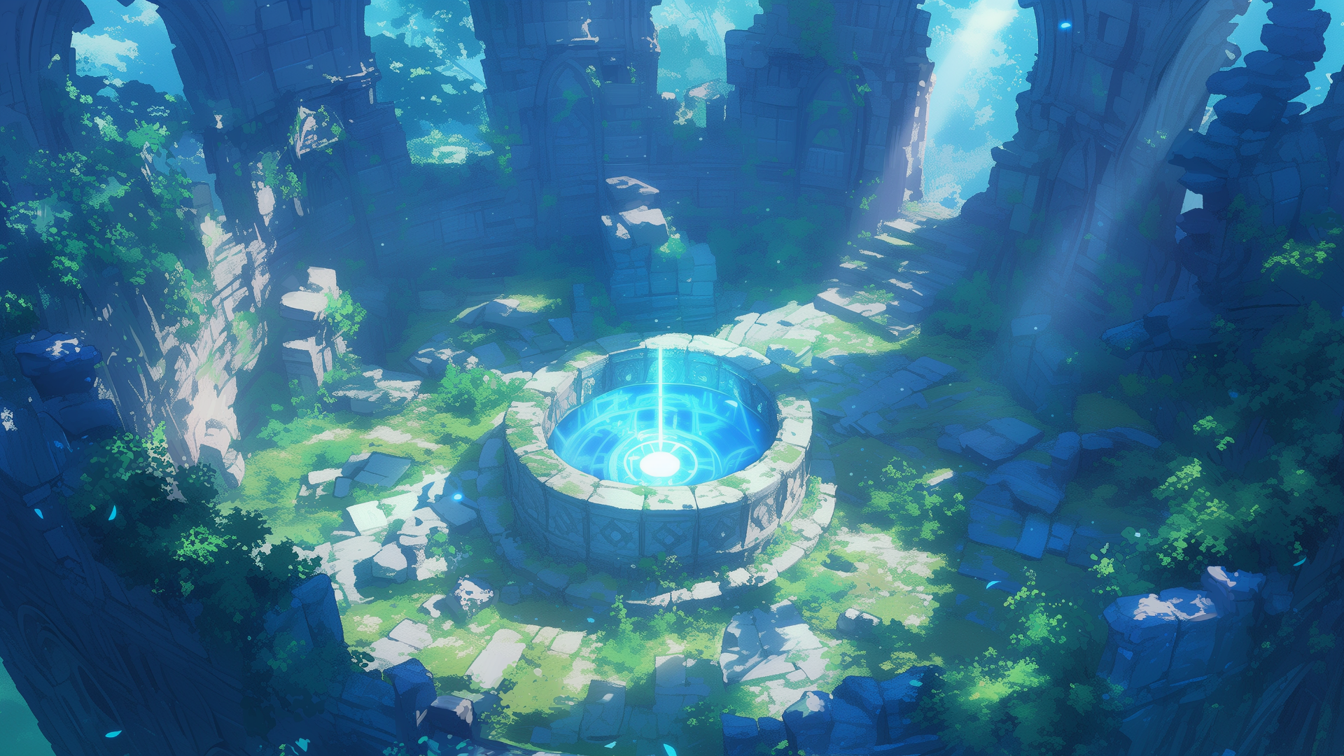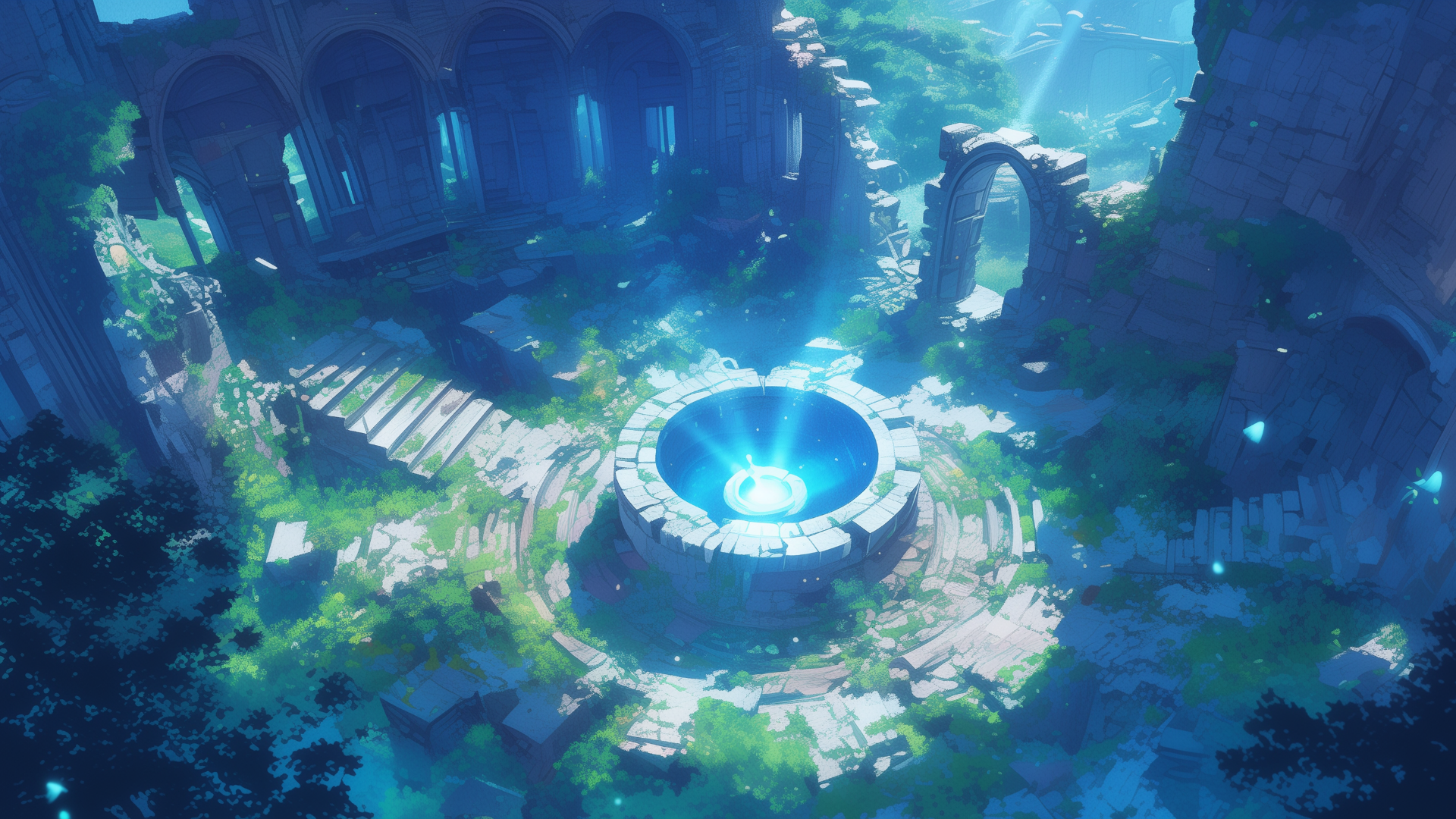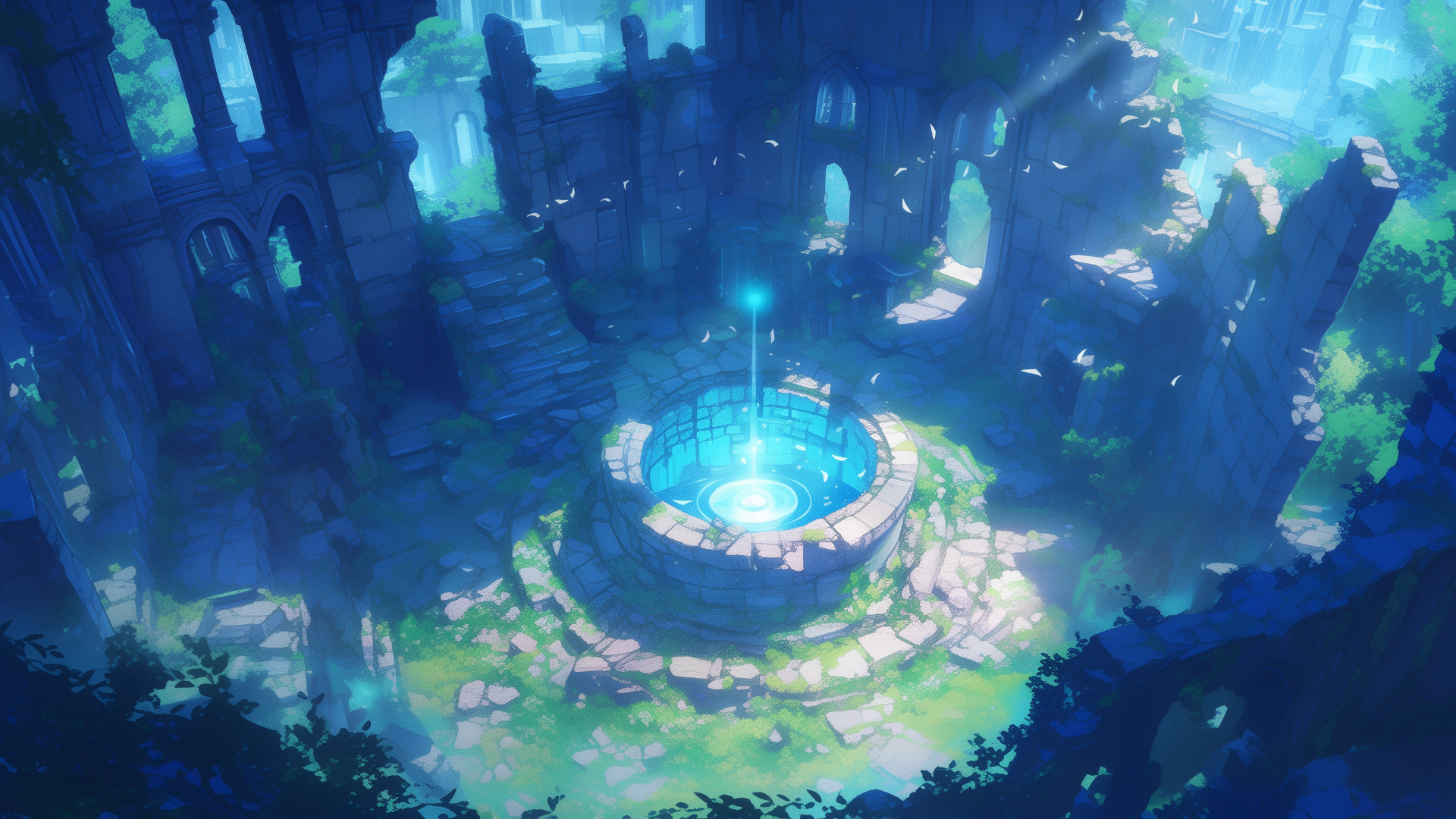 遺跡の広場のような場所で光る泉のフリー背景素材です。