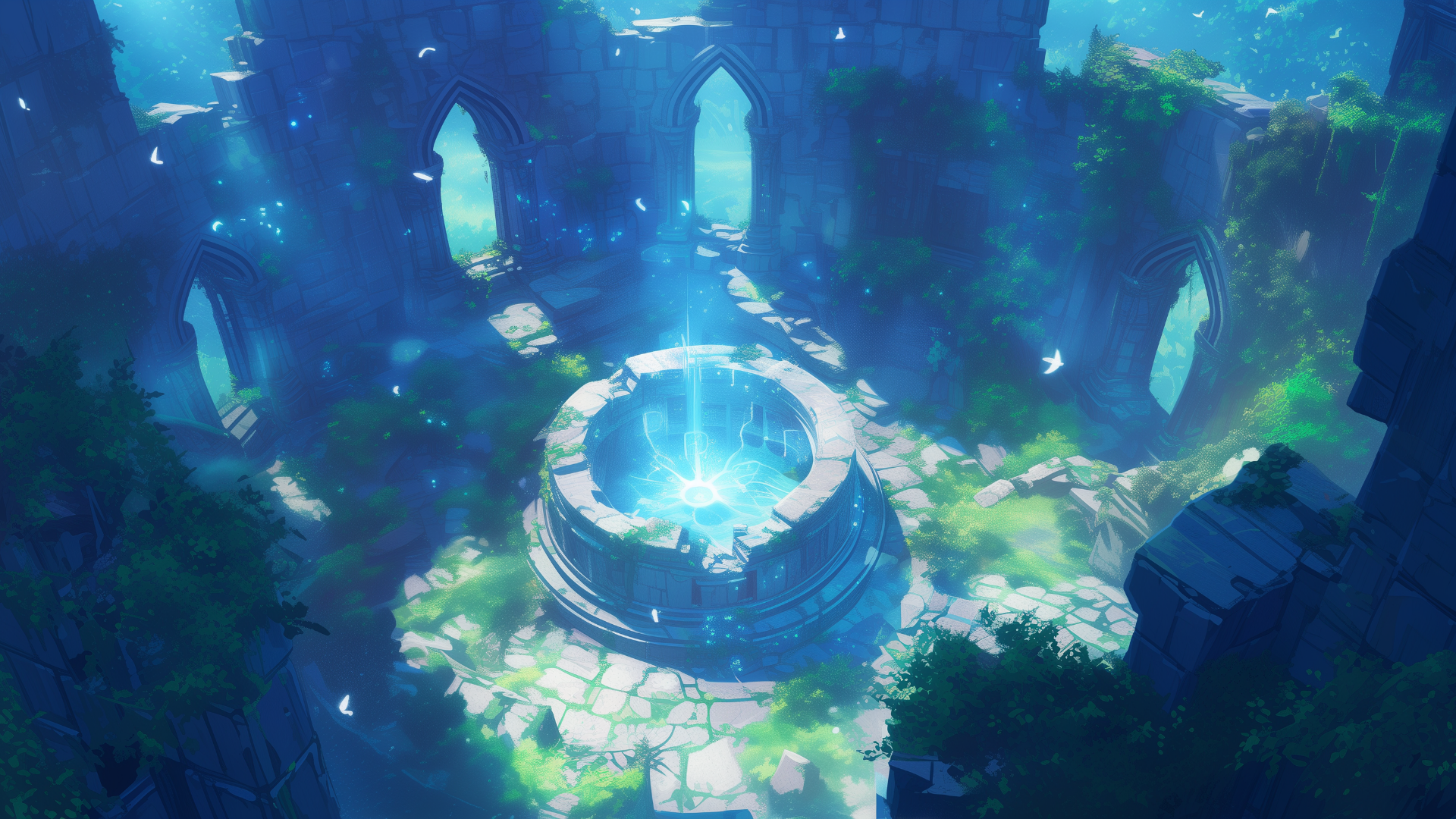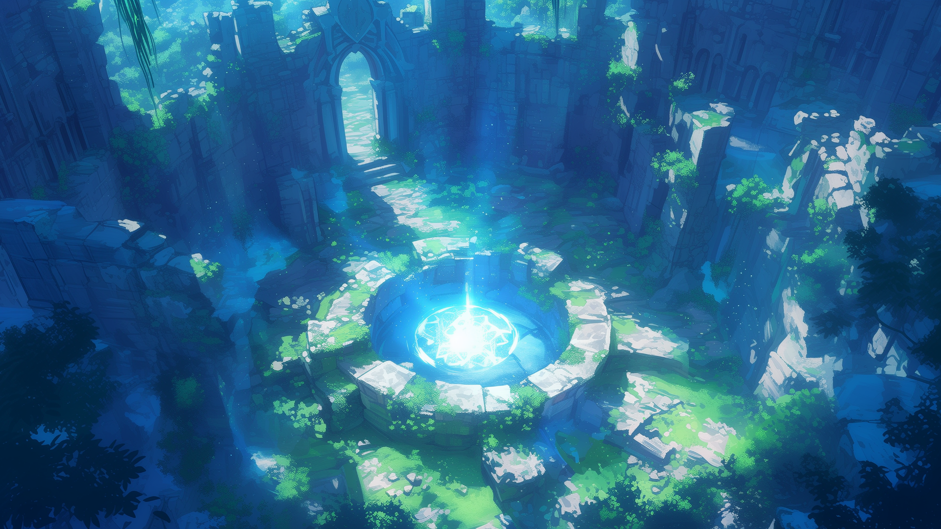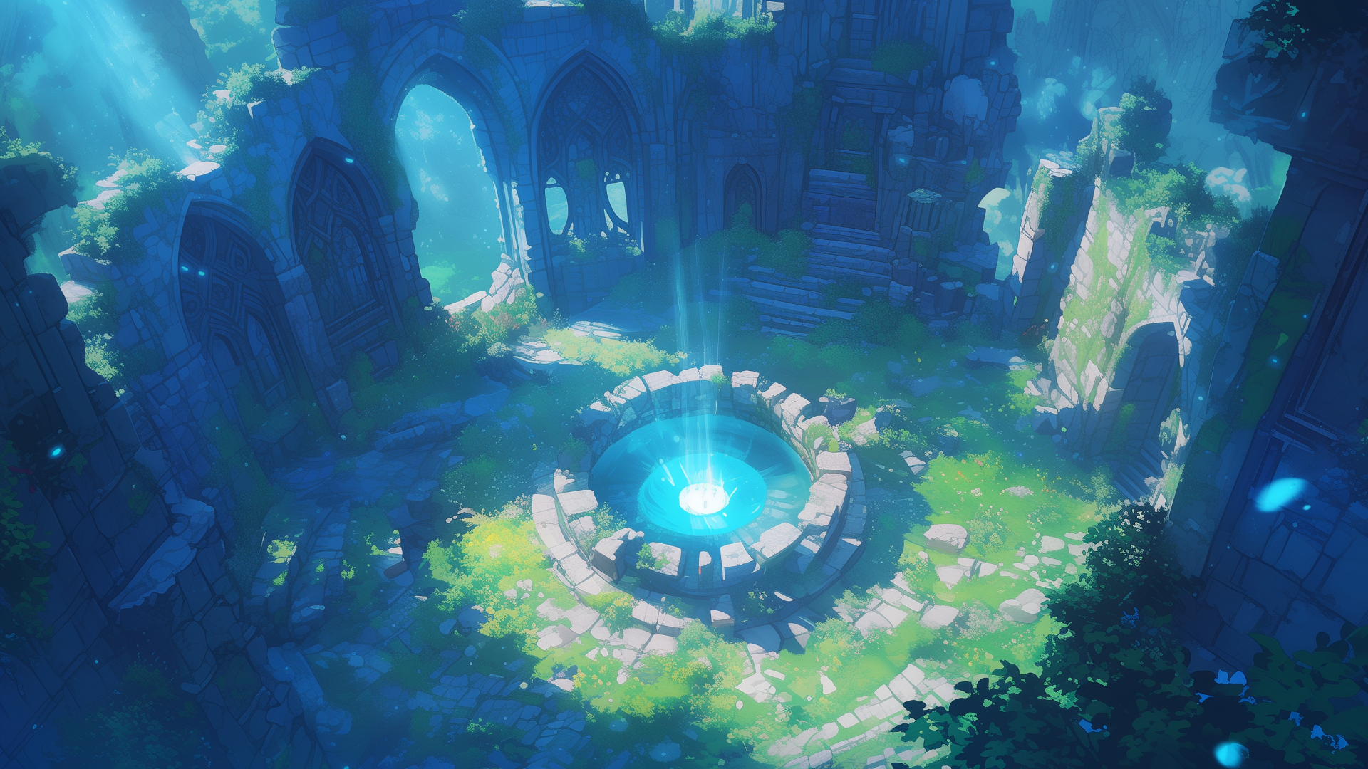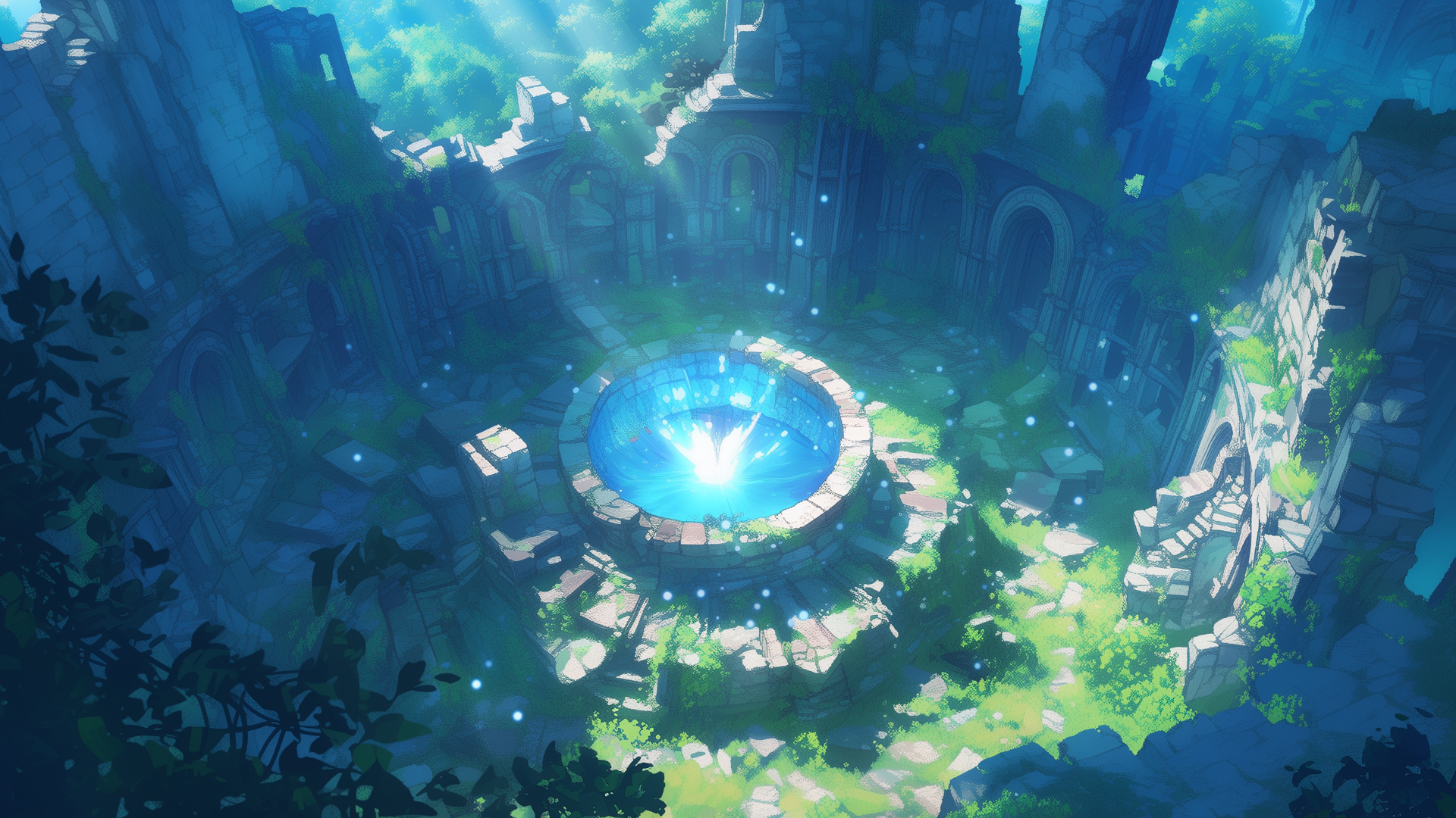 遺跡の広場のような場所で光る泉のフリー背景素材です。