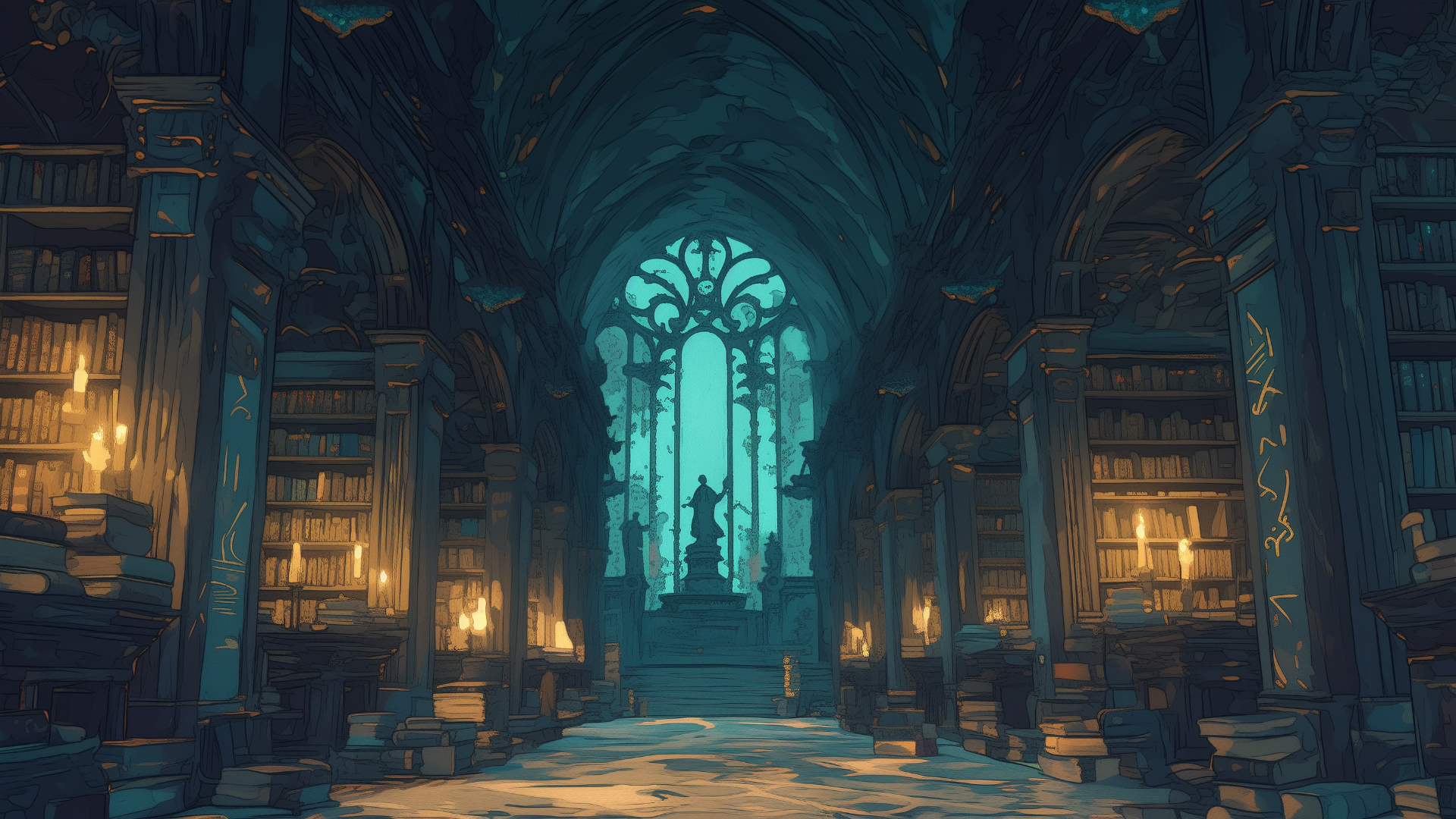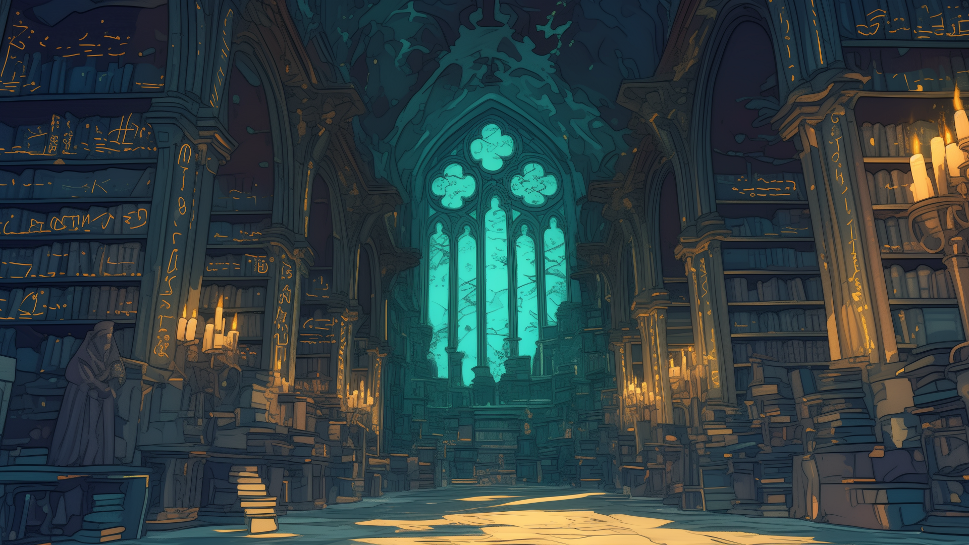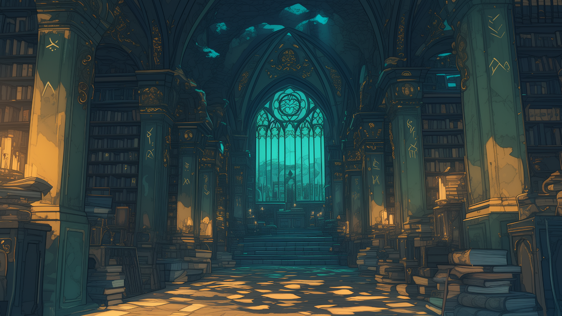 bookshelves, underground, stained-glass, cathedral-architecture, ruins