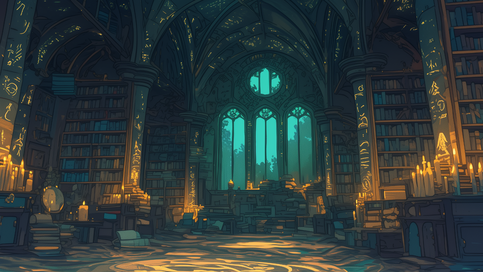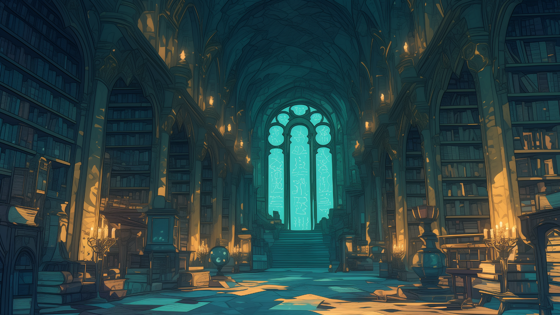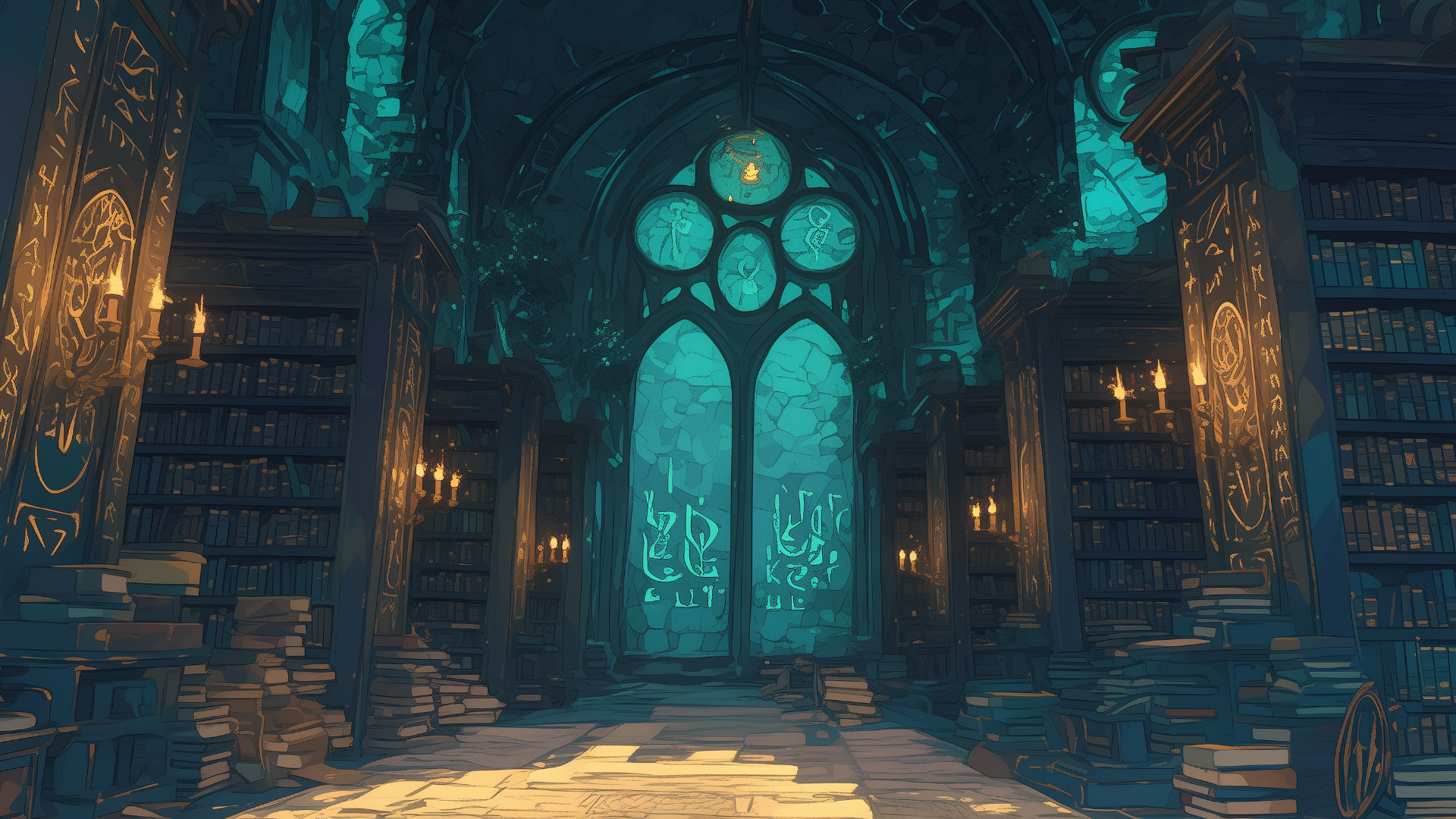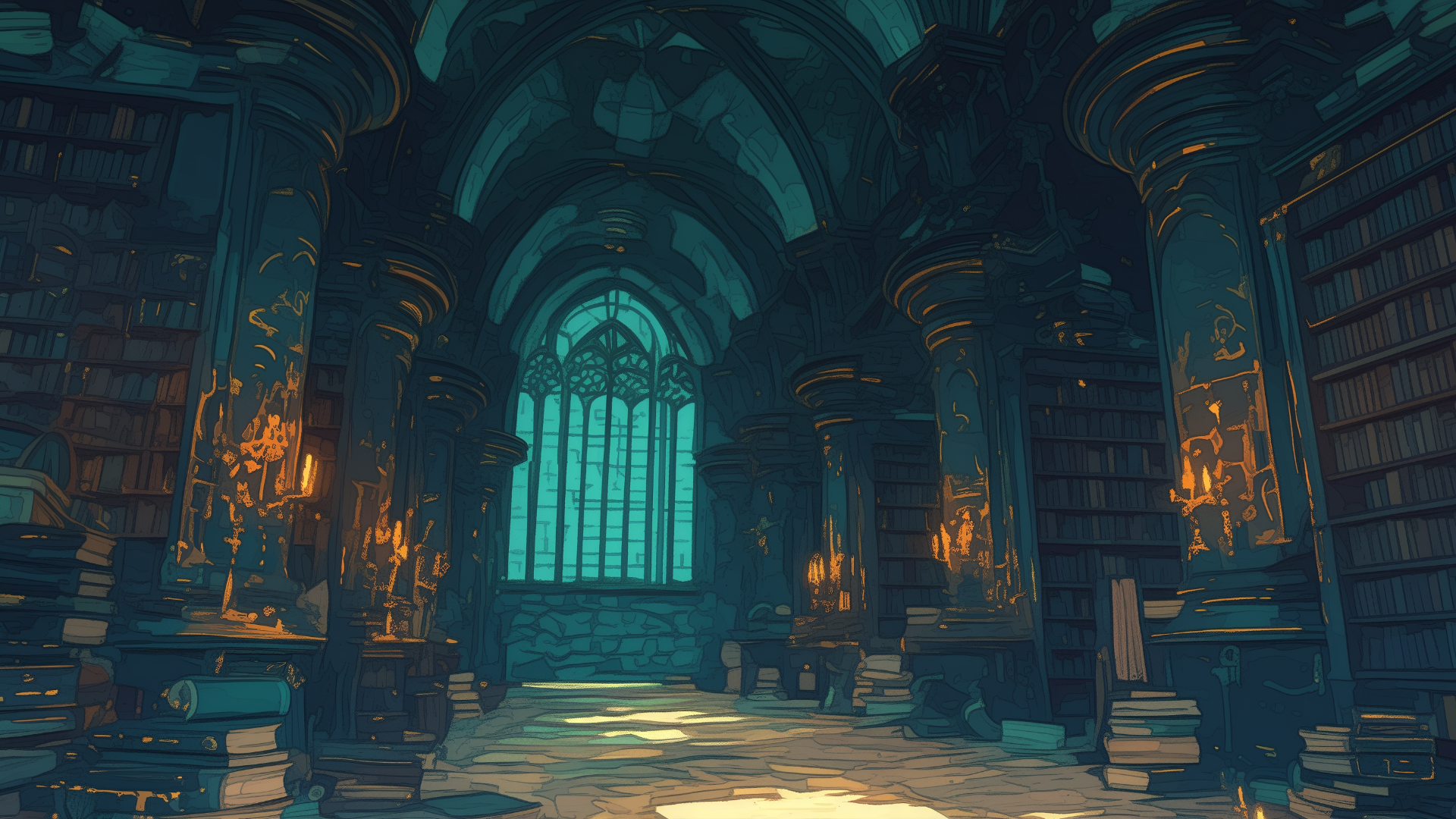 bookshelves, underground, stained-glass, cathedral-architecture, ruins