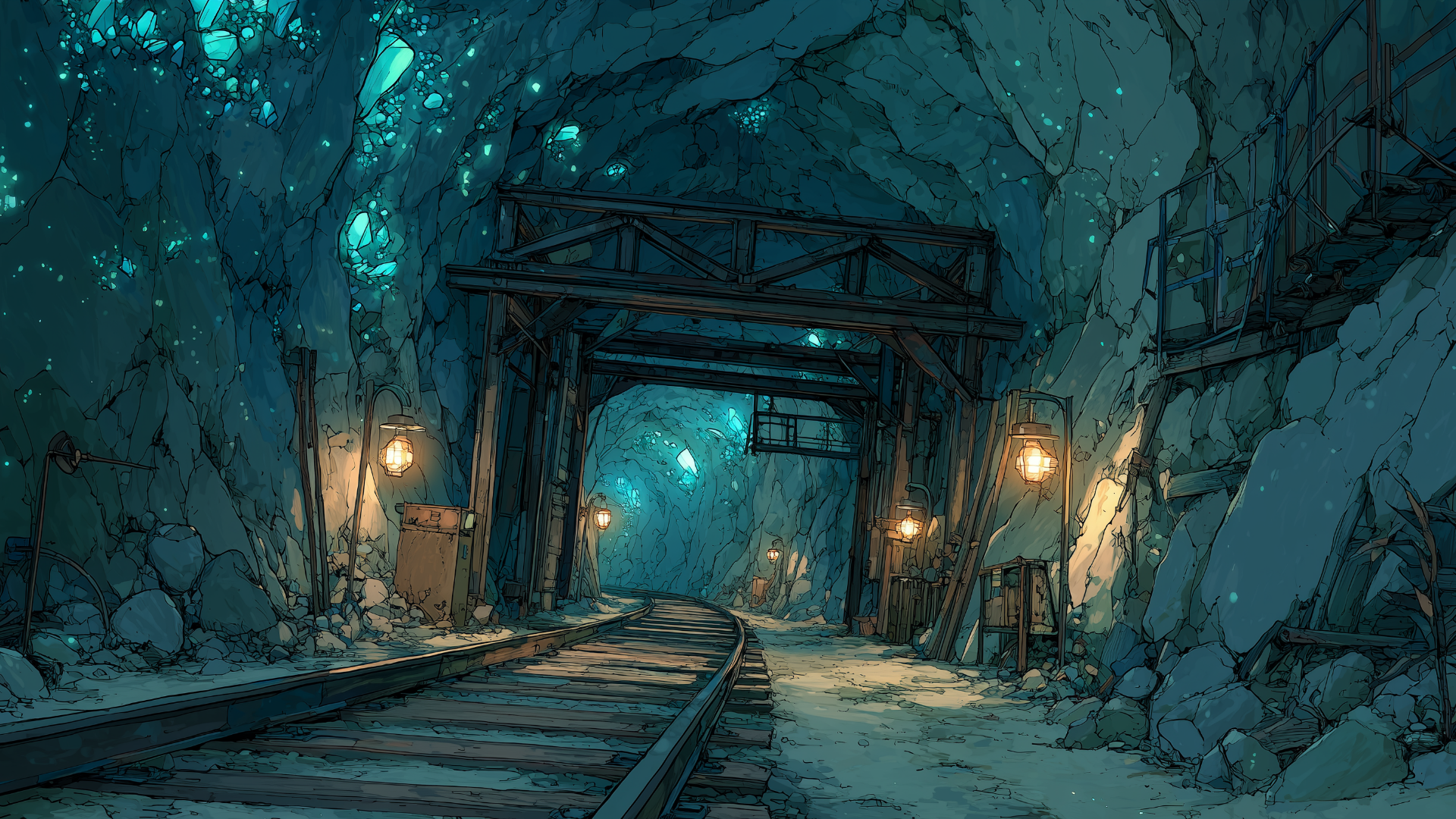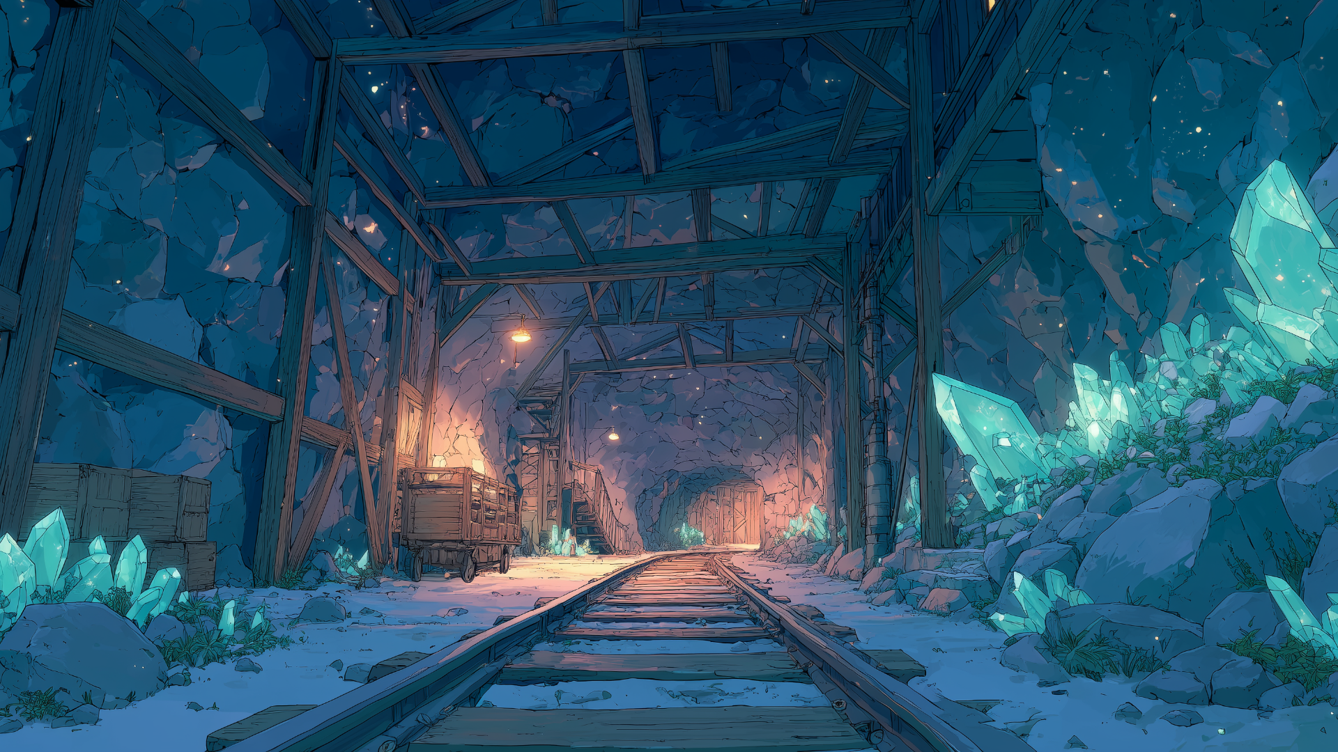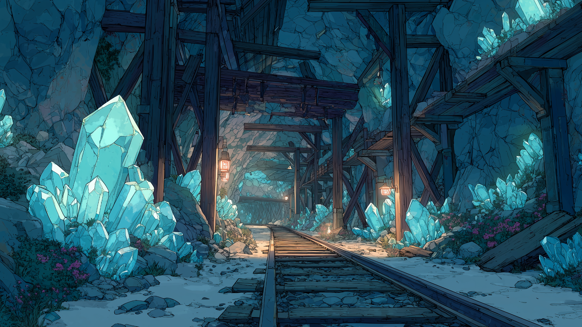 真っ直ぐに伸びる坑道には木製の梁が規則正しく並び、青白い魔石が静かに輝いている。灯火の光が結晶の冷たい色を和らげ、奥行きのある景色を作り出す。ファンタジーTRPGの探索導入やクエスト開始シーンに使えるフリー背景素材。
