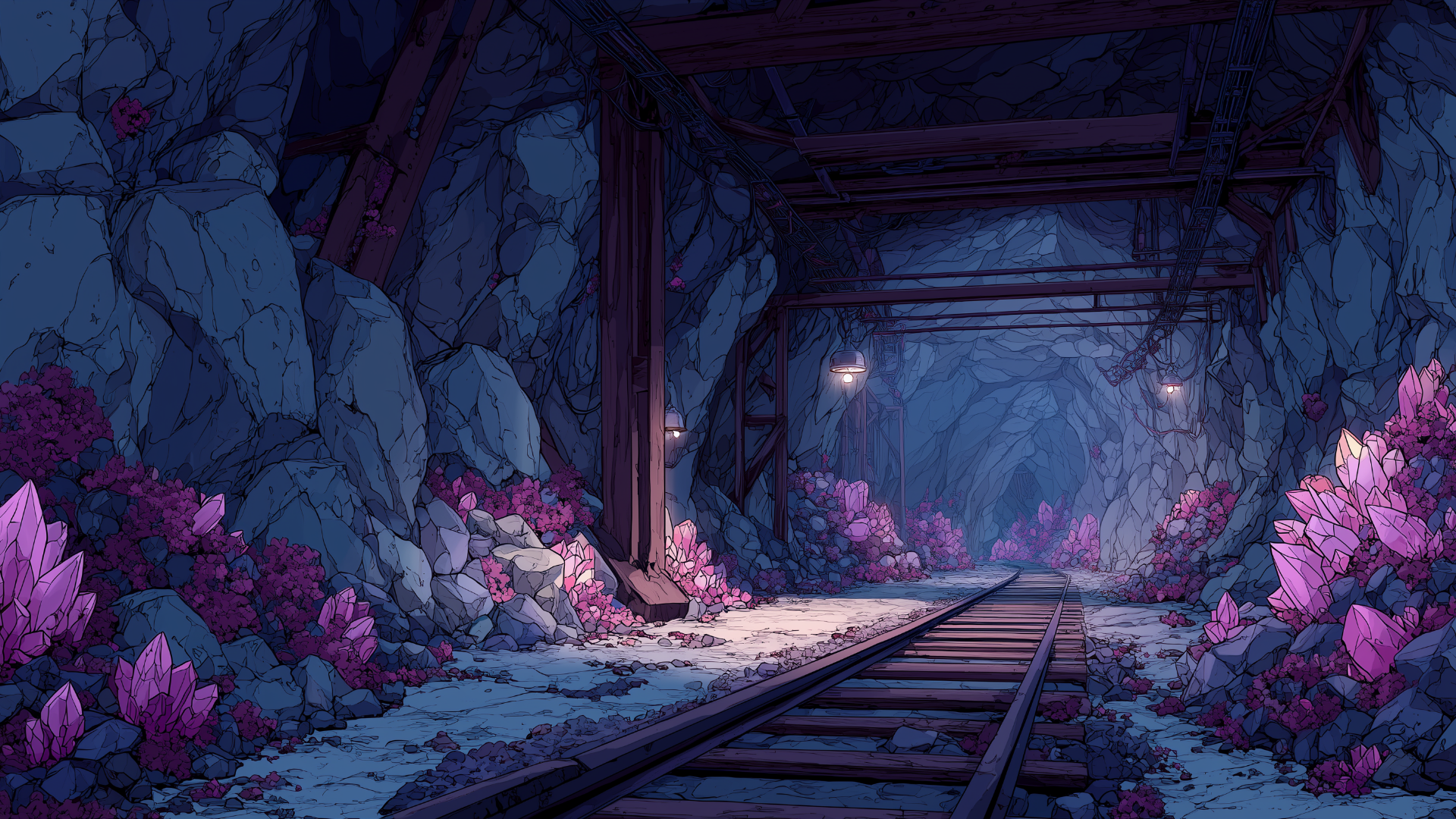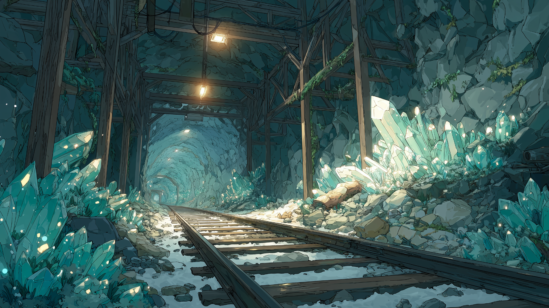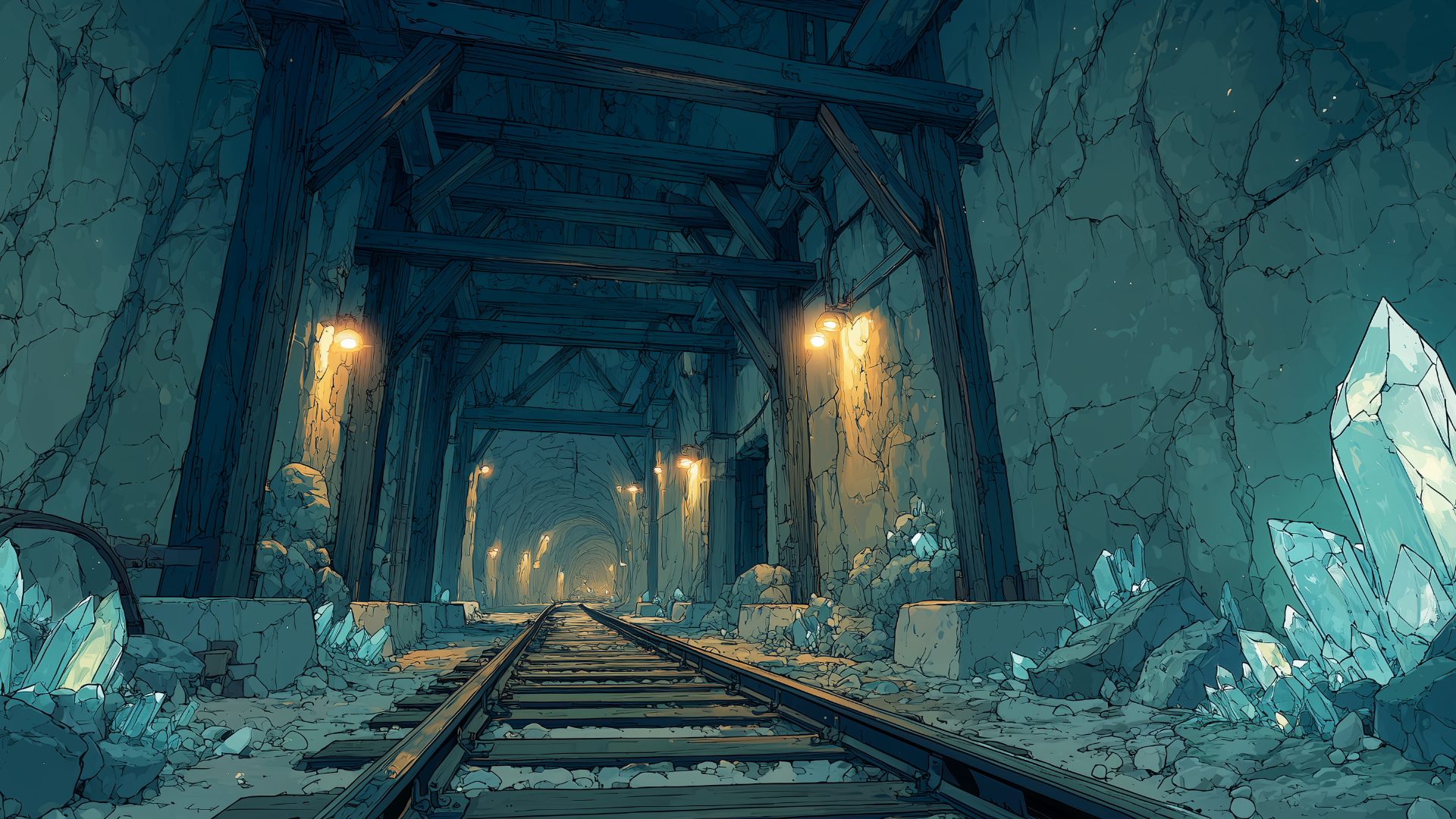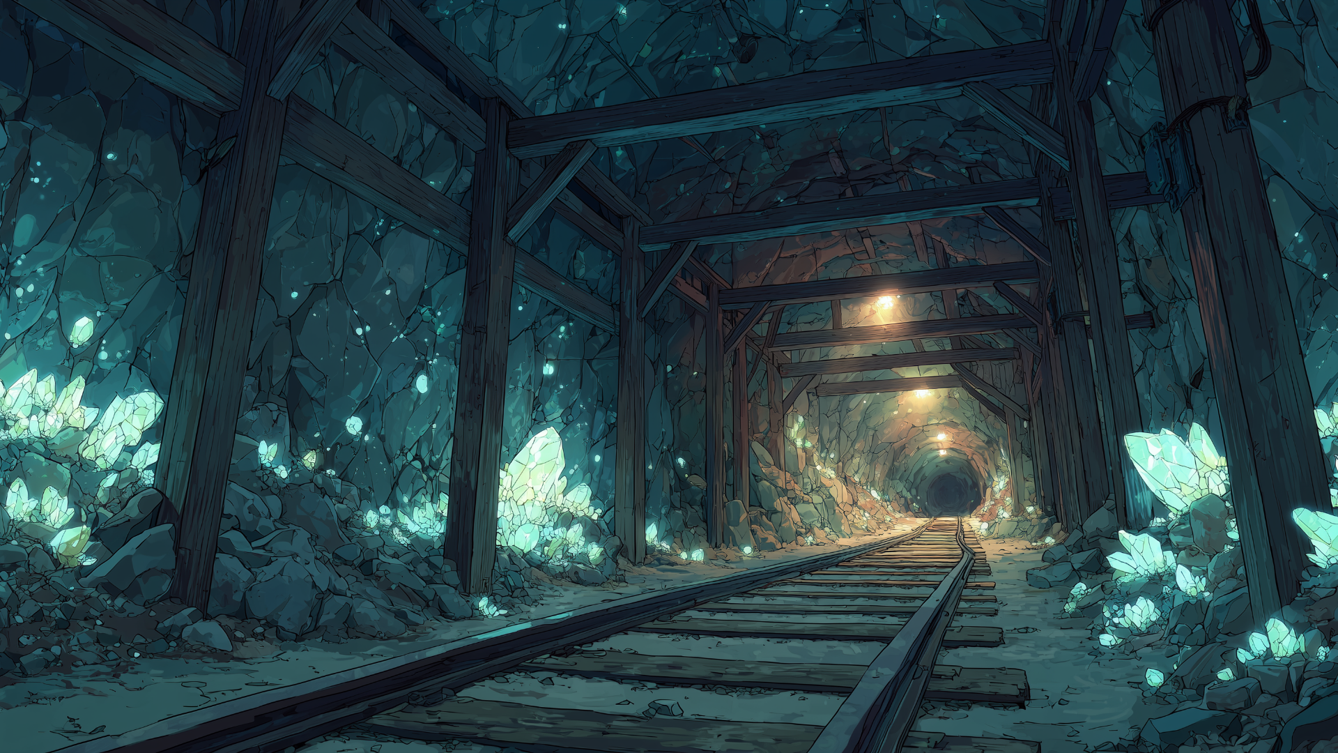 真っ直ぐに伸びる坑道には木製の梁が規則正しく並び、青白い魔石が静かに輝いている。灯火の光が結晶の冷たい色を和らげ、奥行きのある景色を作り出す。ファンタジーTRPGの探索導入やクエスト開始シーンに使えるフリー背景素材。