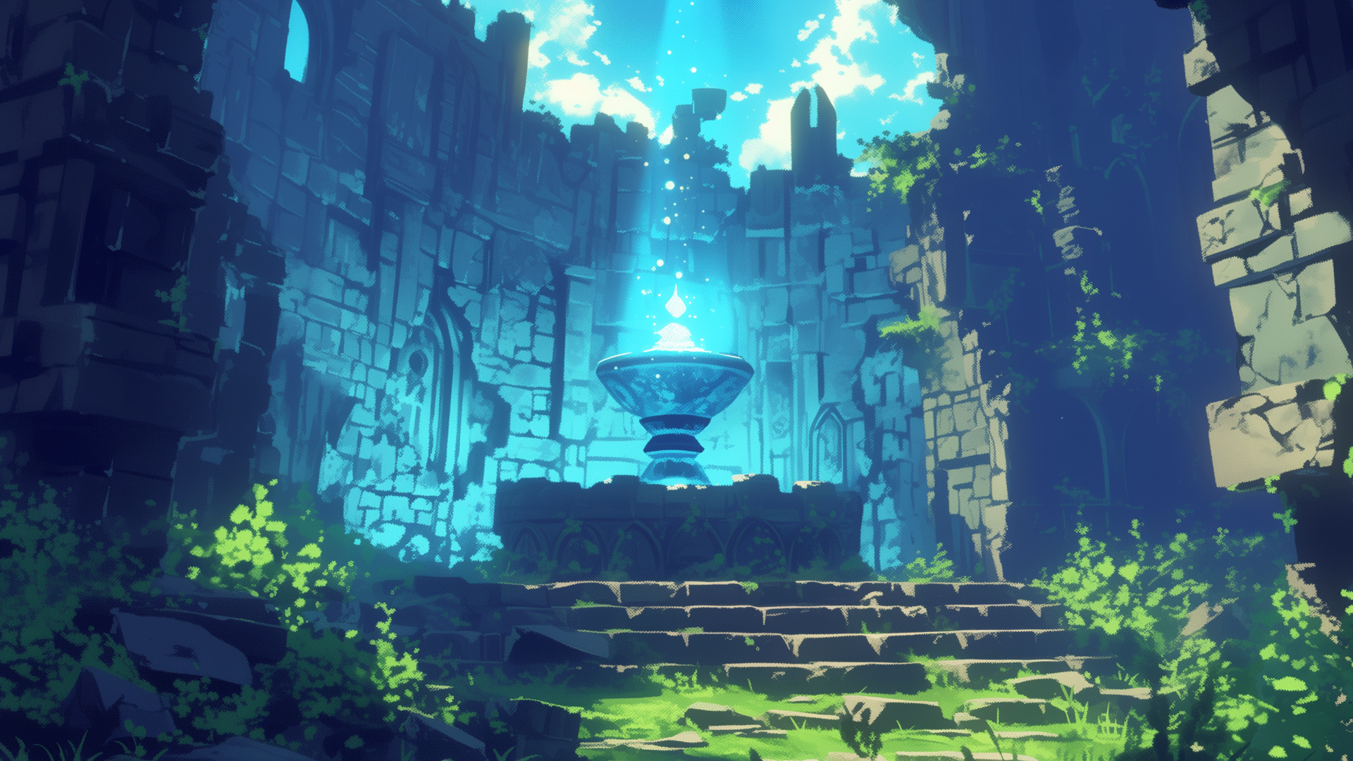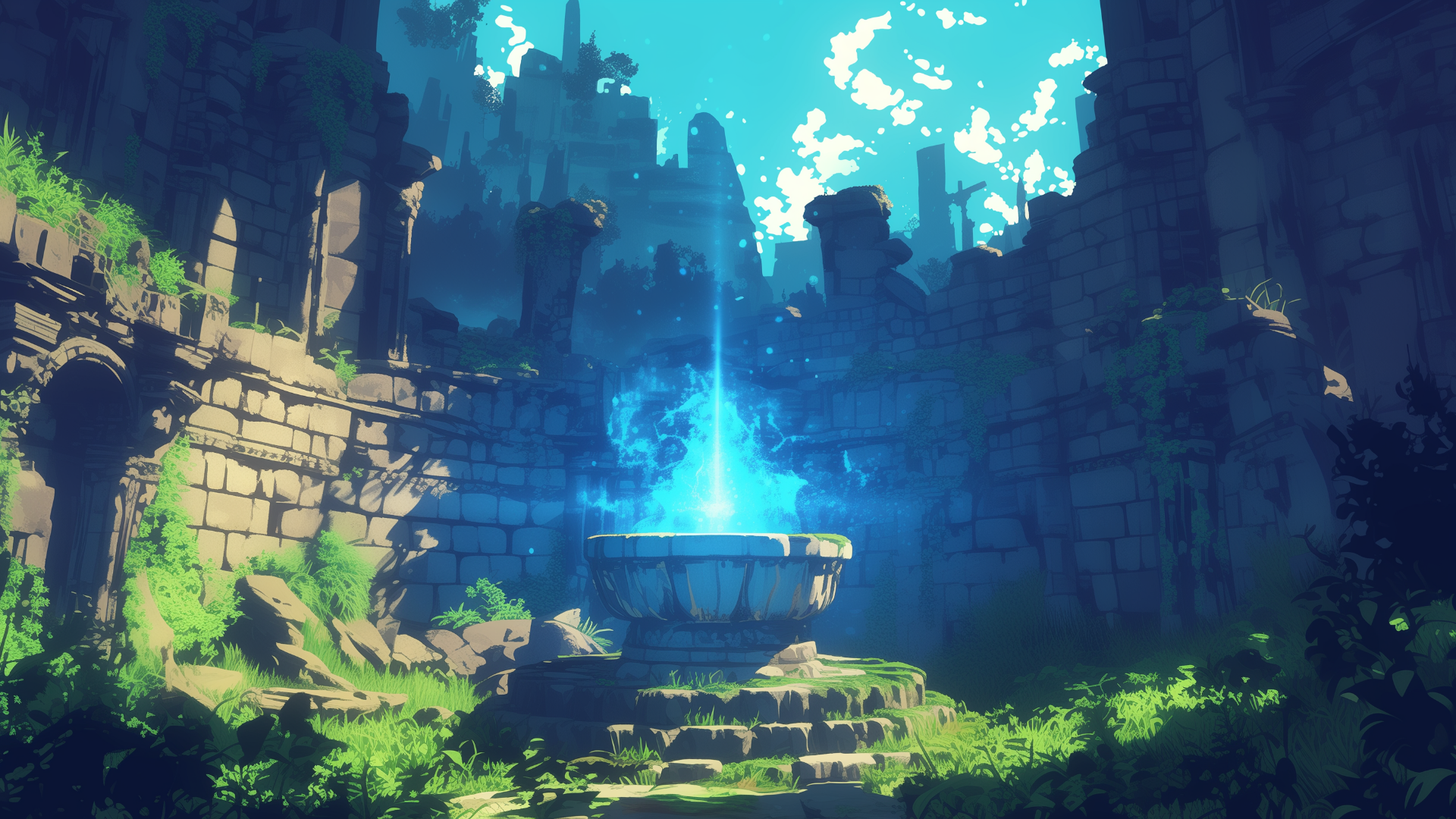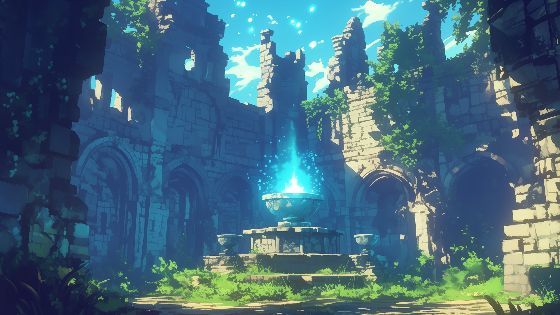 光をまとった魔力の泉のような台座が、広い石造りの中庭に佇んでいる。 ツタが絡まる壁やアーチが、失われた文明の面影を今に伝えている。 王家の儀式場や魔法研究所跡のシーン演出に適した背景素材。