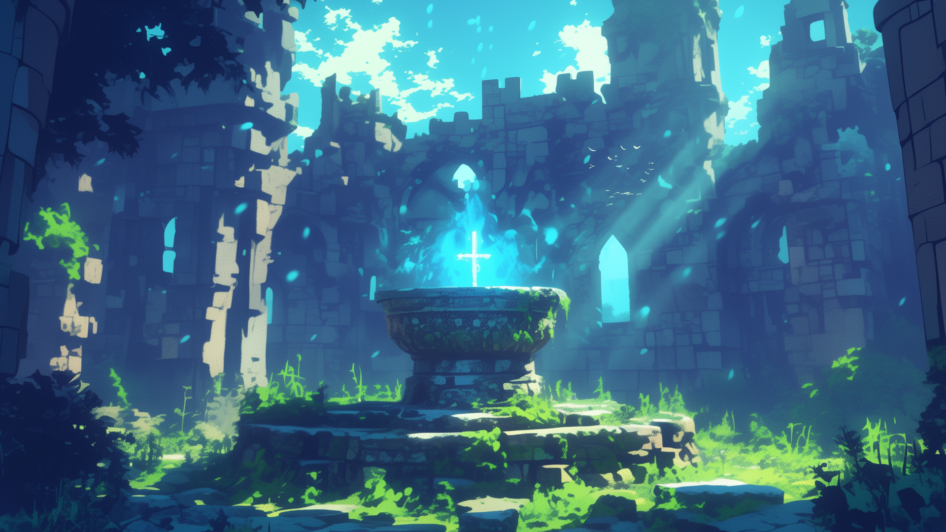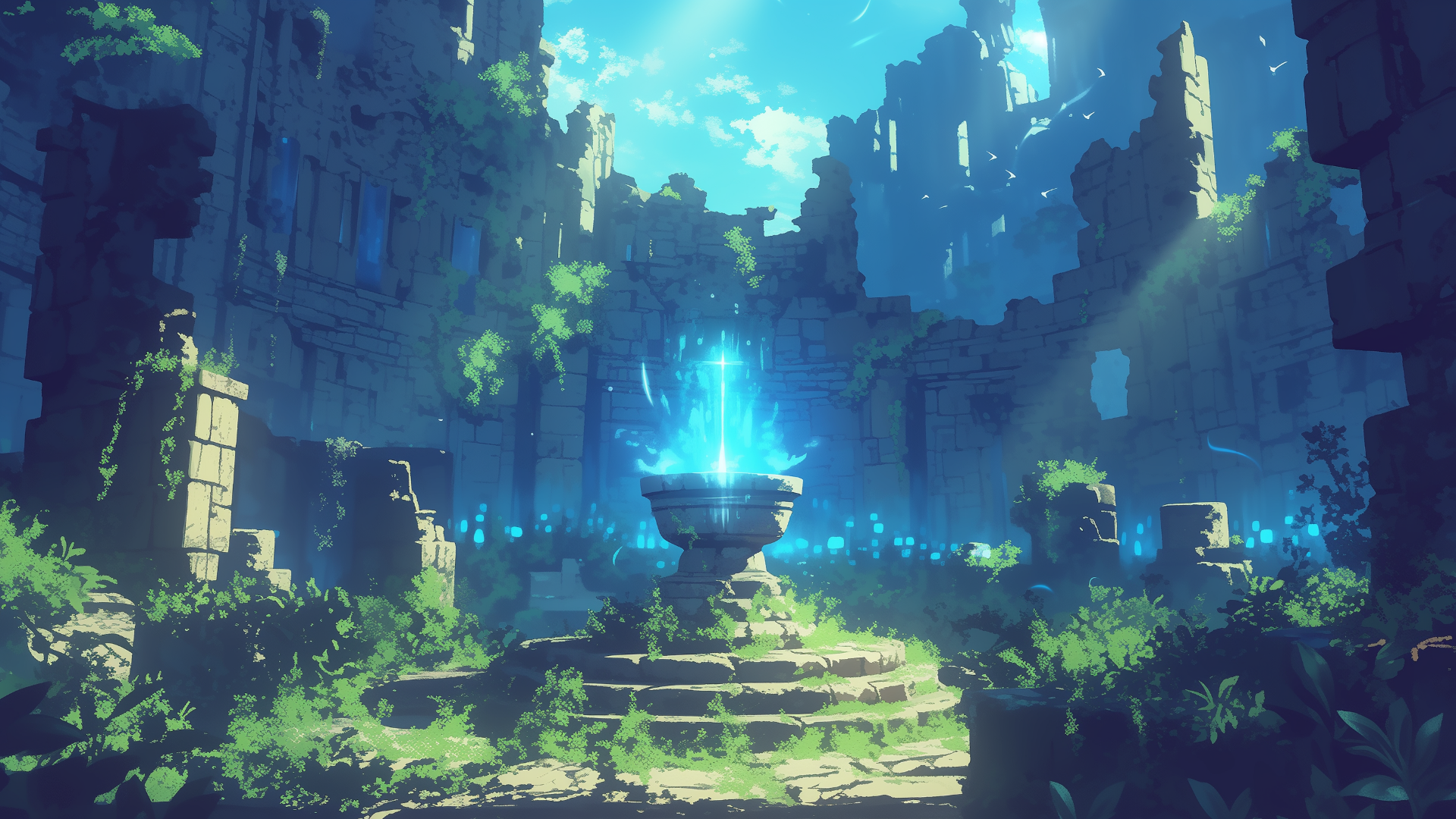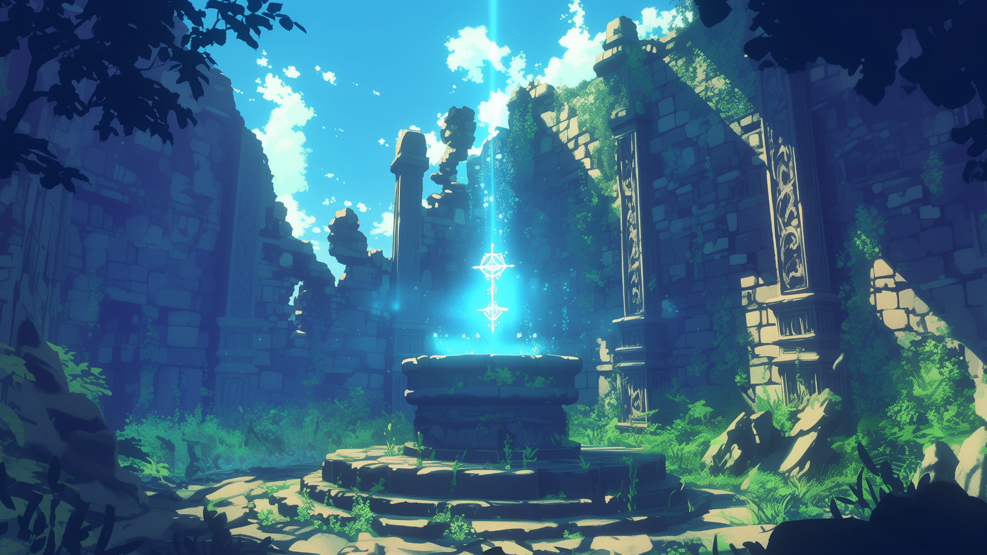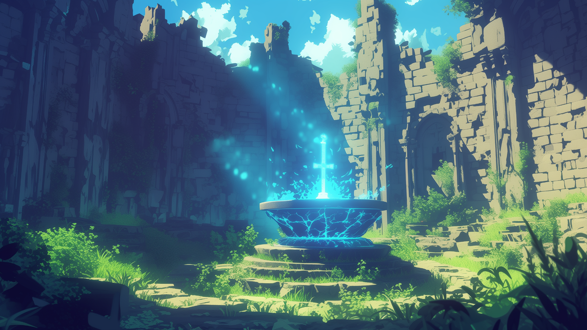 剣が突き立てられた台座から青い魔力が立ち昇り、光の粒が周囲に舞っている。 荒れた石造遺跡と自然の緑が共存する神秘的な光景が広がる。 聖剣の封印解除や選ばれし者の試練を表現するのに適した背景画像。