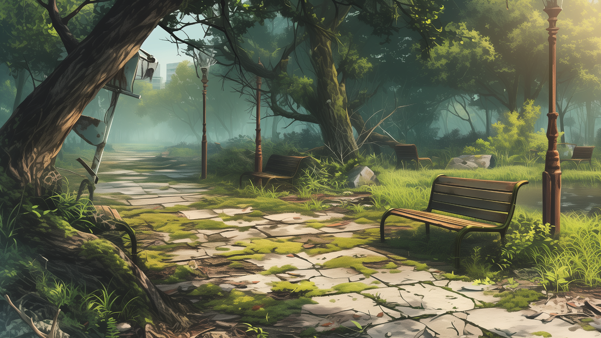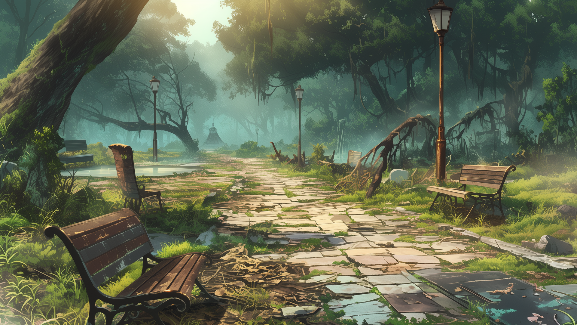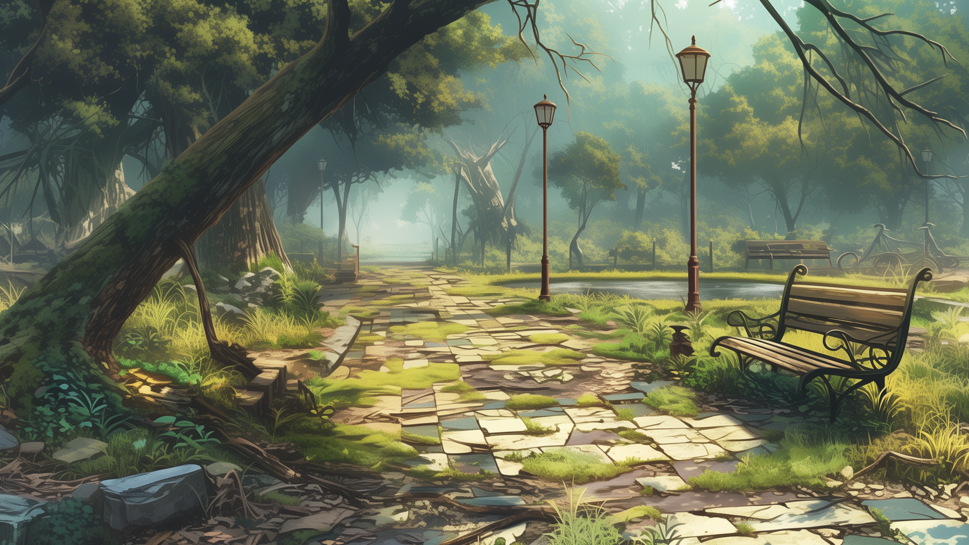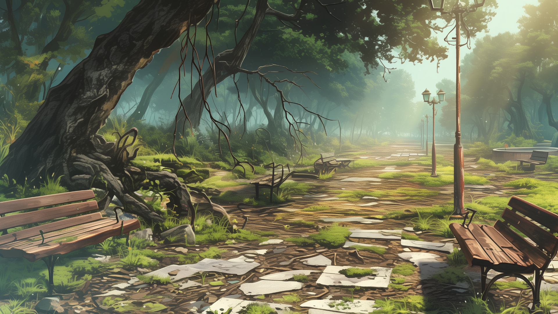 崩壊, 荒廃, 小道, 街灯, ベンチ