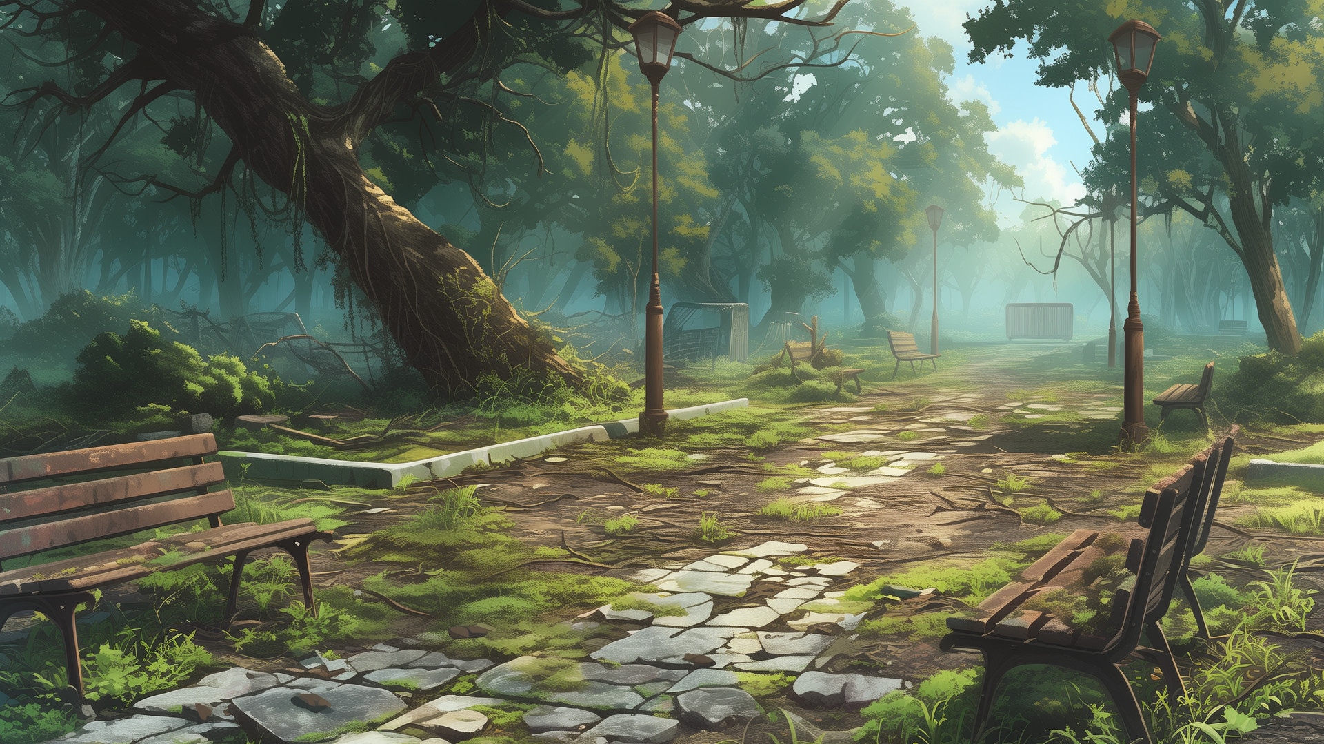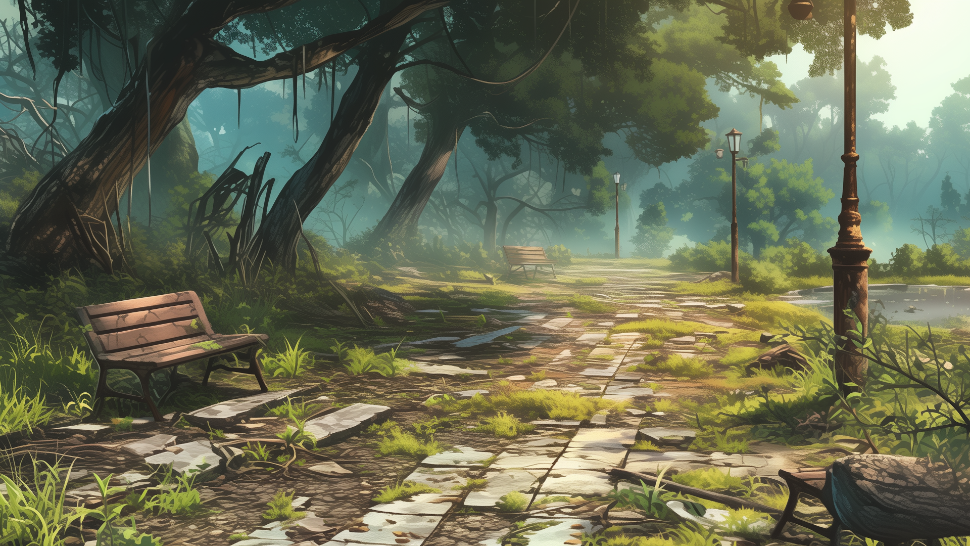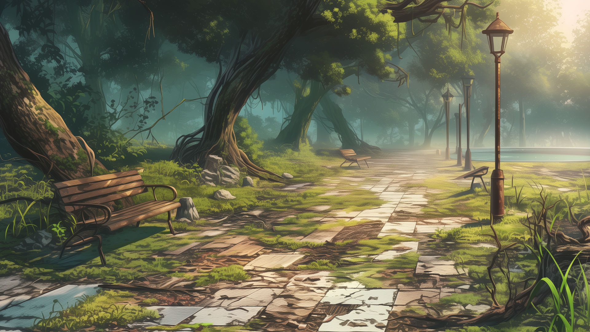 荒れ果てた自然が広がる、静まり返った公園の道のフリー背景素材です。