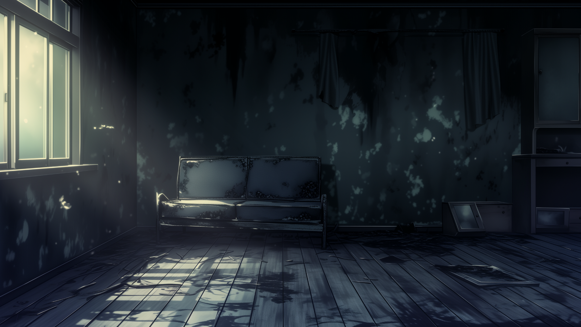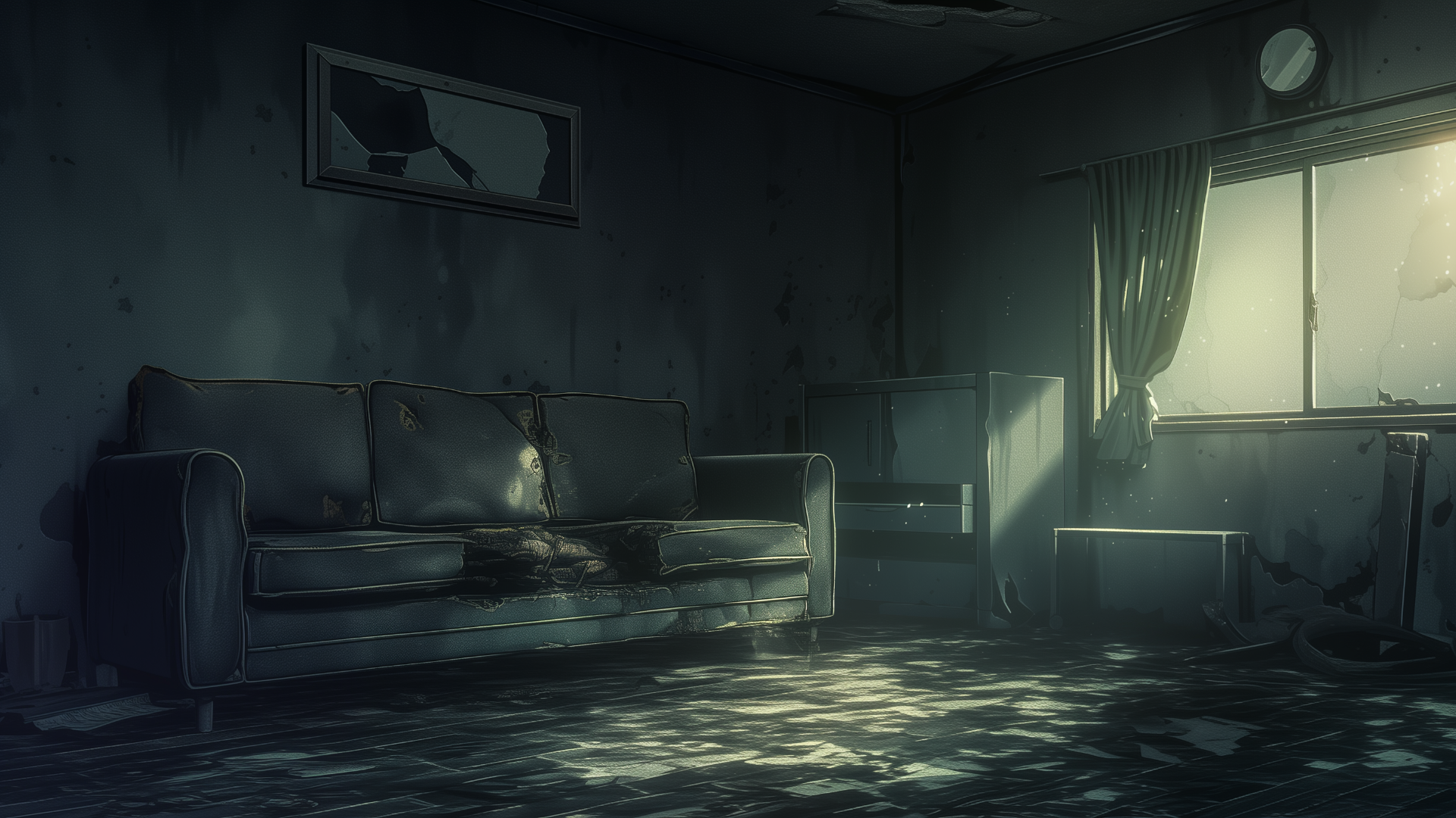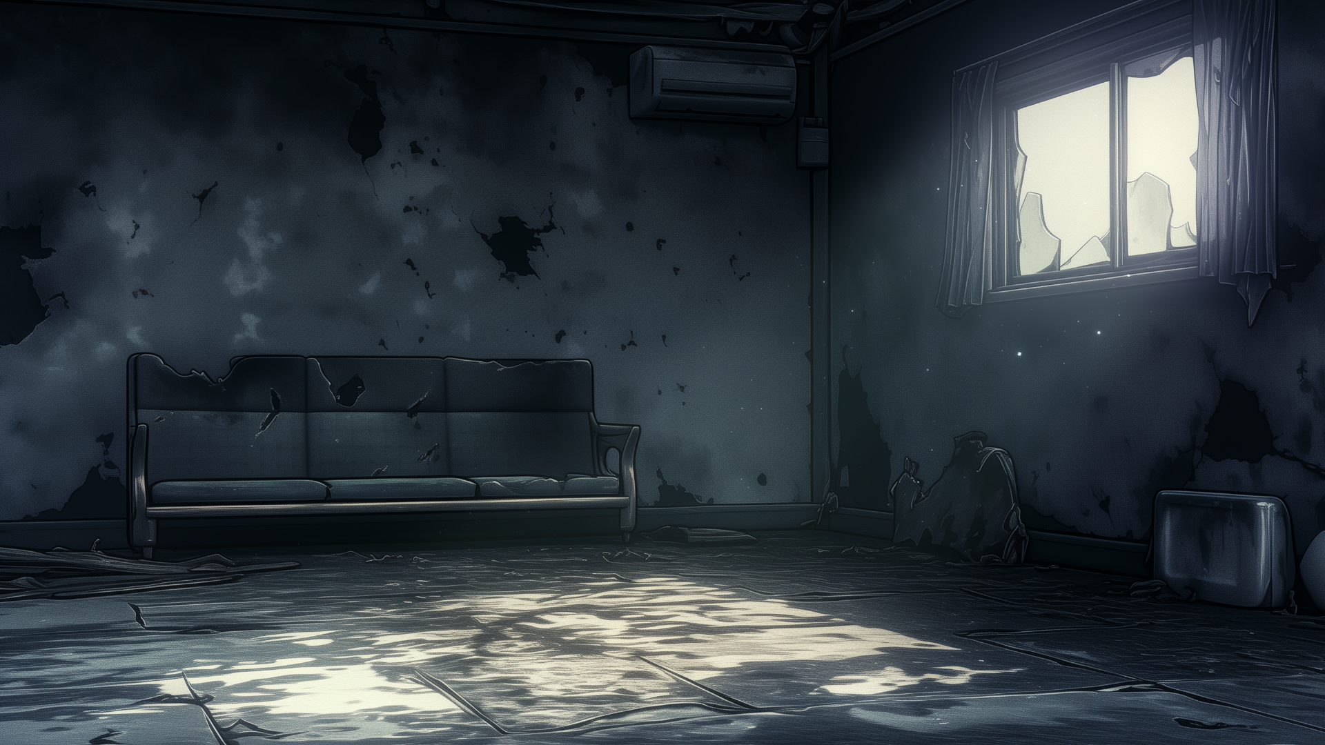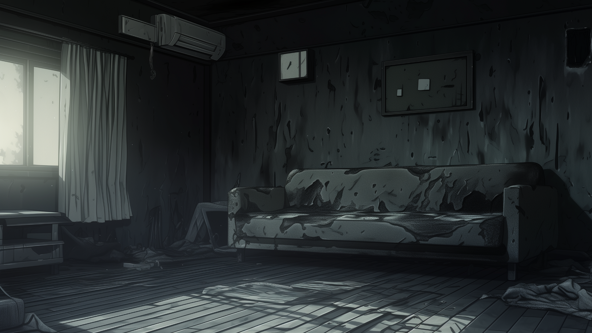 かつて誰かが暮らしていたはずの部屋は、今や荒廃し、黒ずんだ壁と崩れた床が不安を掻き立てる。寂れたソファが残るこの空間は、ホラーやミステリーTRPGのシーン演出に役立つフリー背景素材。