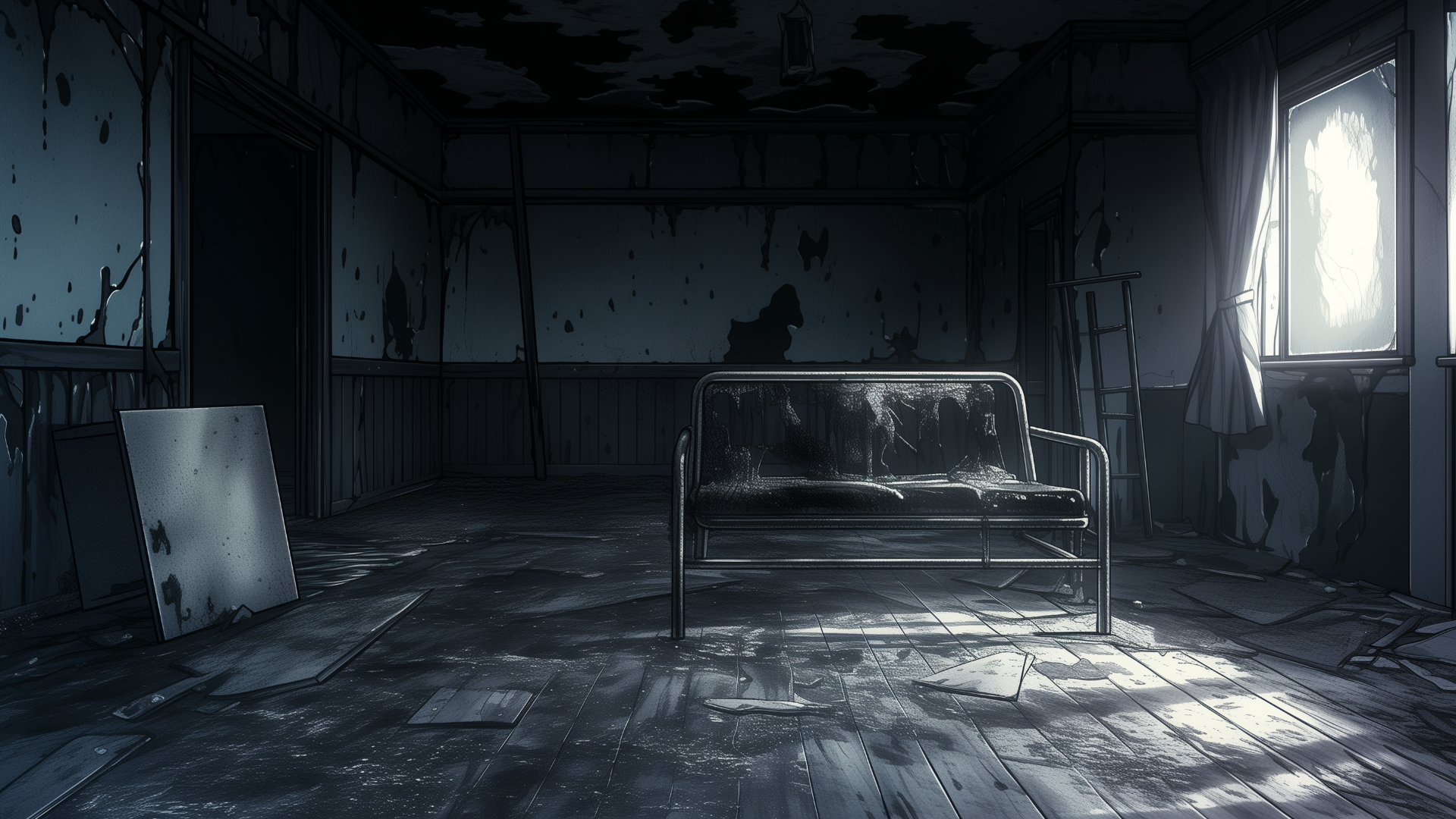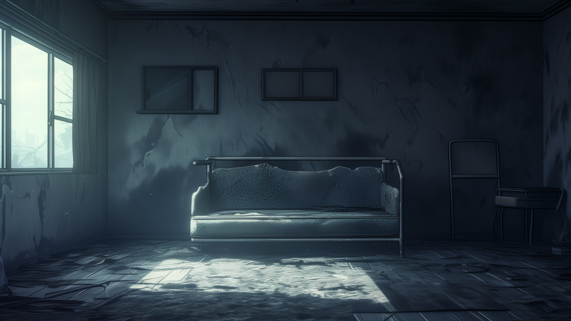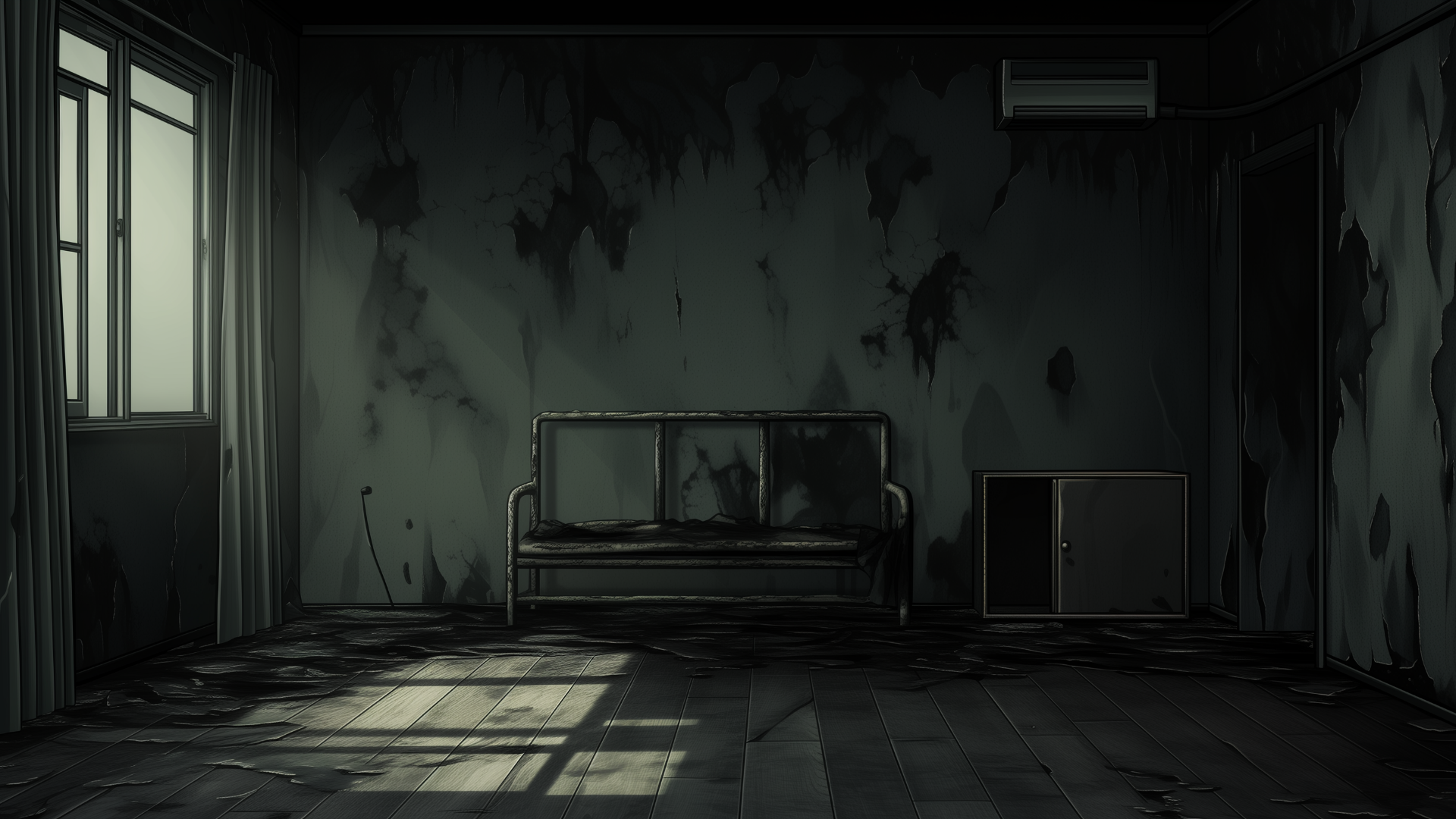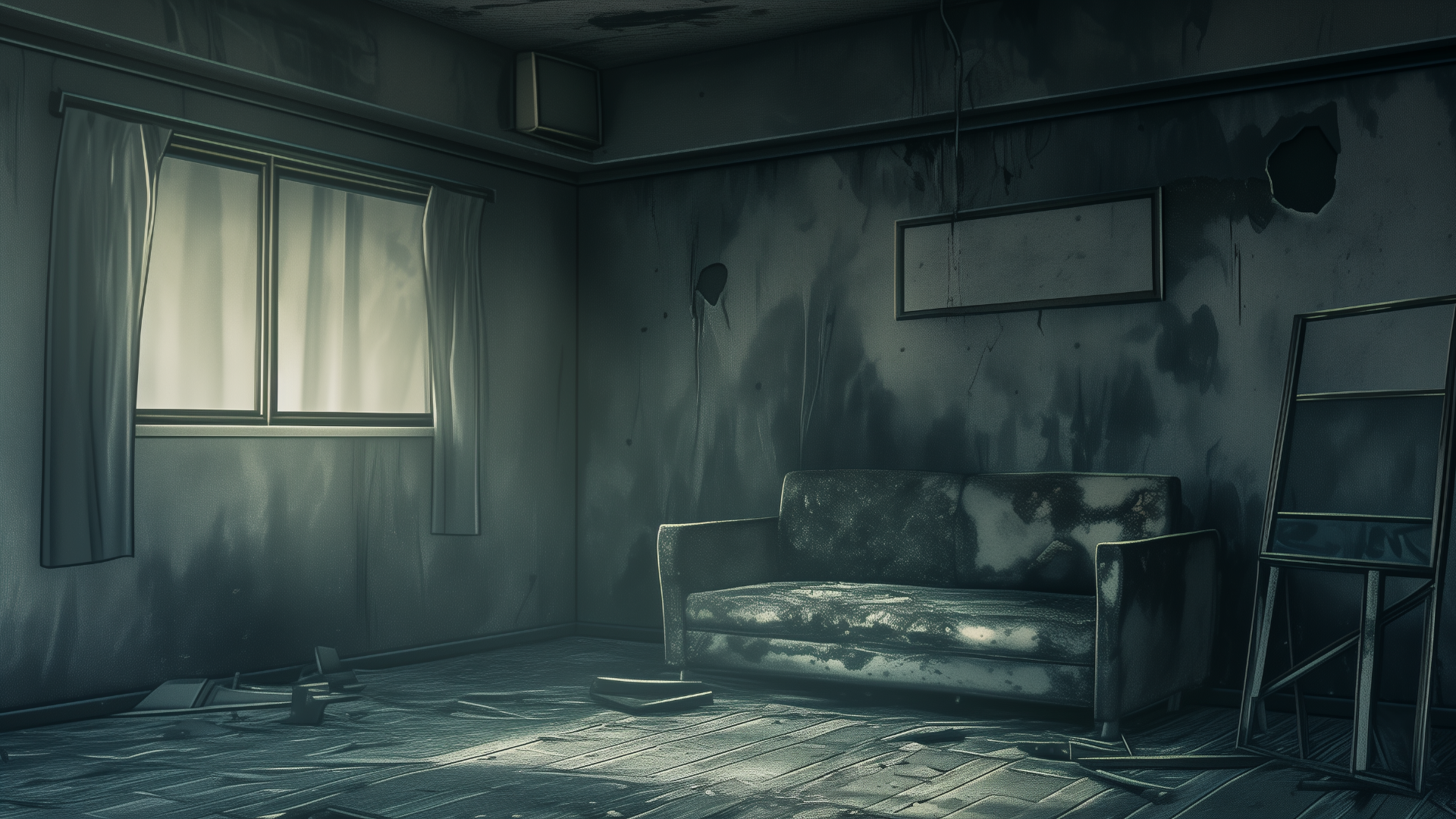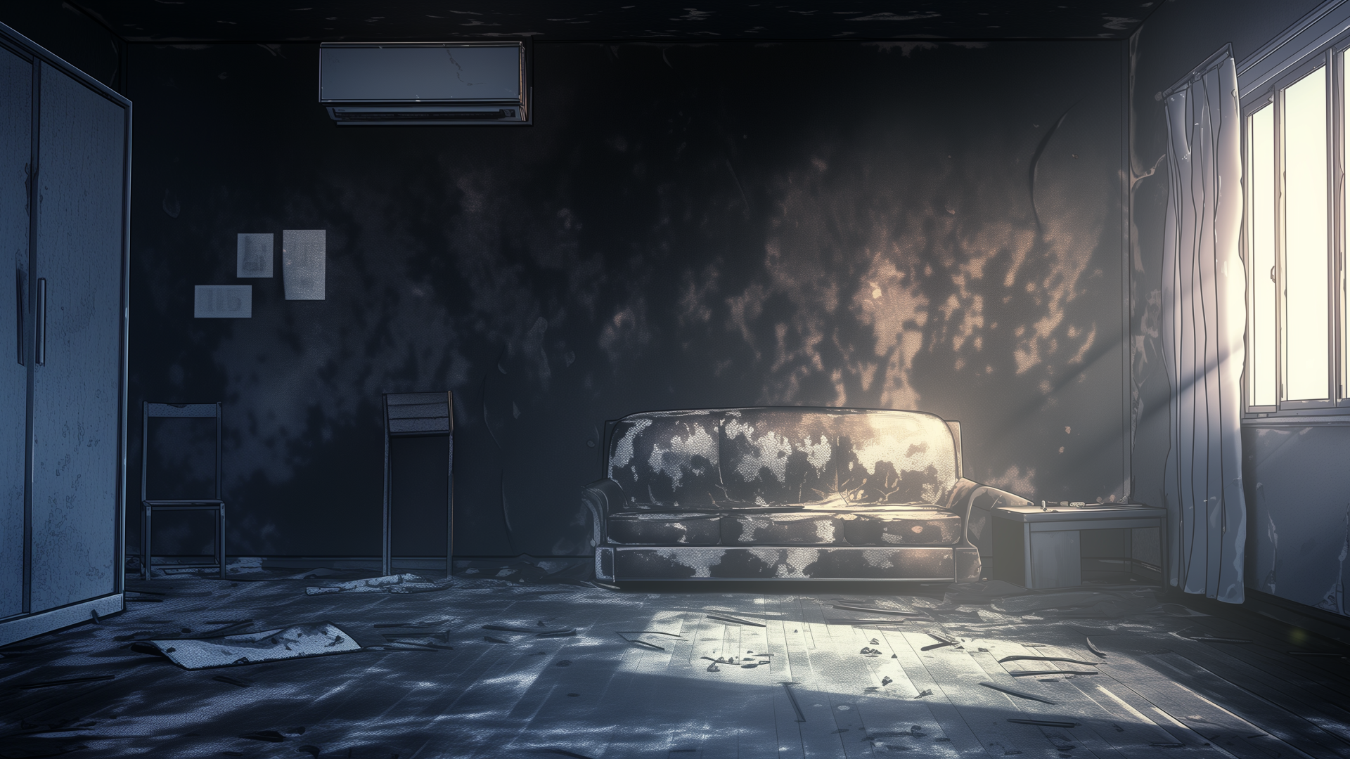 かつて誰かが暮らしていたはずの部屋は、今や荒廃し、黒ずんだ壁と崩れた床が不安を掻き立てる。寂れたソファが残るこの空間は、ホラーやミステリーTRPGのシーン演出に役立つフリー背景素材。