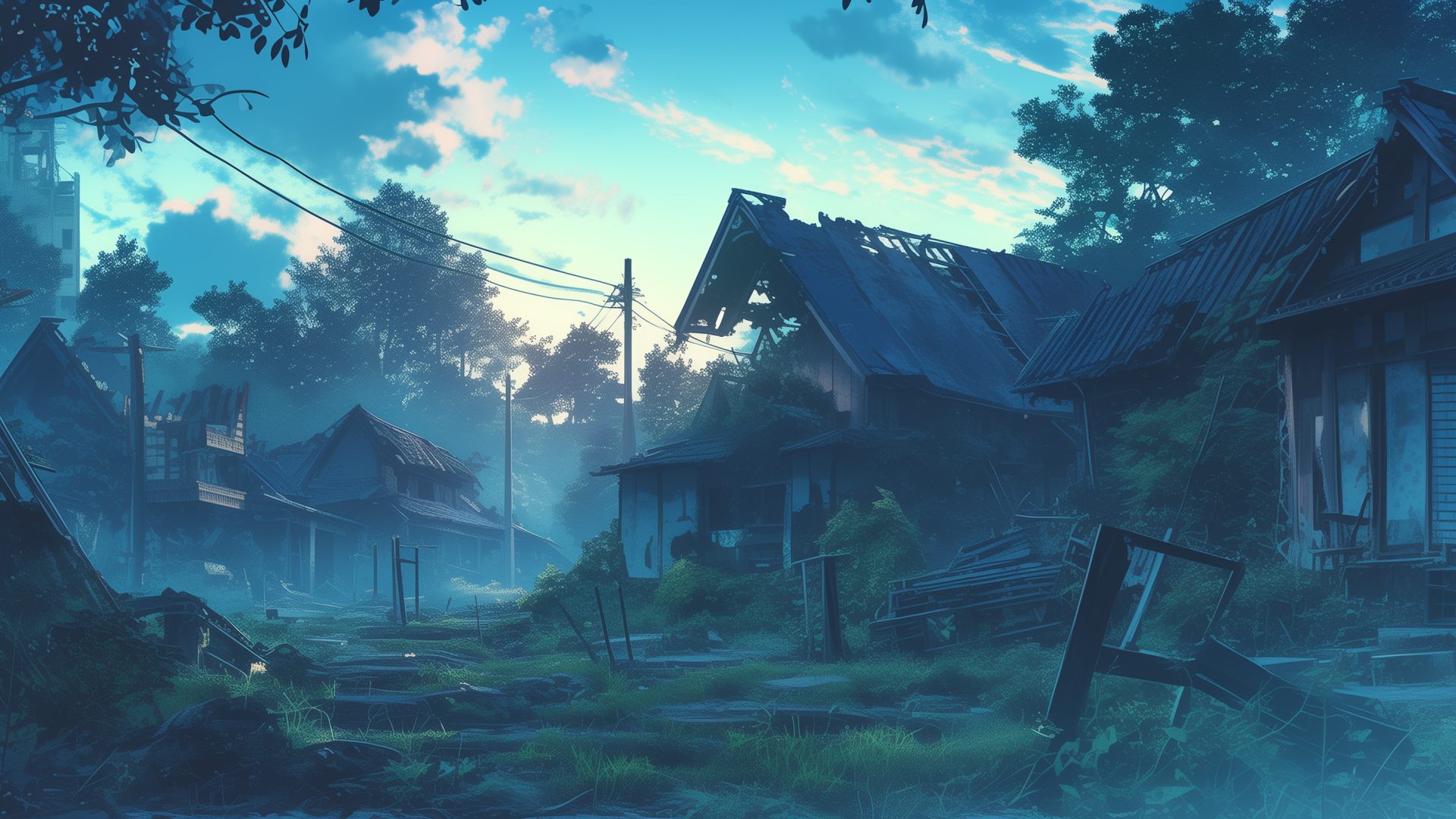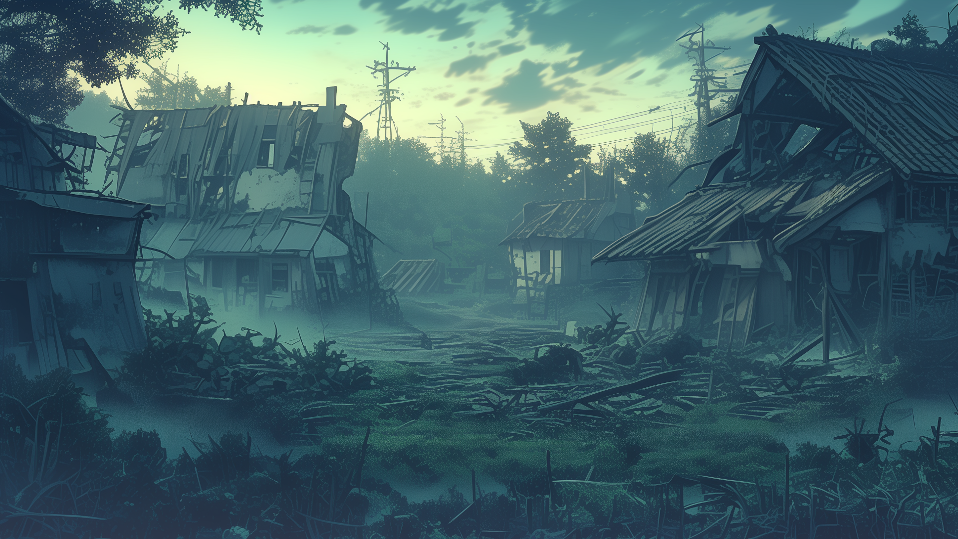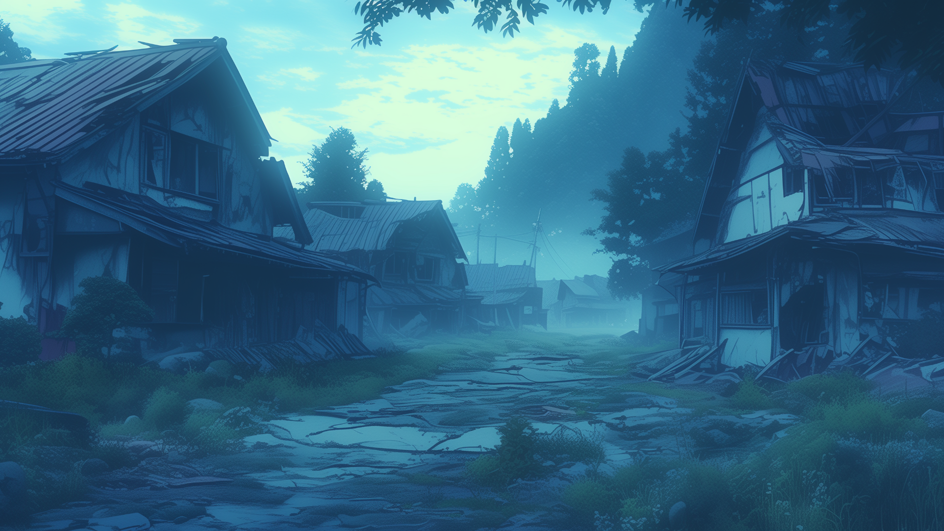 朝霧が立ち込める静かな廃村のフリー背景素材です。