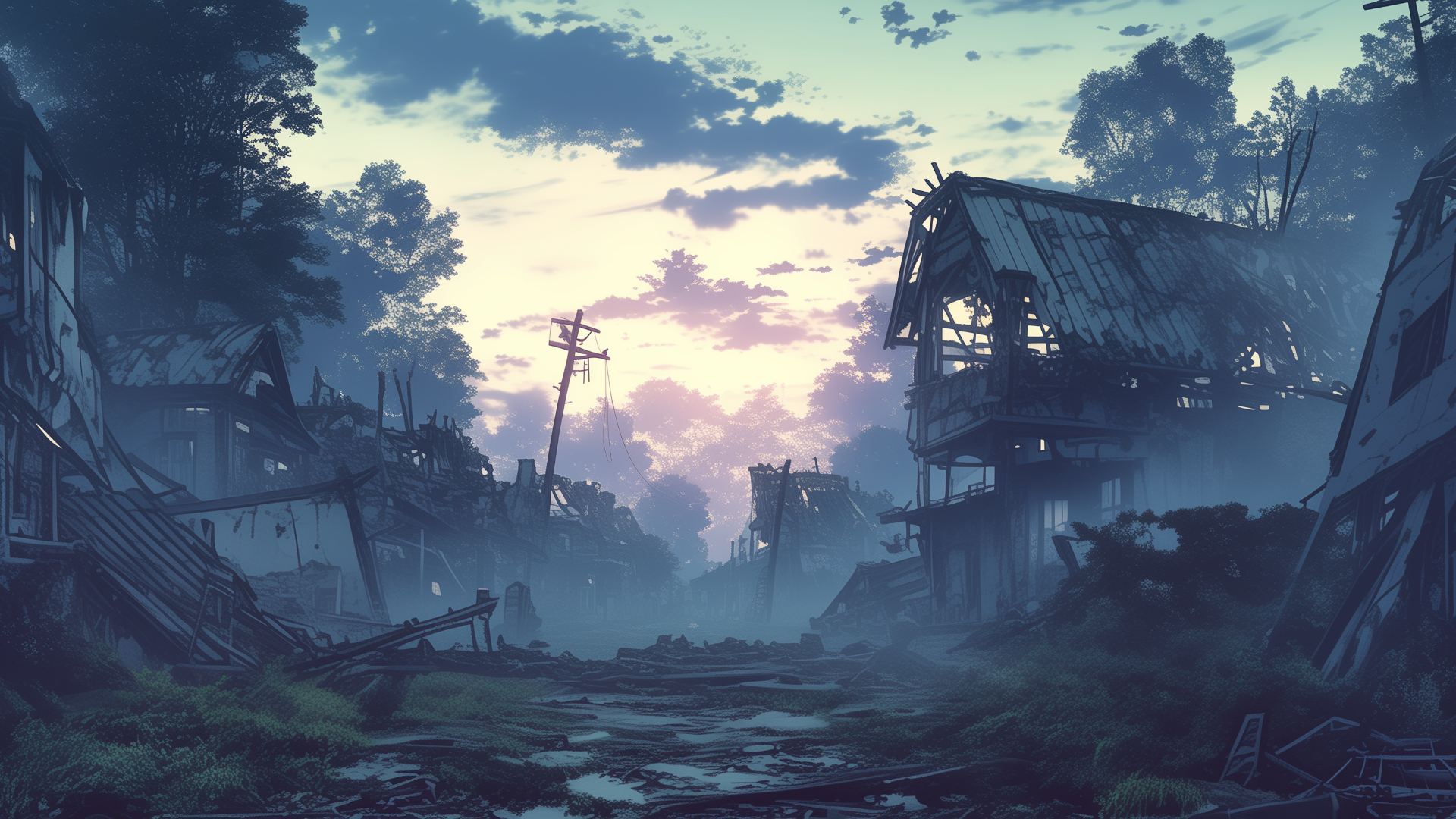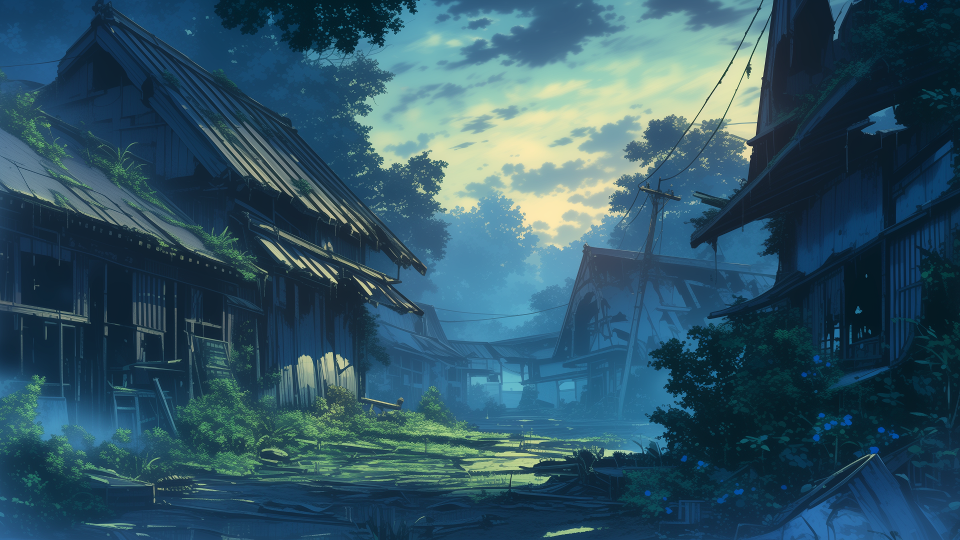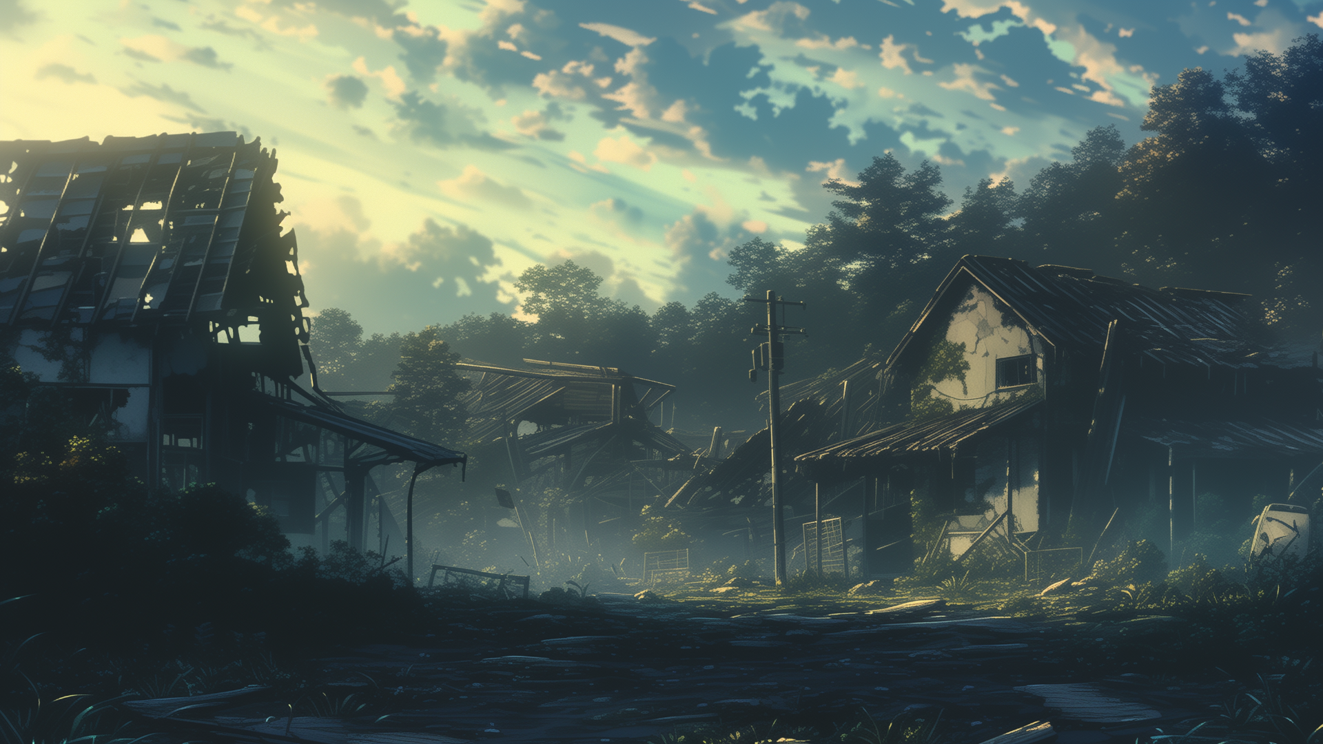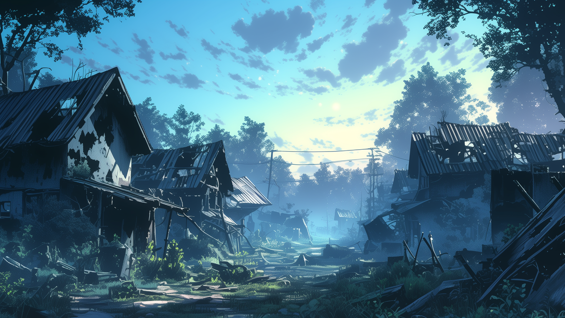 朝霧が立ち込める静かな廃村のフリー背景素材です。