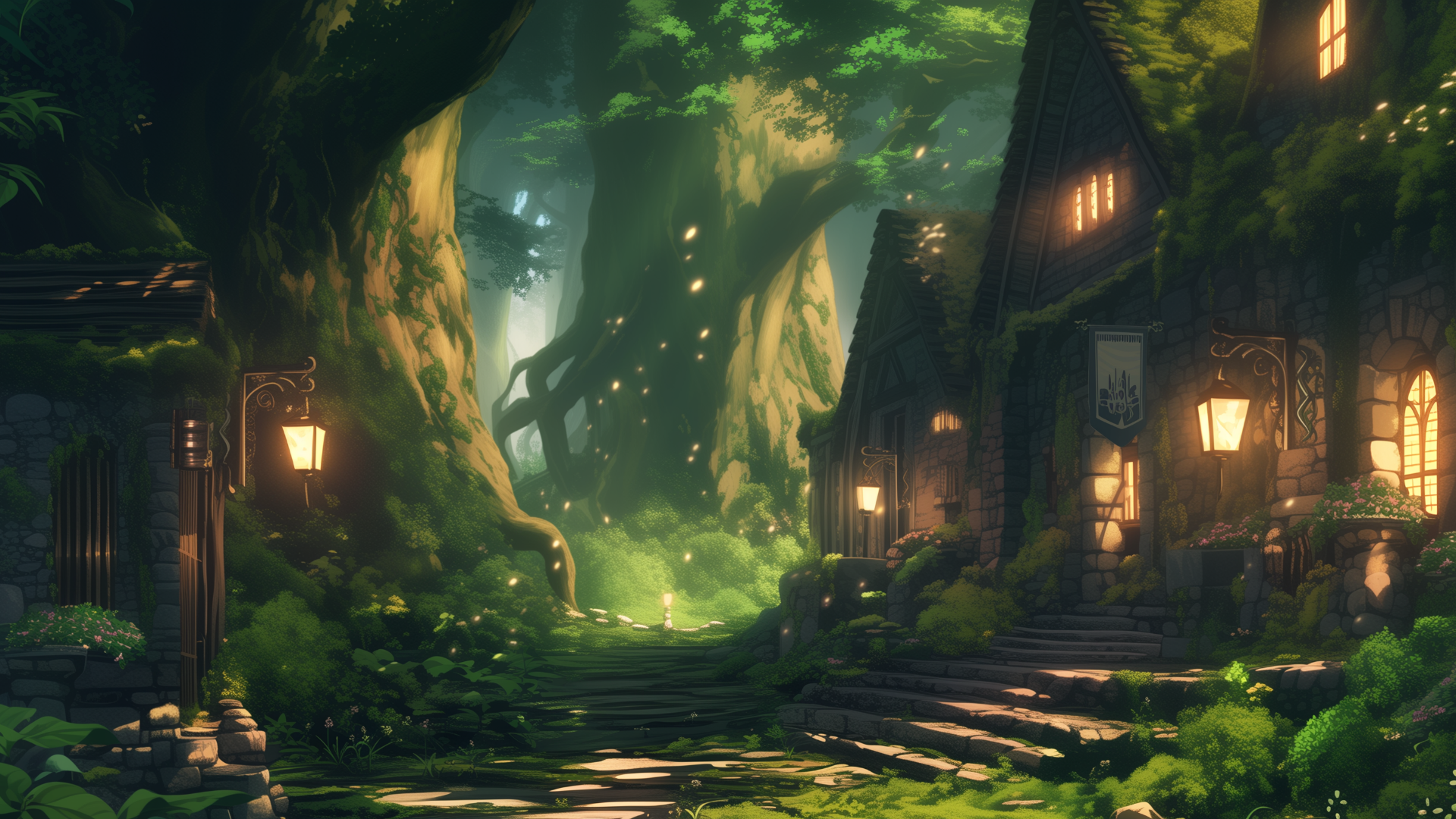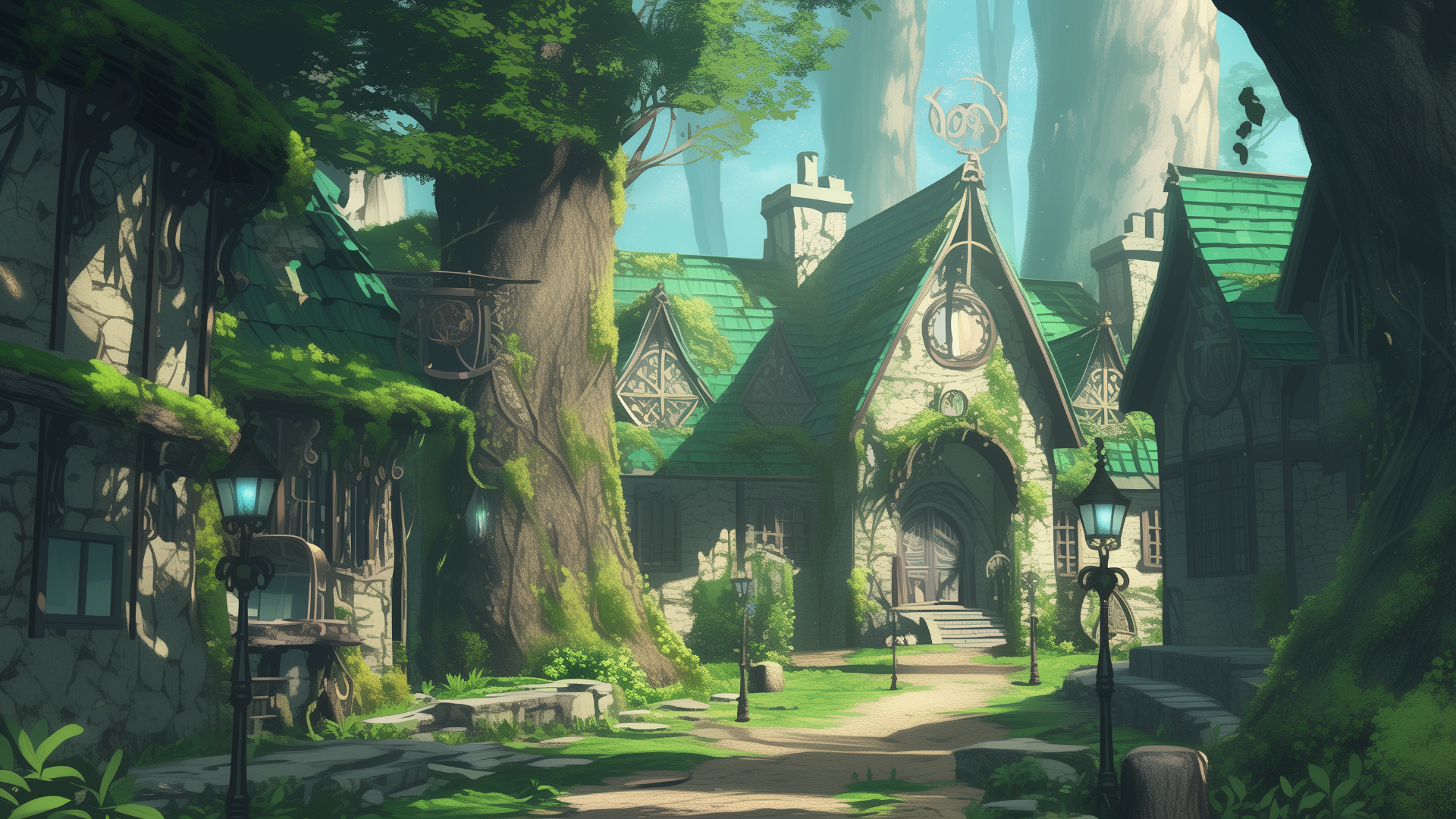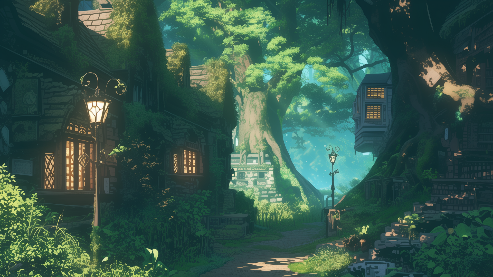 forest village, stone house, street lamp, giant tree, light