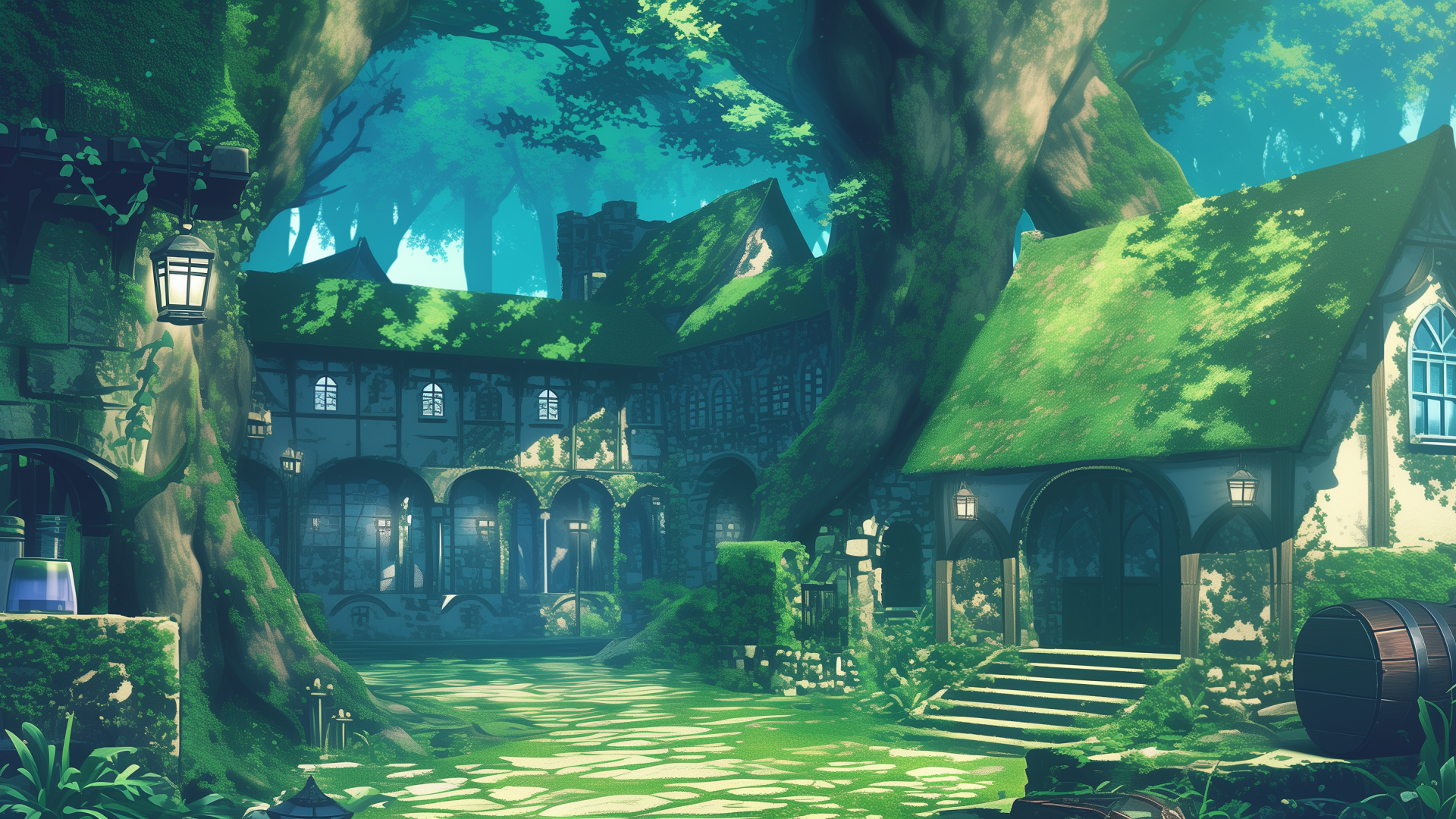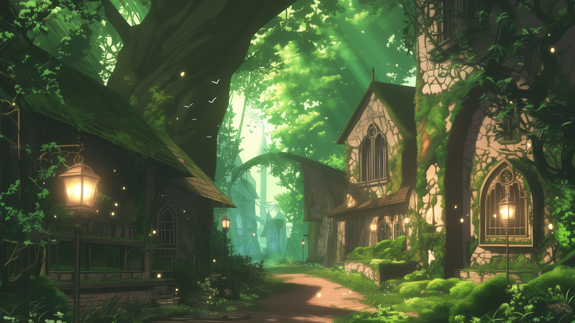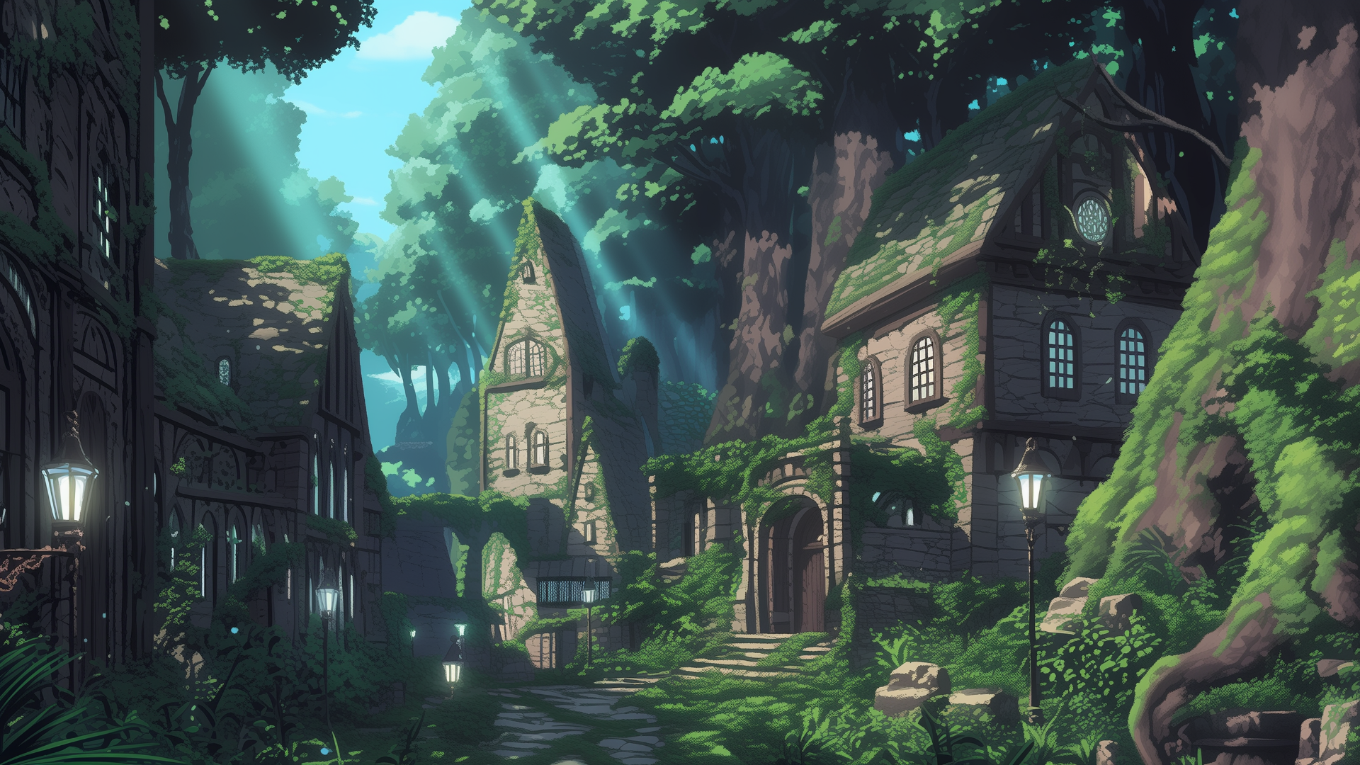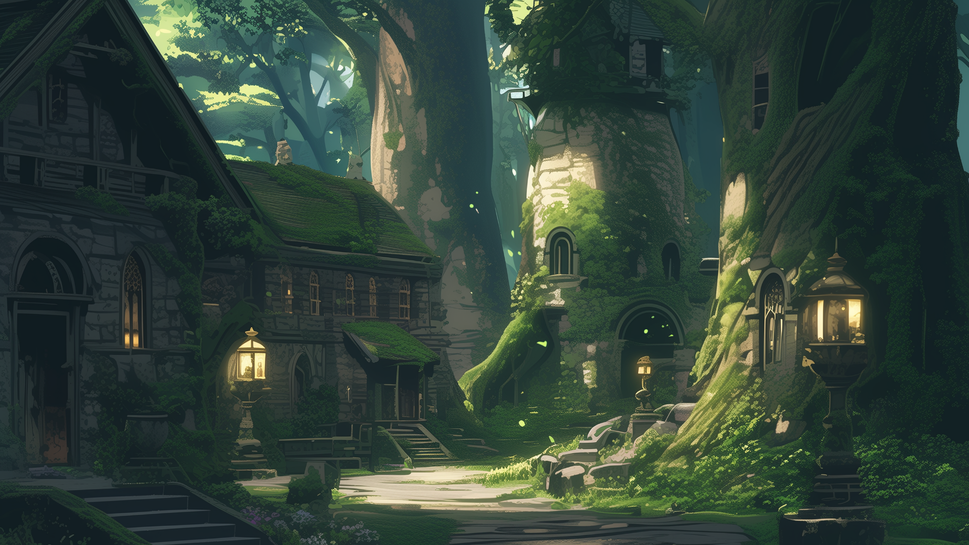 forest village, stone house, street lamp, giant tree, light